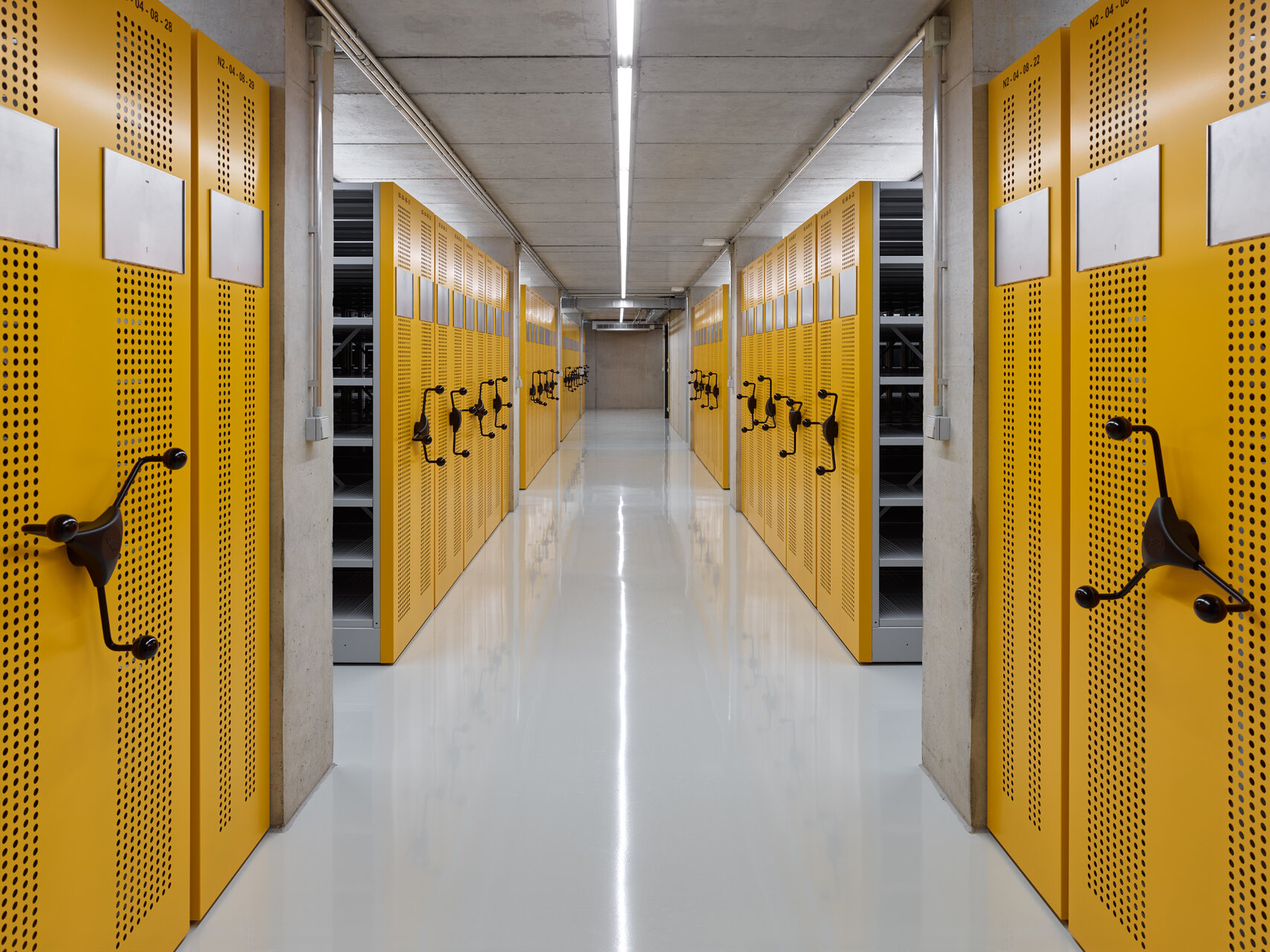 Lamellen aus Betonfertigteilen an der Fassade assoziieren das Lagern, Schichten und Stapeln im Archiv. Im Spiel aus Licht und Schatten tritt das Gebäudevolumen hinter die plastische Oberfläche. Die reduzierte Gestaltung sowie der Einsatz robuster Materialien und regionaler Baustoffe sind wesentliche Bestandteile der nachhaltig ausgerichteten Architektur. (Text: Architekt)