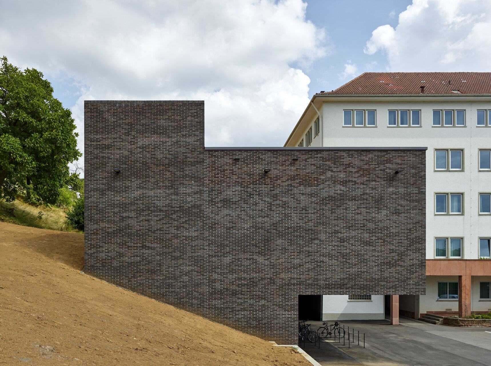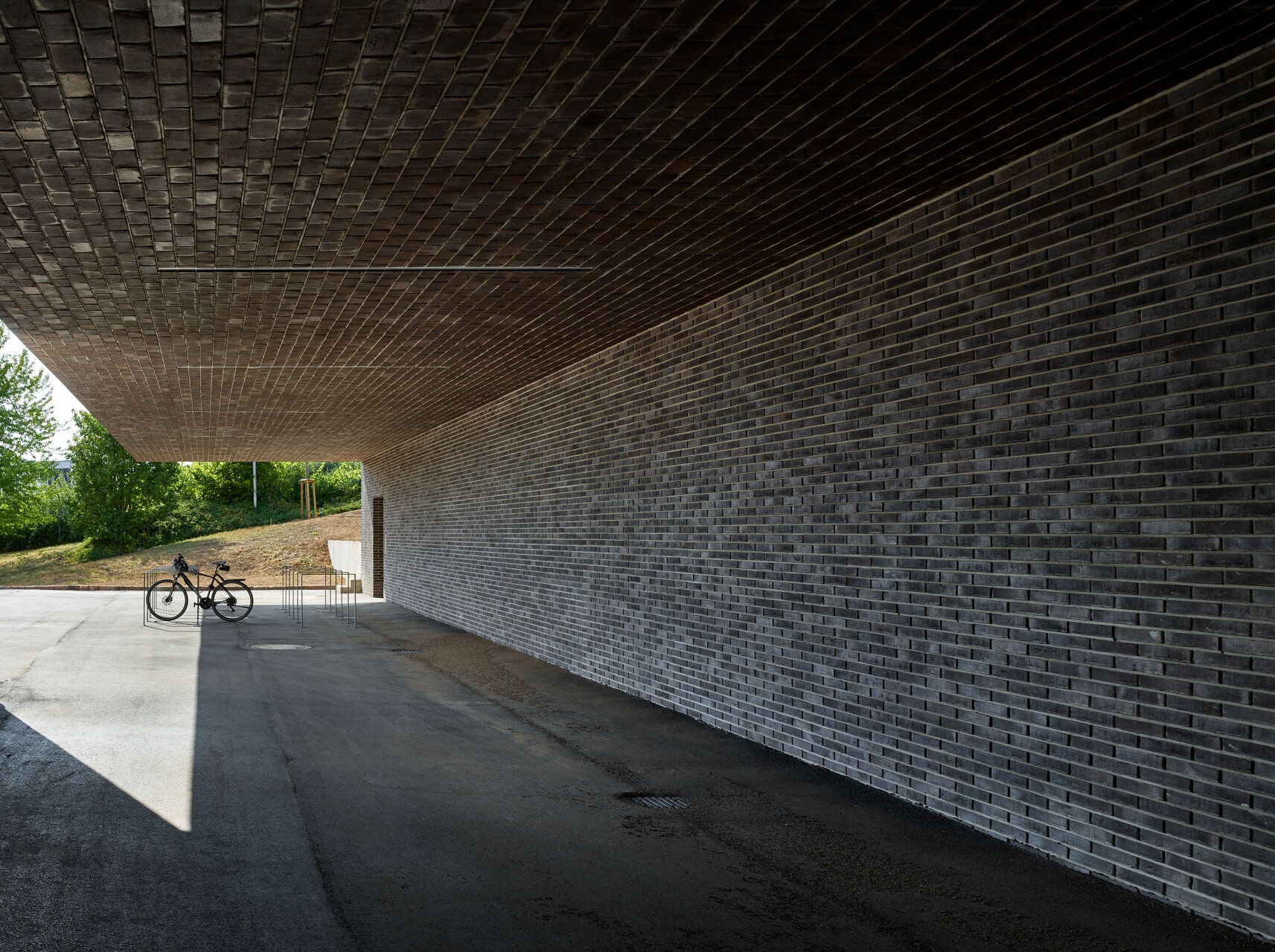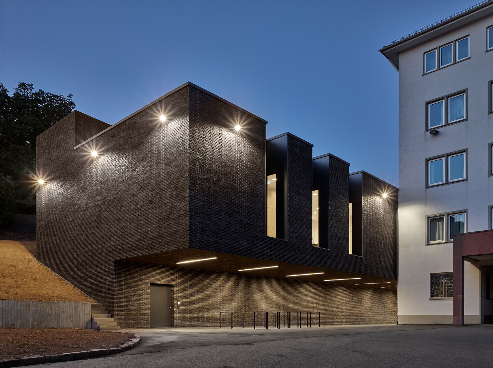 An der Nordseite schiebt sich das Sockelgeschoss in den Hang und bildet die Basis für das nach Süden zum Eingangshof des Hauptgebäudes stark auskragende Obergeschoss. Die Anordnung der beiden Baukörper ersetzt gemeinsam mit der Oberlichtkonstruktion und der hohen geschlossenen Nordfassade umfangreiche Sicherungsmaßnahmen. Drei nicht direkt einsehbare Einschnitte im Volumen belichten den Innenraum zusätzlich. Das Sockelgeschoss nimmt die technische Versorgung für den Dauerbetrieb des energieeffizienten Gebäudes mit zweischaliger Außenwandkonstruktion auf. (Text: Architekt, bearbeitet)
