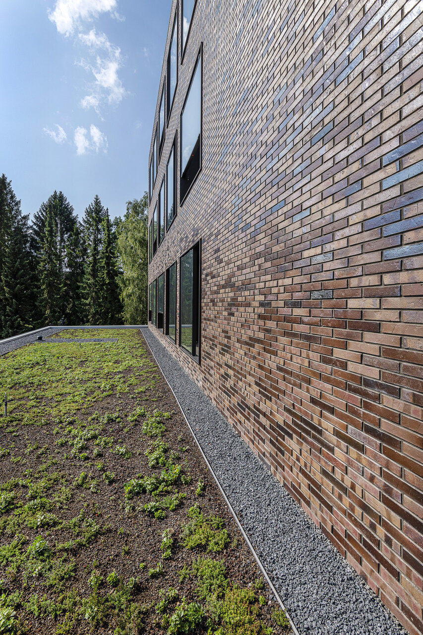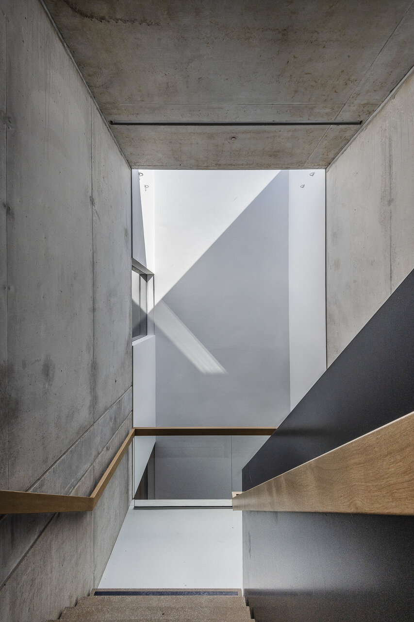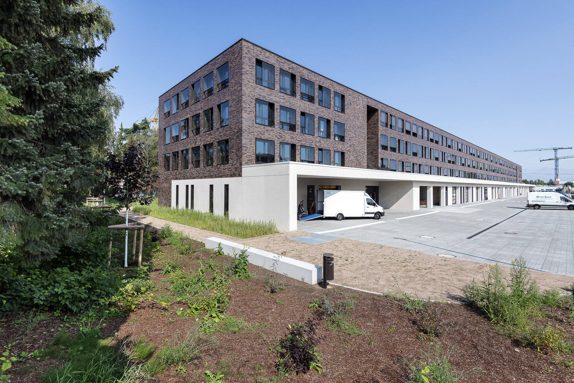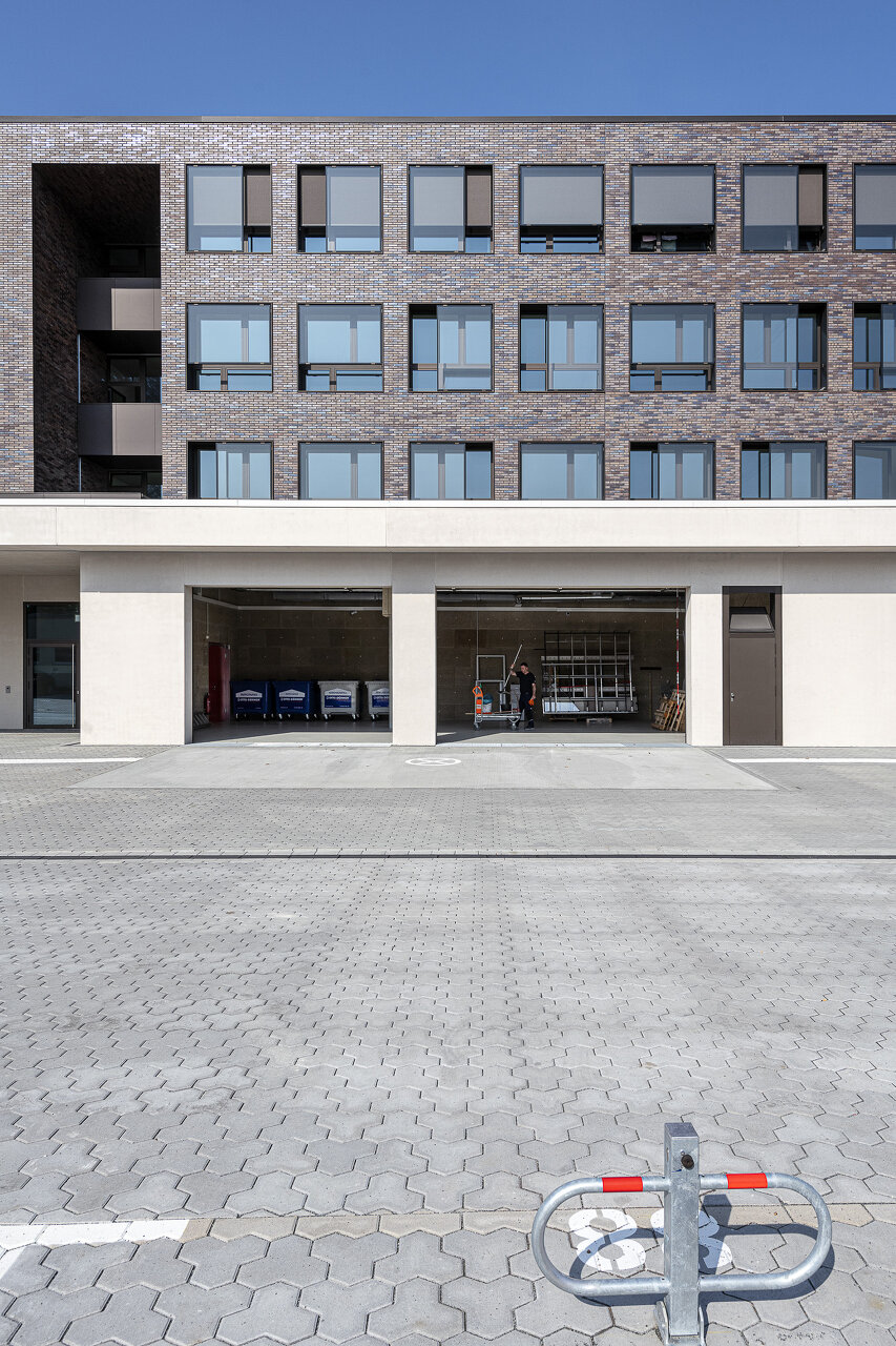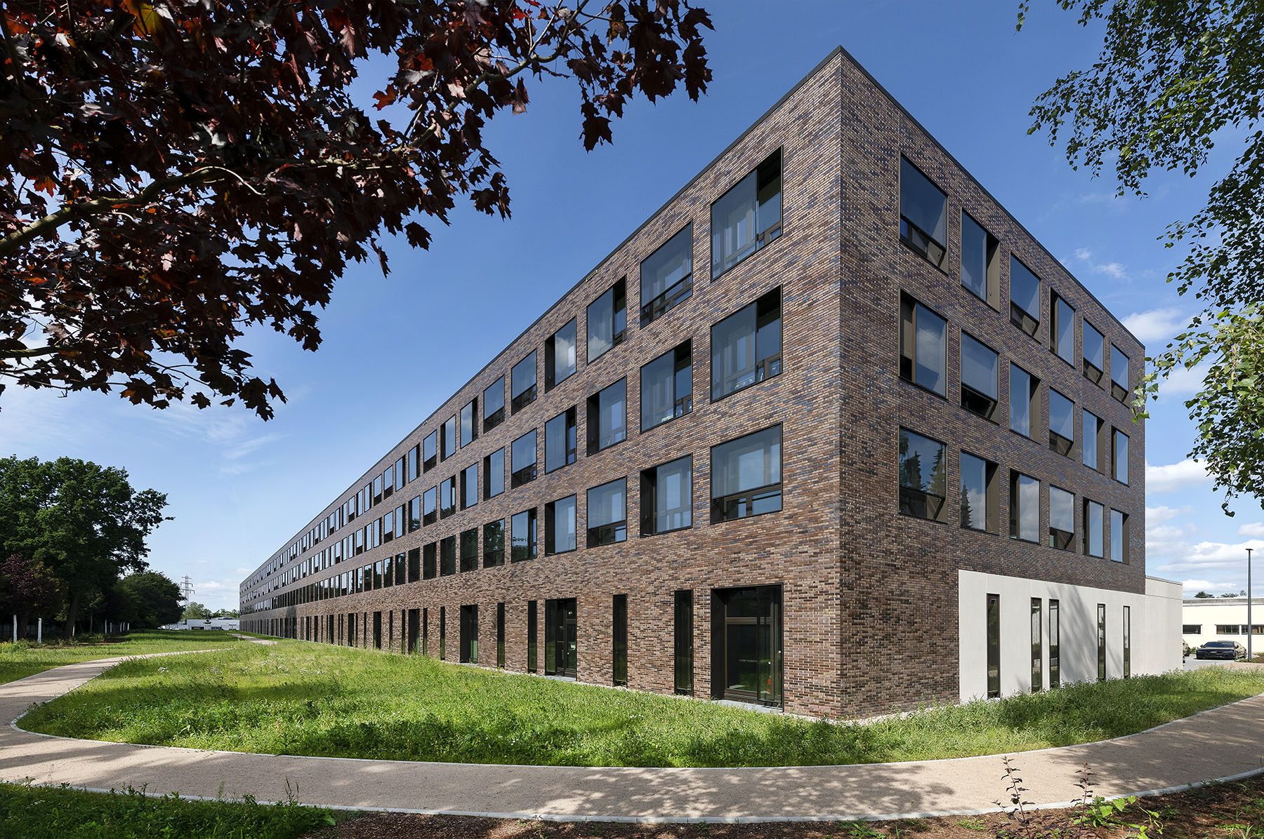Die Tragstruktur des Gebäudes basiert auf einem Achssystem von etwa 2,2 m mit tragenden Außenwänden. Stahlbetonstützen an den Fassaden und im Mittelflur tragen zusammen mit den massiven Erschließungskernen die Stahlbetondecken. Im Osten schiebt sich das Erdgeschoss aus Stahlbeton-Sandwichelementen aus dem Gebäude heraus, um die Grundfläche zu vergrößern und eine geschützte Anlieferungs- und Arkadenzone bilden zu können. In den Obergeschossen wird die Fassade mit einer Klinkermauerwerksschale versehen, mit Dämmung im Wandzwischenraum. (Text: Architekten)