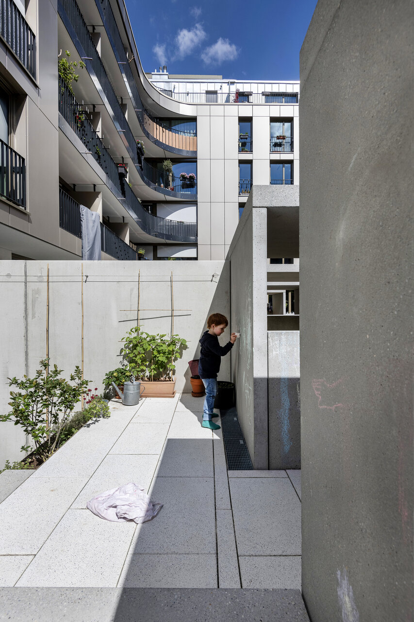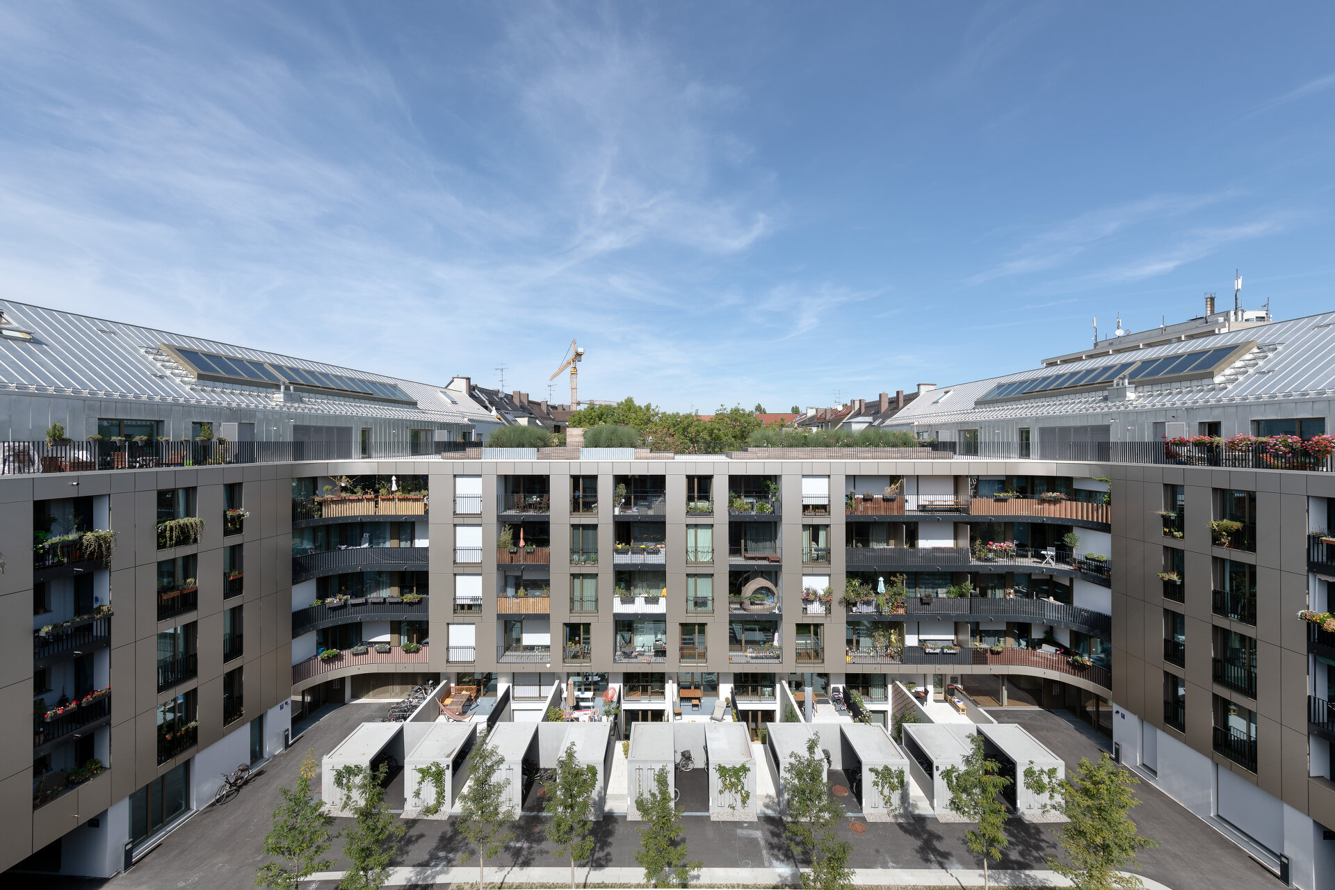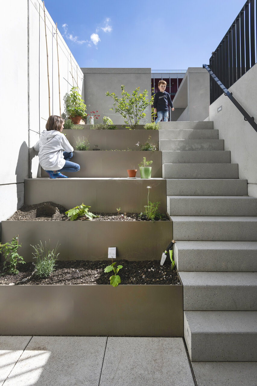 Durch vorgelagerte Radlhäuschen, Stufen und schmale Zugänge zu den Wohnungen wird der öffentliche Raum zum privaten Raum hin abgestuft . Zwei Gewerbeeinheiten flankieren die öffentlichen Durchgänge durch den Erschließungshof.
