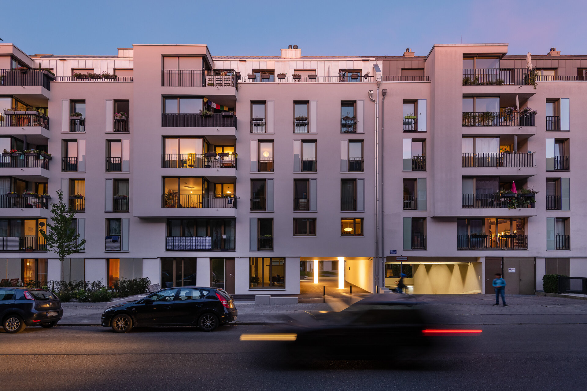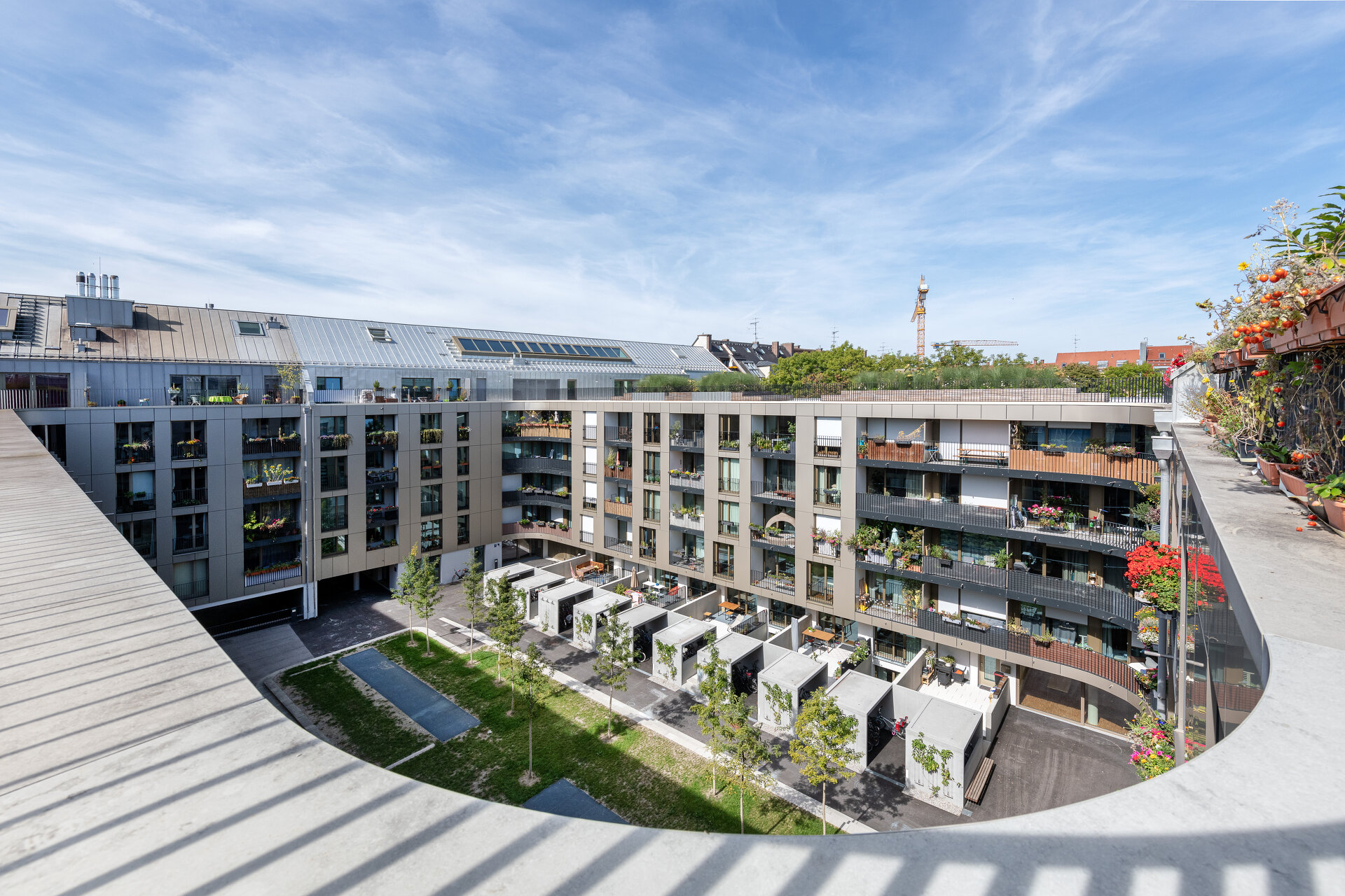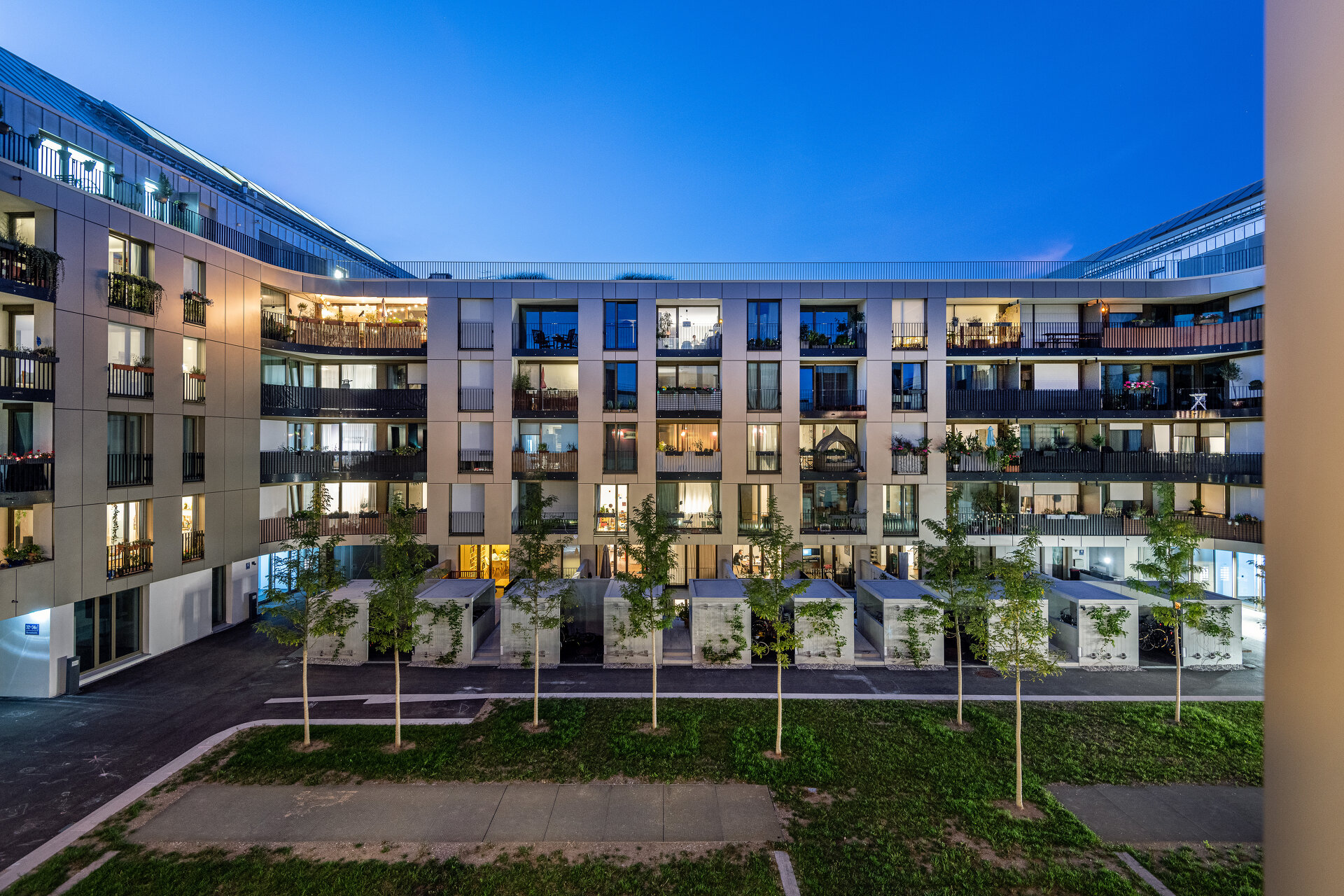 Durch vorgelagerte Radlhäuschen, Stufen und schmale Zugänge zu den Wohnungen wird der öffentliche Raum zum privaten Raum hin abgestuft . Zwei Gewerbeeinheiten flankieren die öffentlichen Durchgänge durch den Erschließungshof.