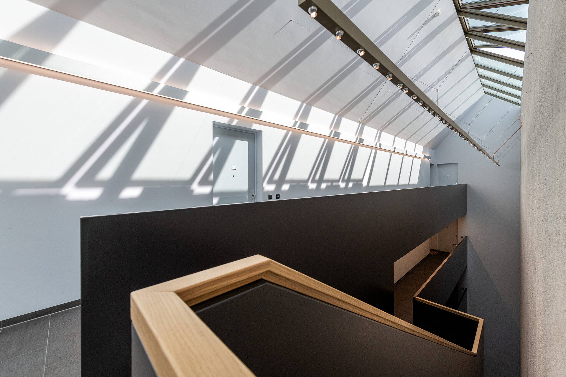 Außer den drei Höfen bieten die vier großen, offenen Treppenhäuser der Anlage reichlich Gelegenheit zur nachbarschaftlichen Kommunikation. Die Treppenhäuser verbinden die Gemeinschaftsräume im Erdgeschoss der Anlage mit den großzügig angelegten Dachterrassen, die für alle Bewohner zugänglich sind. (Text: Architekten, bearbeitet)