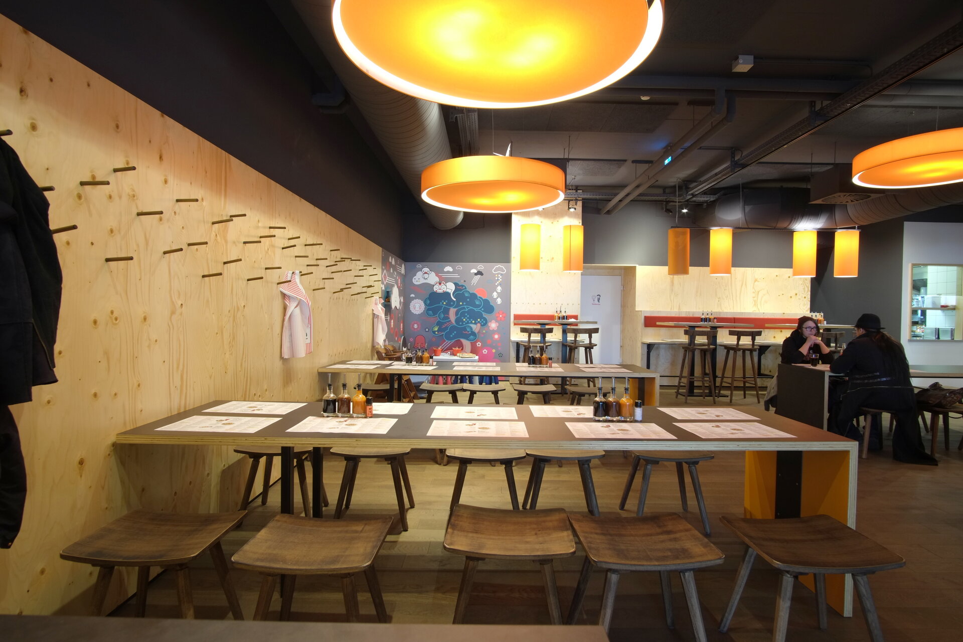 Ungewöhnlich ist das Restaurantlayout, welches eine übergroße Theke mit „Booths“ kombiniert. Diese kastenförmig abgetrennten Sitzbereiche bieten überraschende Privatheit im offenen Gesamtlayout.