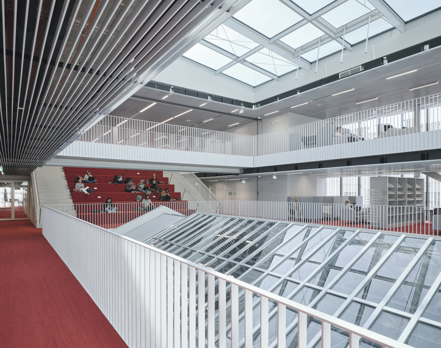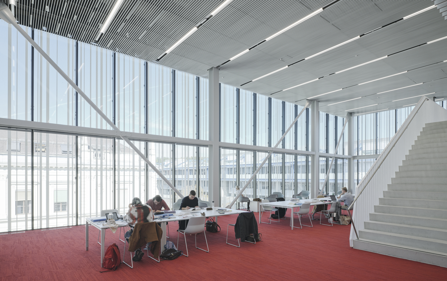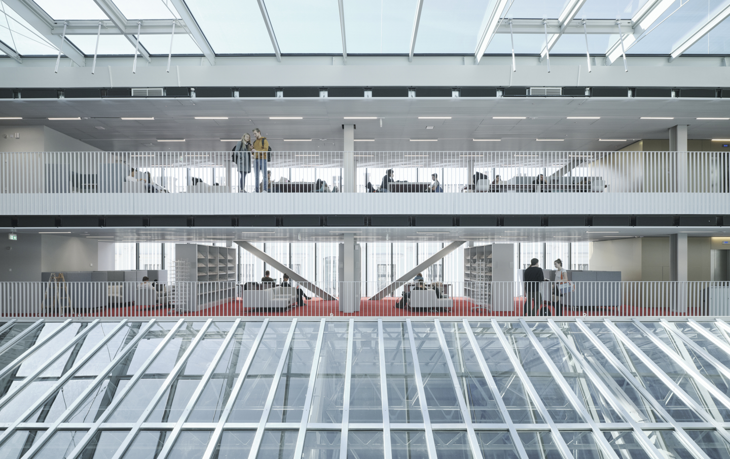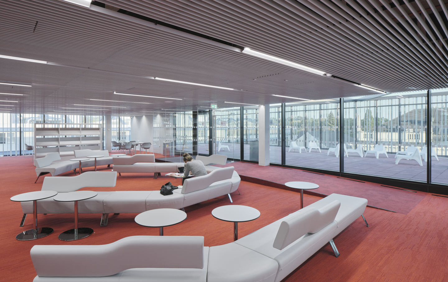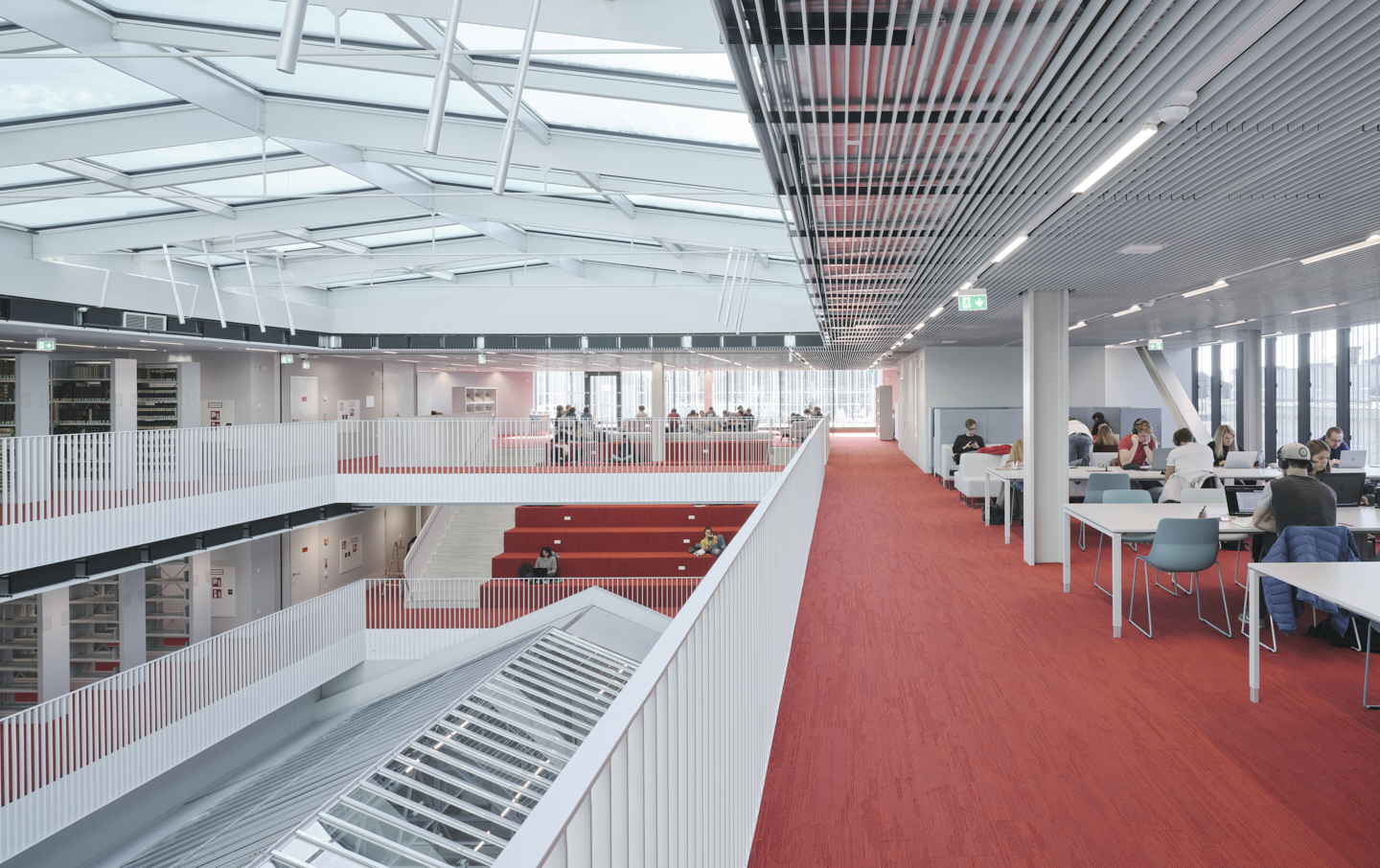 Als Herzstück können die differenziert ausgestalteten Lese- und Arbeitszonen in den neuen, obersten Geschoßebenen bezeichnet werden. In luftig-heller Arbeitsatmosphäre entscheidet man sich hier entweder für den akustisch getrennten Leiseraum mit Galerie, der mit langen Tischen und Bildschirmen ausgestattet ist, oder für den intimen Platz in einer Koje an der Längsfront gegenüber der Freihandbibliothek. Es gibt Sitzstufen mit Stromanschluss und eine Lounge mit Sofas, in der sich bequem die neuesten News lesen lassen. Das strahlende Weiß der massiven Stahltragkonstruktion und das dominierende, schöne Rot des Teppichbodens, der die Schritte schluckt und eine visuelle Klammer bildet, sind Muntermacher und wirken auch an einem grauen Wintertag einladend. Im Sommer werden die Plätze auf der nach Süden gerichteten Dachterrasse begehrt sein, doch schon jetzt staunt man über die beinahe volle Belegung der Plätze an einem Samstagvormittag. An dieser Stelle scheint eine Beobachtung angebracht. Vergleicht man die Pläne im Wettbewerbsstadium mit jenen, die nun umgesetzt wurden, so wird klar: Des Architekten zündende Idee – den Bestand entrümpeln und aufwerten durch eine rundum verglaste aufgesetzte Großform – blieb ohne Abstriche erhalten. Das ist im Prozess der Realisierung nicht selbstverständlich. Oft verwässern Kosten- oder Zeitdruck, Anforderungen an Sicherheit, Bauphysik oder anderes eine Idee. Hier nicht. Alles, was sich in der Detailbetrachtung an Unterschieden zeigt, stellt eine Entwicklung zum noch Besseren, Praktikablen dar. Hier wanderten die Treppenhäuser auf die Längsseite, ebenso die Regale für die Freihandaufstellung, und machten Durchblicke und Durchlässigkeit von Nord nach Süd und zwischen den beiden Ebenen möglich. Die Entscheidung, das zentral liegende historische, höchst filigrane Glasdach zu entlasten durch ein weiteres in Überkopfhöhe, brachte nochmals Verbesserung. Die Glasfronten an den Gängen konnten entfallen, ein großzügiges Raumkontinuum entstand.