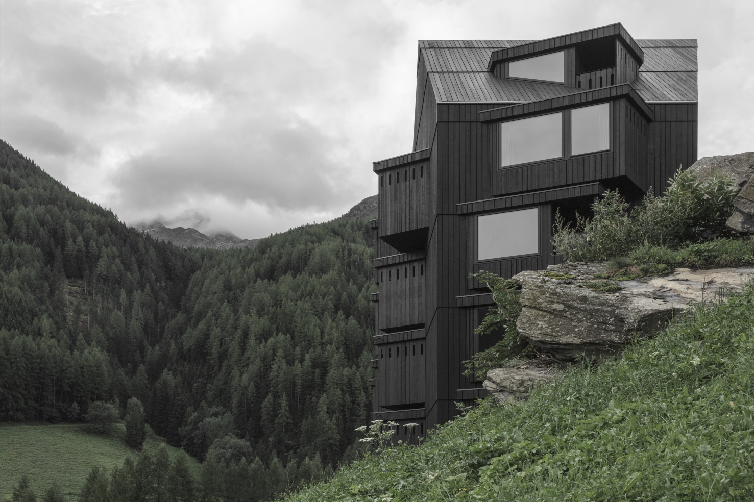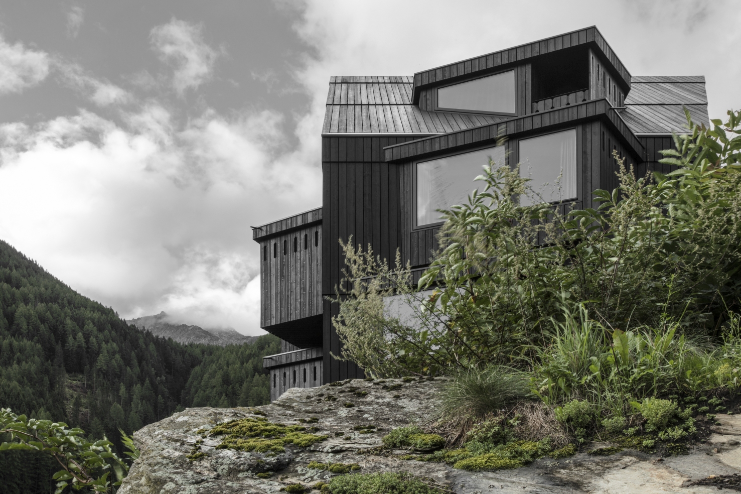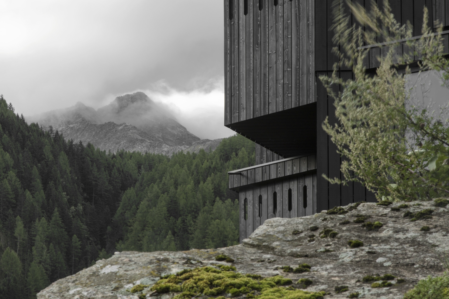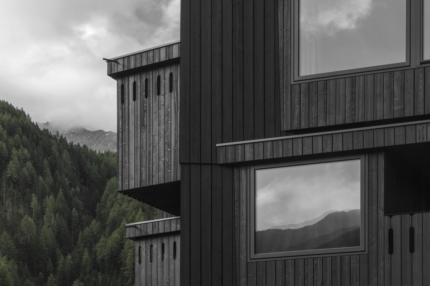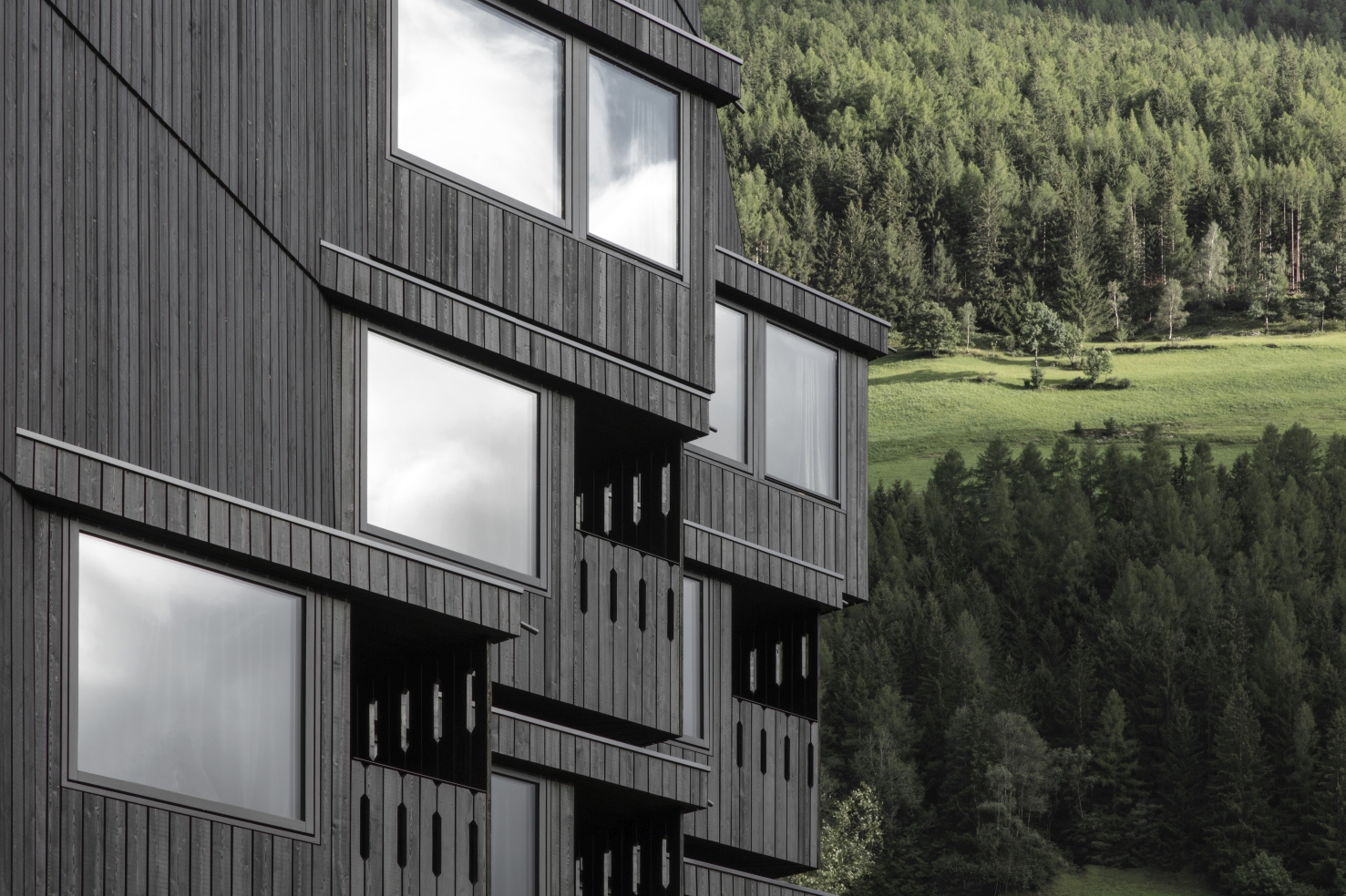 Der Grünschimmer in der schwarzen Fassade nimmt die Farbgebung der sattgrünen bis schwarzen Wälder des Sommers auf. Natur und Topographie verschmelzen mit dem Projekt und erzeugen einen hohen Wiedererkennungswert. Das Gebäude hebt sich über einen schlichten Wohnbau hinaus und vermittelt die übergeordnete Bedeutung als „Herberge“. Das Wechselspiel der natürlichen Materialien verleiht dem Gebäude Wärme und selbstverständliche Schönheit.