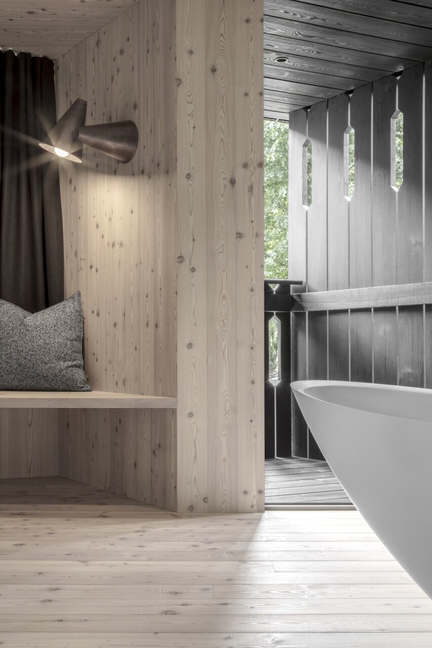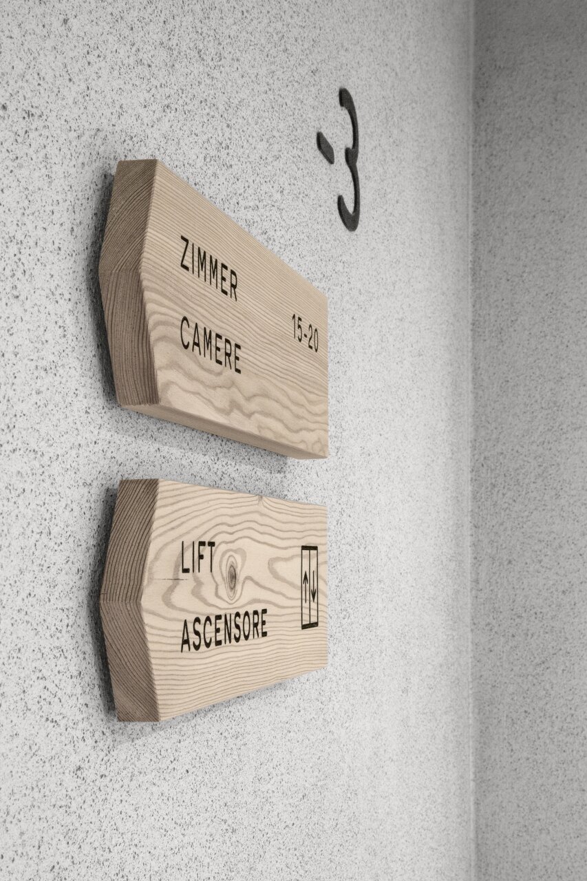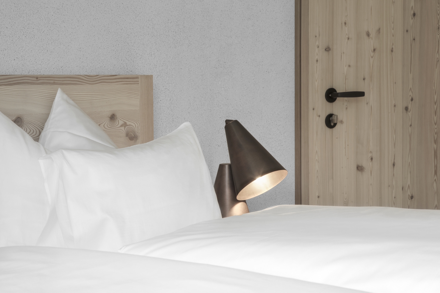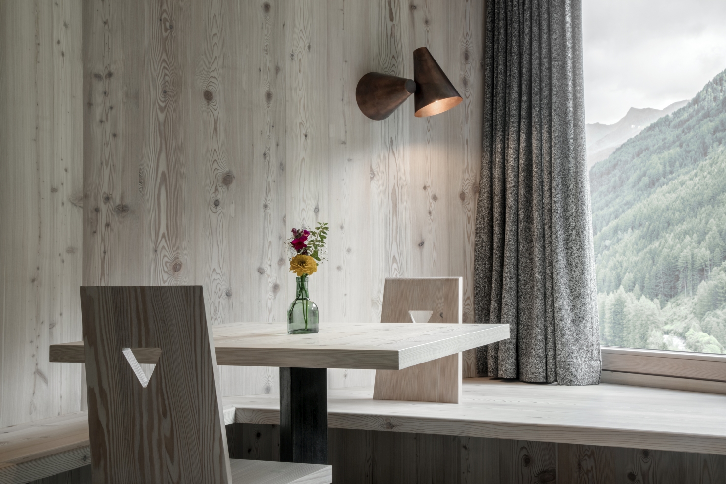Charakteristische Elemente der lokalen Bautypologie wurden sprachlich übersetzt und interpretiert. Das Lärchenholz aus den umliegenden Wäldern vermittelt in den Innenräumen und der Verwendung der Möblierung, Geborgenheit. Der Grünschimmer im Verputz spiegelt durch die verwendeten Zuschläge aus dem Bergwerk die Farbgebung der Bergwelt wieder und macht die Innenräume zu vertrauten Orten. Um an die regionale Wertschöpfung anzulehnen, sind die Individuell gefertigten Lampen aus einer Kupferfassung erstellt. Insgesamt entsteht durch die besondere Auswahl der regional produzierten Materialien eine wohnliche, beruhigende und vertraute Atmosphäre. (Text: Architekten)