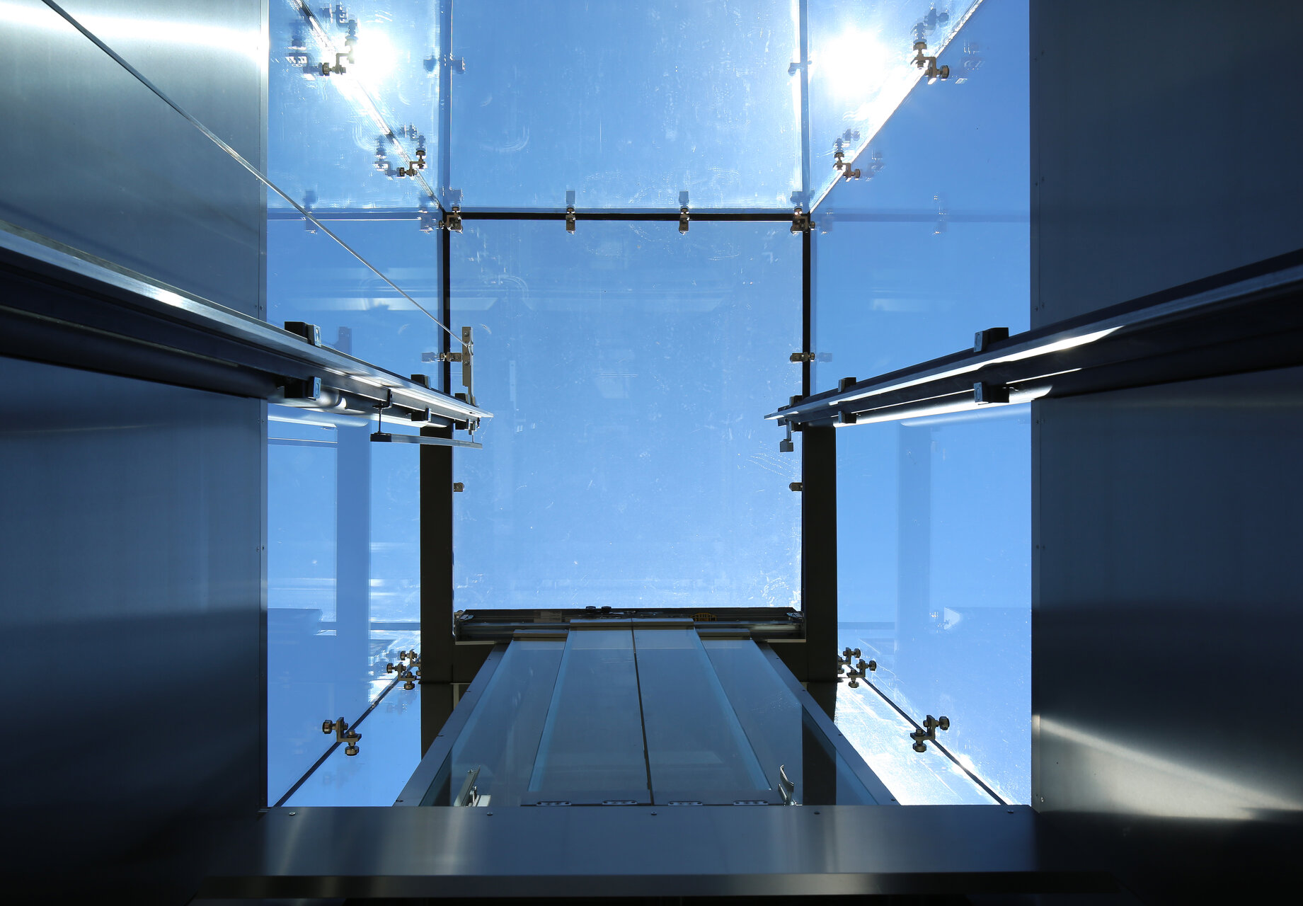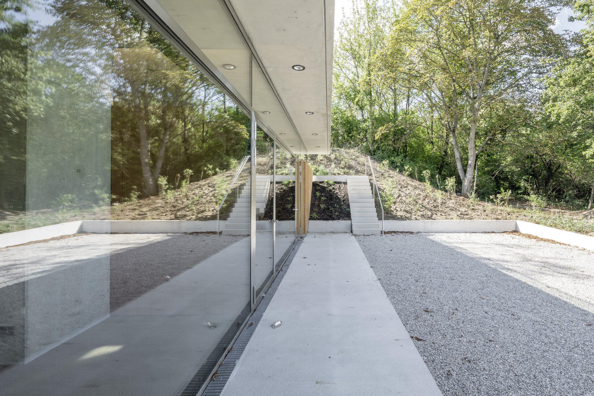 In der Kirche entstand eine sehr lebendige Gemeinde, die sich vor ein paar Jahren mit dem Problem eines besseren Zugangs auseinanderzusetzen begann. Auf dem direkt zur Kirche gehörenden Grundstück ist zu wenig Platz für eine Rampe, weshalb man auf die Idee kam, der Kirche einen verglasten Lift vorzusetzen, der über den bestehenden Zugang zur Unterkirche erreichbar sein soll. Der zusätzliche Raum wird neben diesem Zugang als eine Art Vitrine in den Hang geschoben. Der Lift führt nicht direkt in die Kirche, sondern prominent auf deren Eingangsniveau in acht Meter Abstand vor der Fassade. Hier geht es wieder ins Freie und dann um die Kirche herum zu deren Hintereingang.