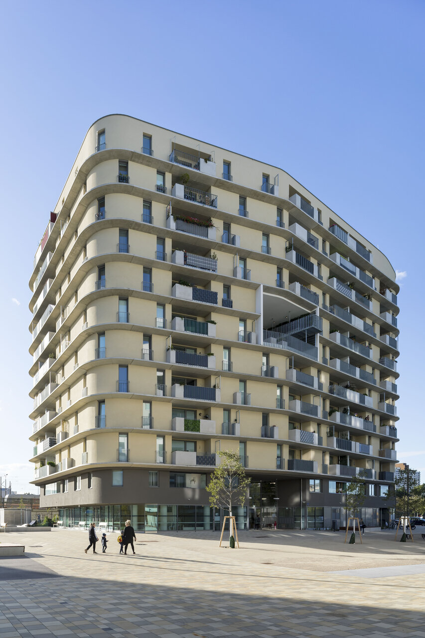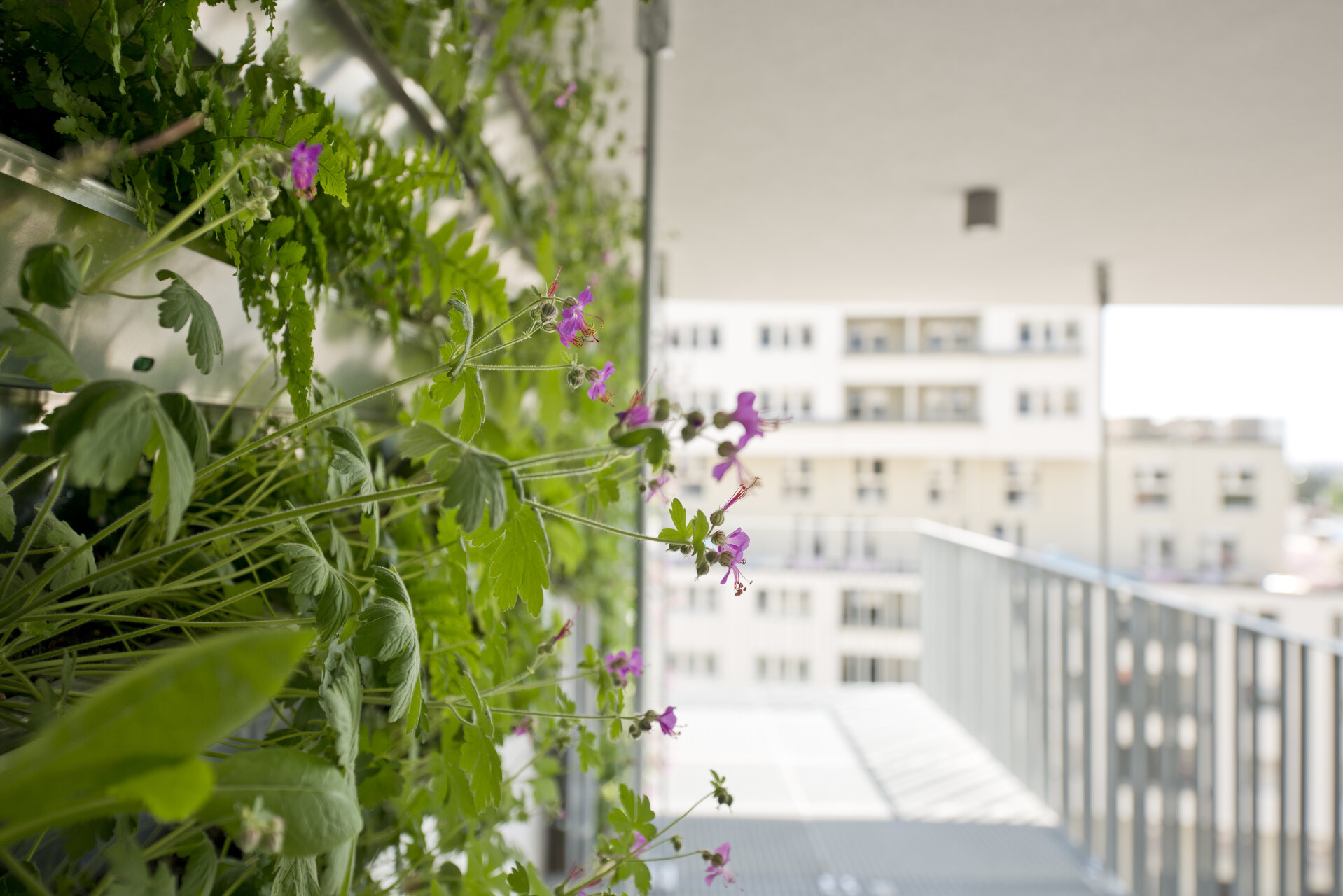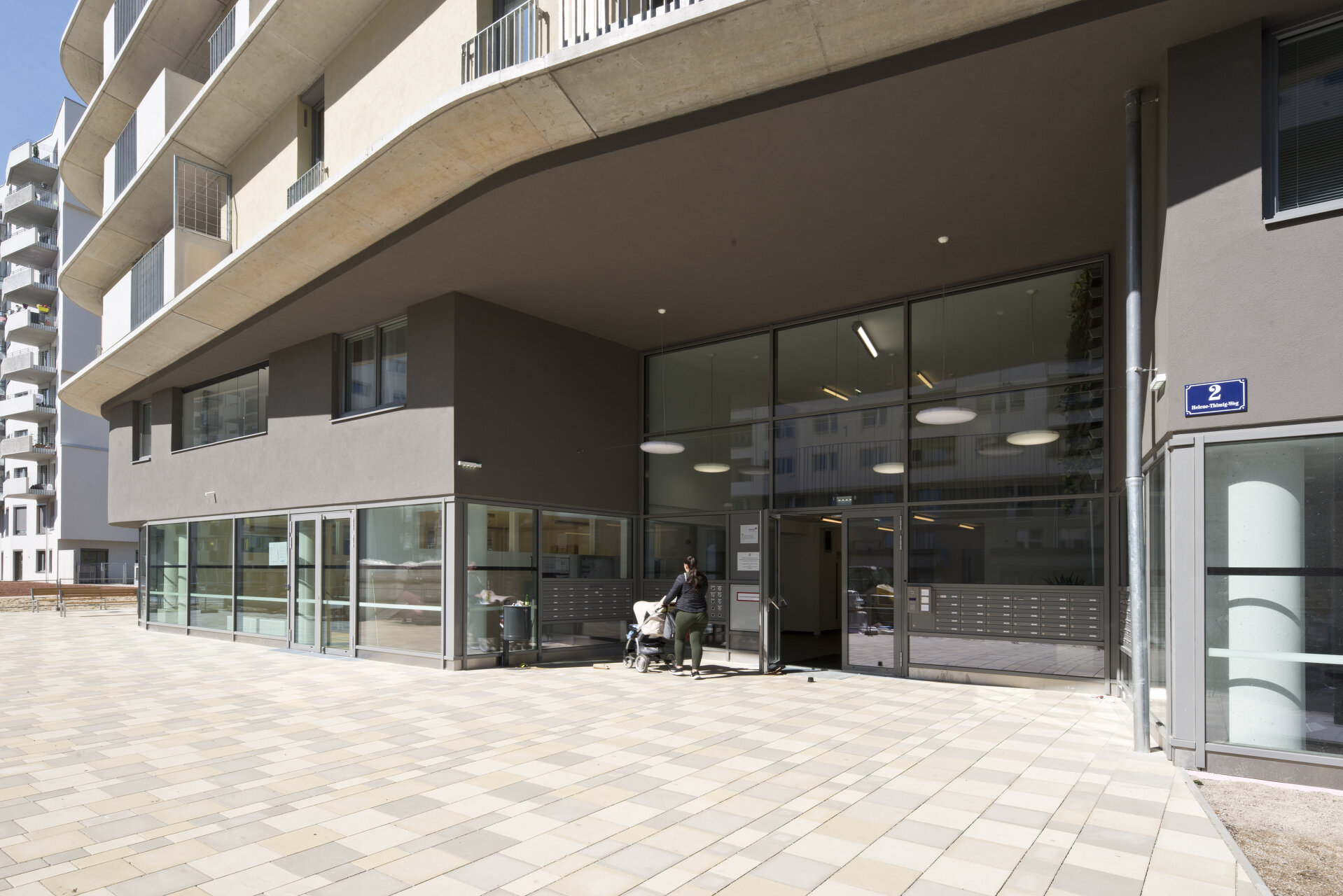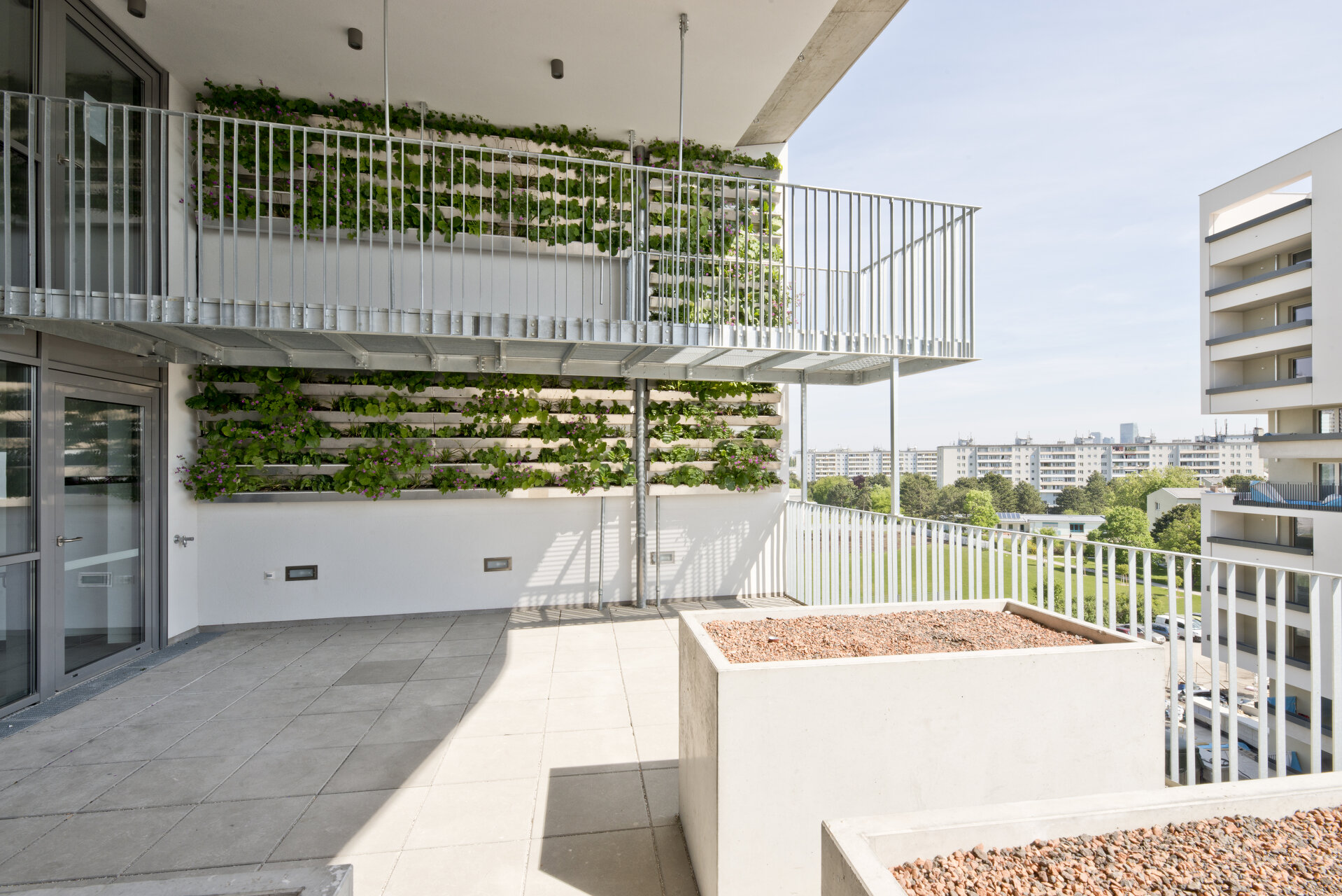 Alle 108 Wohnungen verfügen über private Balkone oder Loggien mit integrierten Pflanztrögen zum individuellen Gärtnern. Durch die kompakte Planung ist die Alltagstauglichkeit optimal gegeben: Die Wohnungsstrukturen nehmen eine Vielfalt von neuen gesellschaftlichen Wohnbedürfnissen auf. Die Typologie orientiert sich am Leitprojekt mit Grundsätzen der sozialen Nachhaltigkeit. Das Gebäude verfügt über 36 Zwei- und Drei-Zimmer-SMART-Wohnungen sowie 72 Zwei- bis Vier-Zimmer-Wohnungen. Zusätzlich gibt es Startwohnungen für asylberechtigte Familien und Paare, die von der Volkshilfe Wien begleitet werden und so einen integrativen Mehrwert schaffen. (Text: Architekten, bearbeitet)