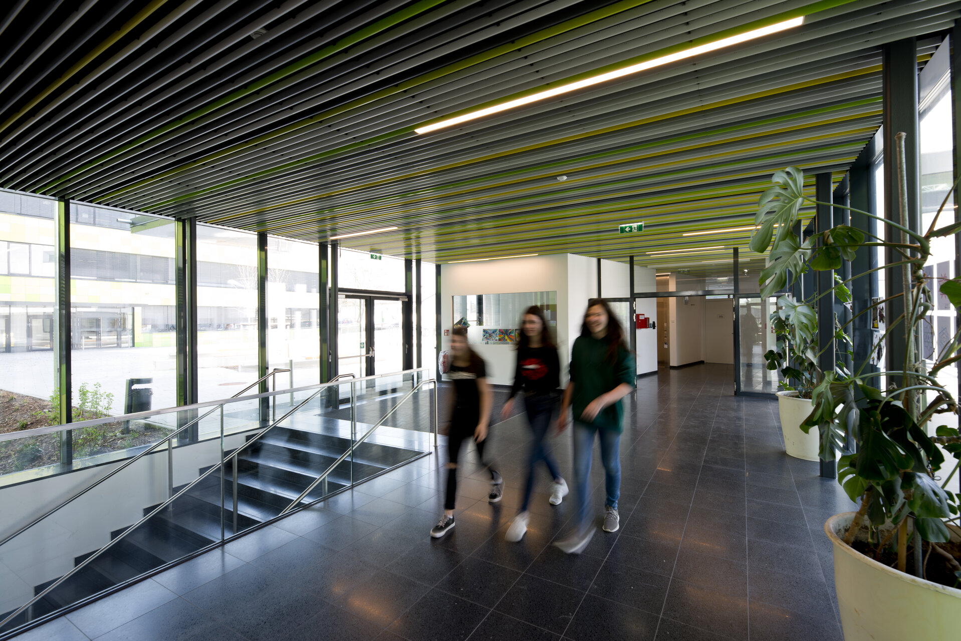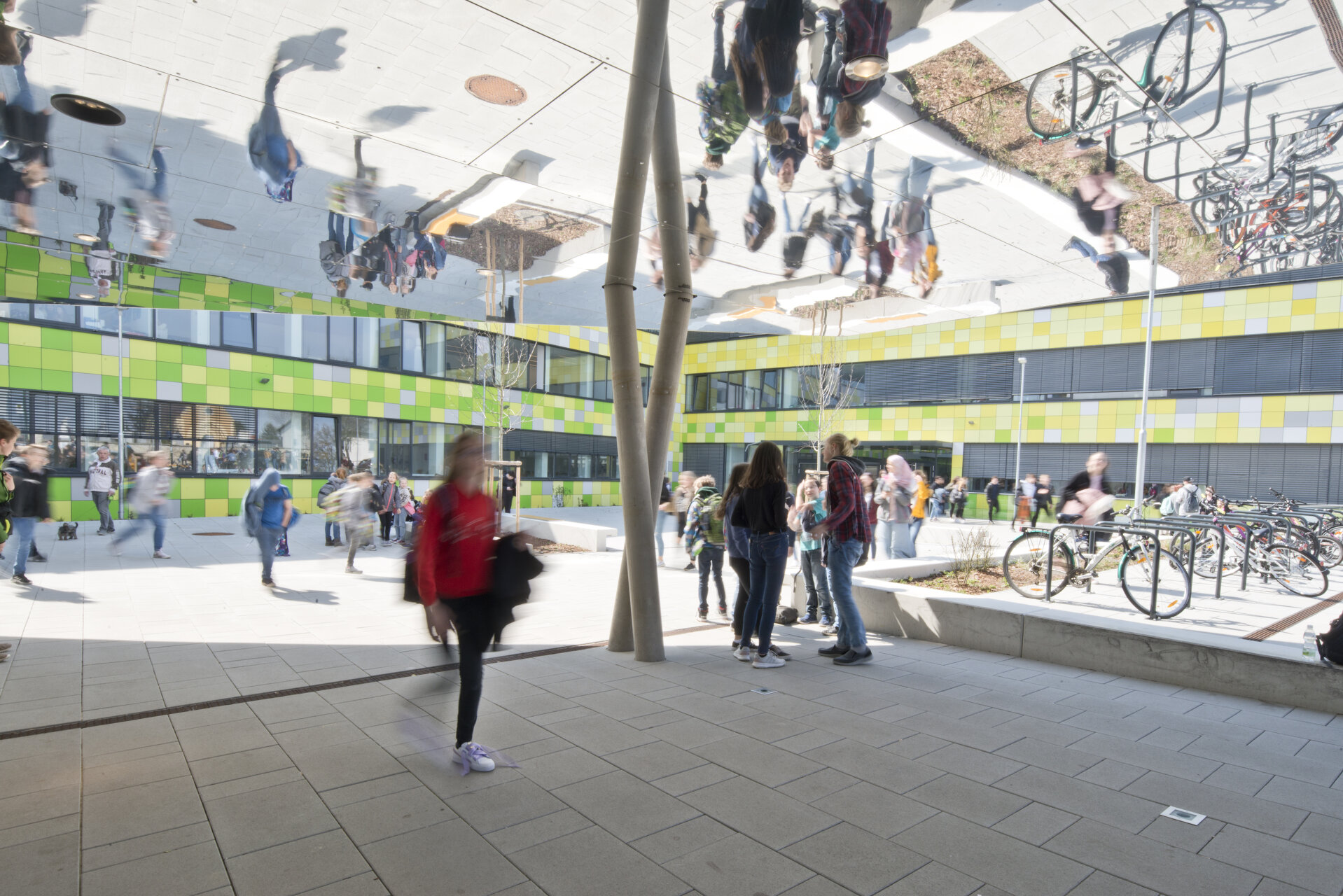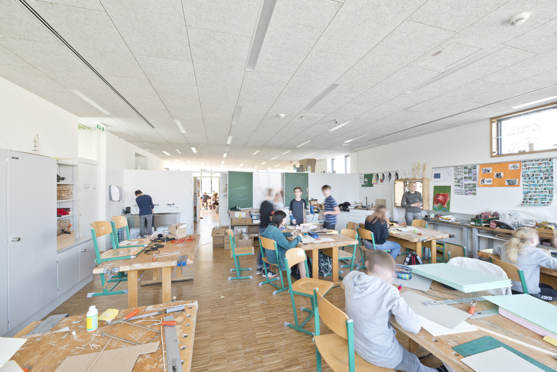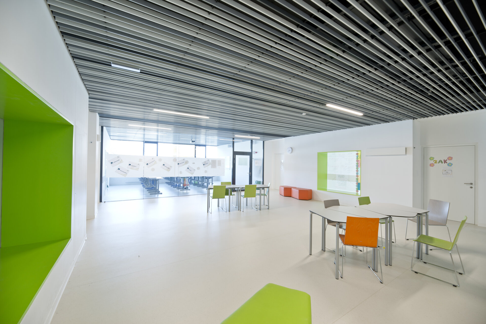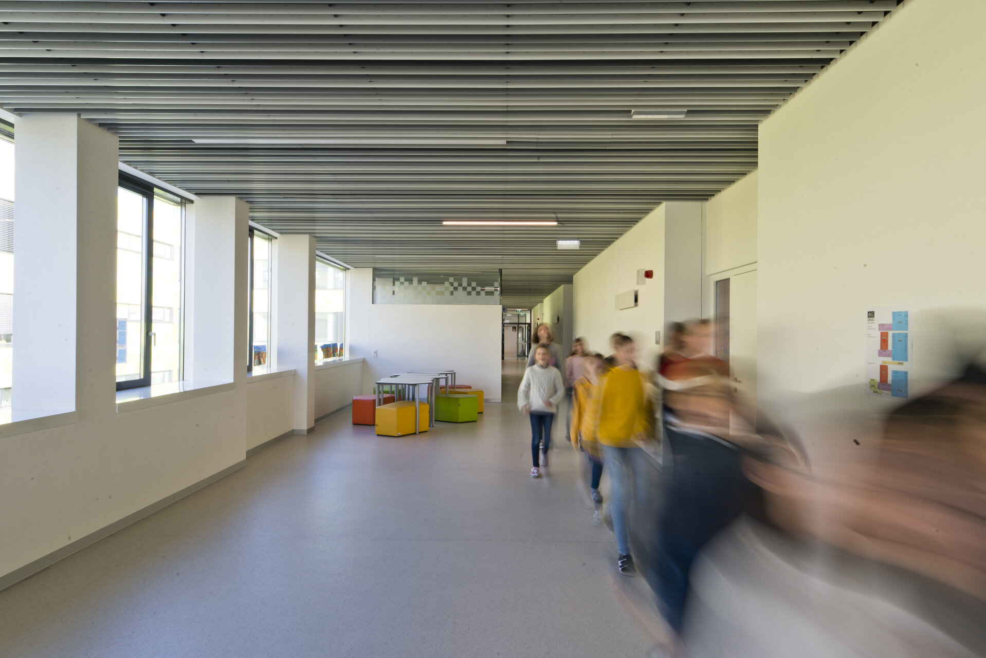 Im Hauptgebäude wurden die Trakte des Schulzentrums neu konfiguriert. Es gibt nun Multifunktionswände zwischen Pausenhalle und den Unterrichtsräumen. Darin integriert sind Sitznischen mit Sichtfenstern zu den Klassenräumen, ebenso Nischen für Einbaukästen, Elektroverteiler und Serverschränke. Die Zonierung in den Gängen sorgt für die Rhythmisierung der offenen Aufenthaltsbereiche und lässt vielfältige Lernsituationen entstehen. Da die Schule im Ganztagsmodell geführt wird – am Vormittag Unterricht und nachmittags Lern- und Freizeit – bieten mobile Tische und Hocker größtmögliche Flexibilität für individuelles Lernen. (Text: Architekt:innen, bearbeitet)