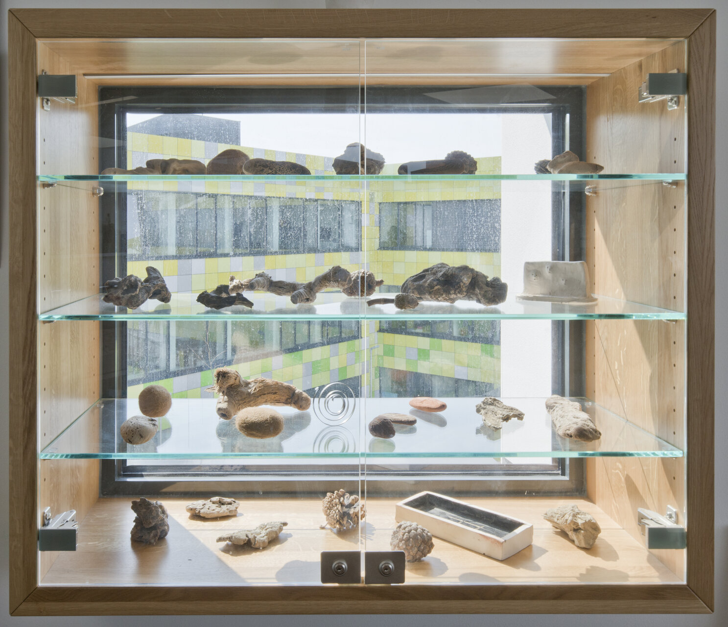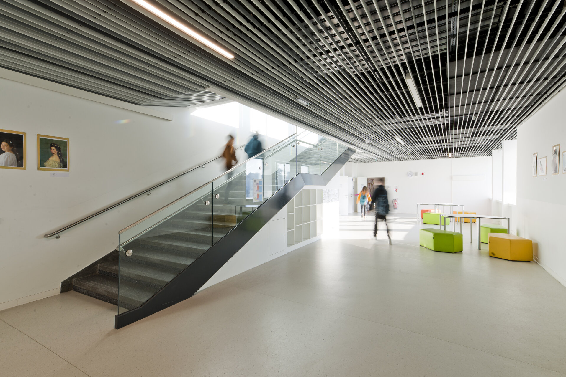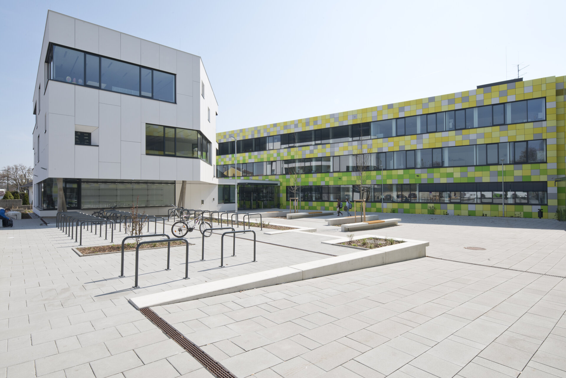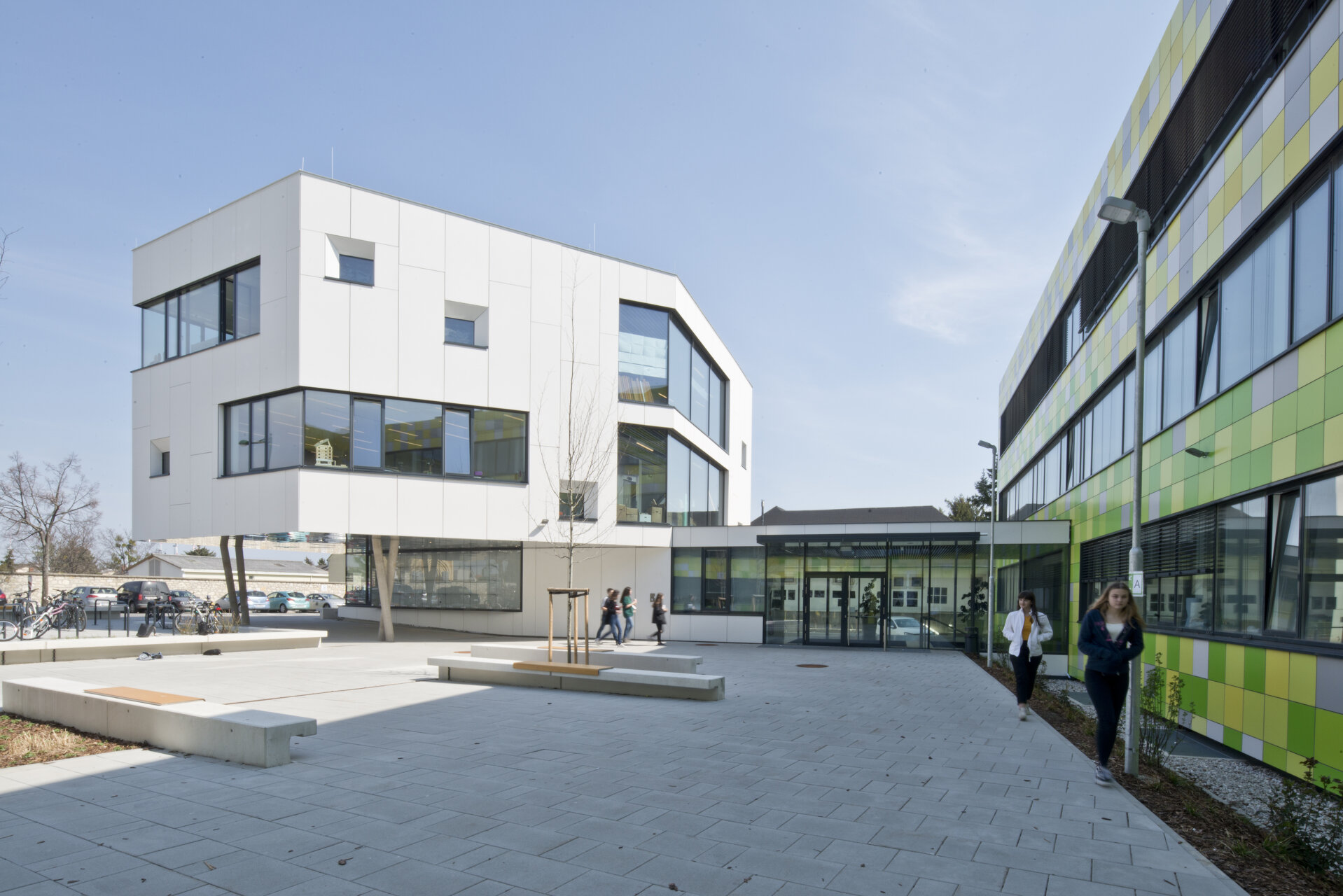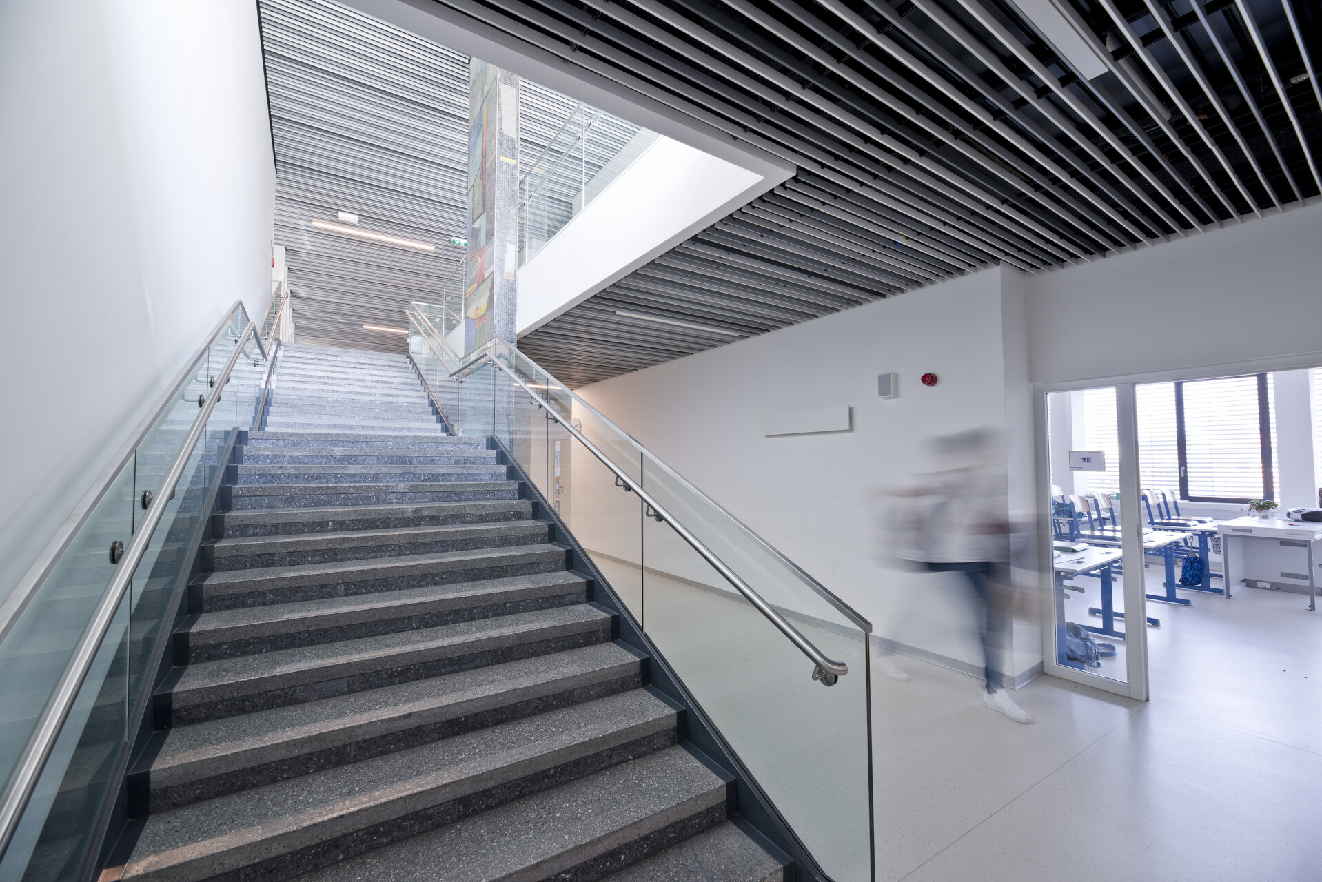 Im Hauptgebäude wurden die Trakte des Schulzentrums neu konfiguriert. Es gibt nun Multifunktionswände zwischen Pausenhalle und den Unterrichtsräumen. Darin integriert sind Sitznischen mit Sichtfenstern zu den Klassenräumen, ebenso Nischen für Einbaukästen, Elektroverteiler und Serverschränke. Die Zonierung in den Gängen sorgt für die Rhythmisierung der offenen Aufenthaltsbereiche und lässt vielfältige Lernsituationen entstehen. Da die Schule im Ganztagsmodell geführt wird – am Vormittag Unterricht und nachmittags Lern- und Freizeit – bieten mobile Tische und Hocker größtmögliche Flexibilität für individuelles Lernen. (Text: Architekt:innen, bearbeitet)