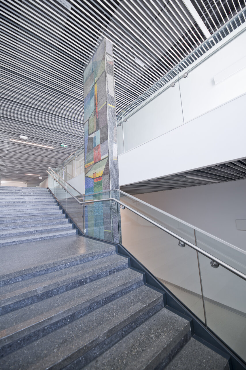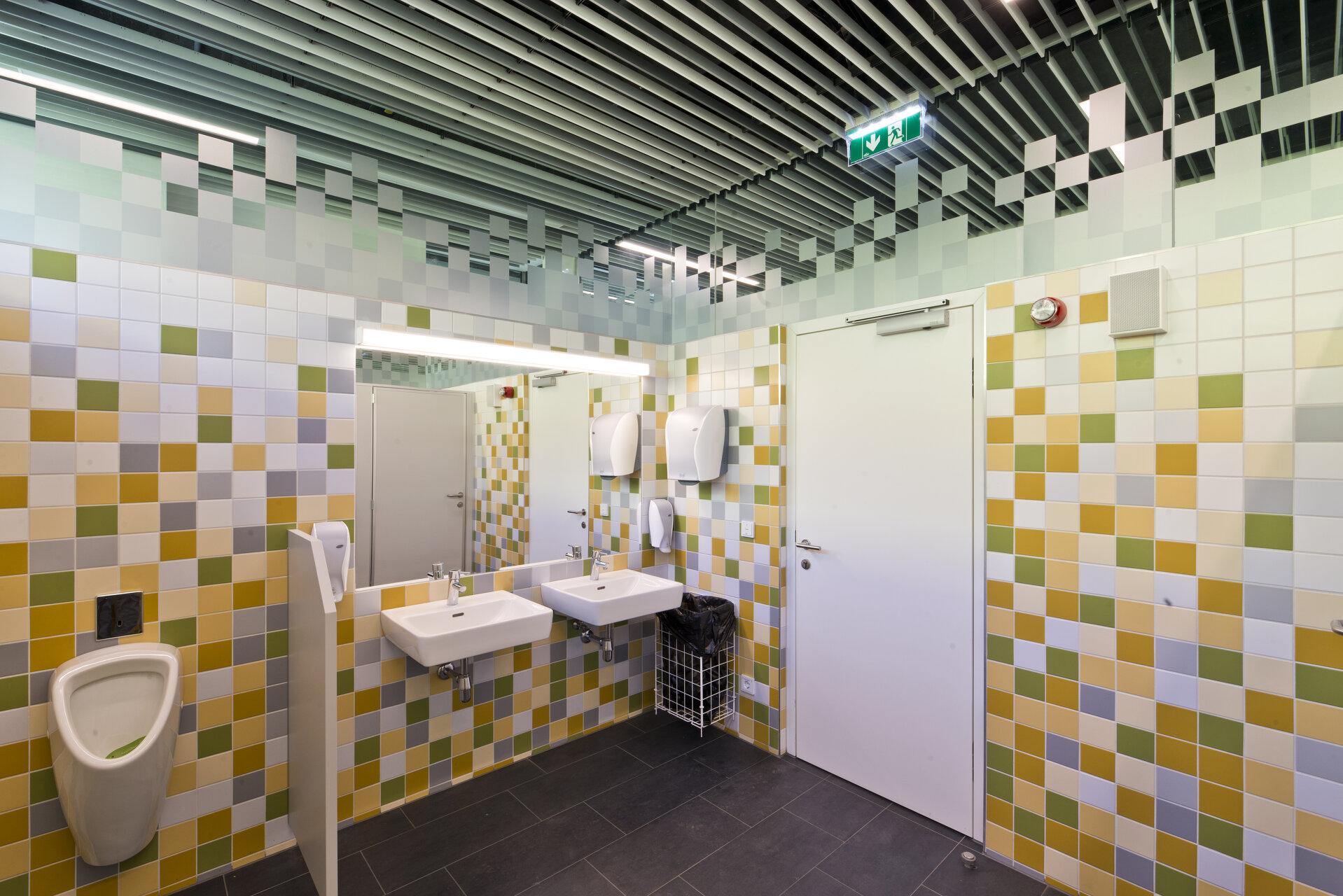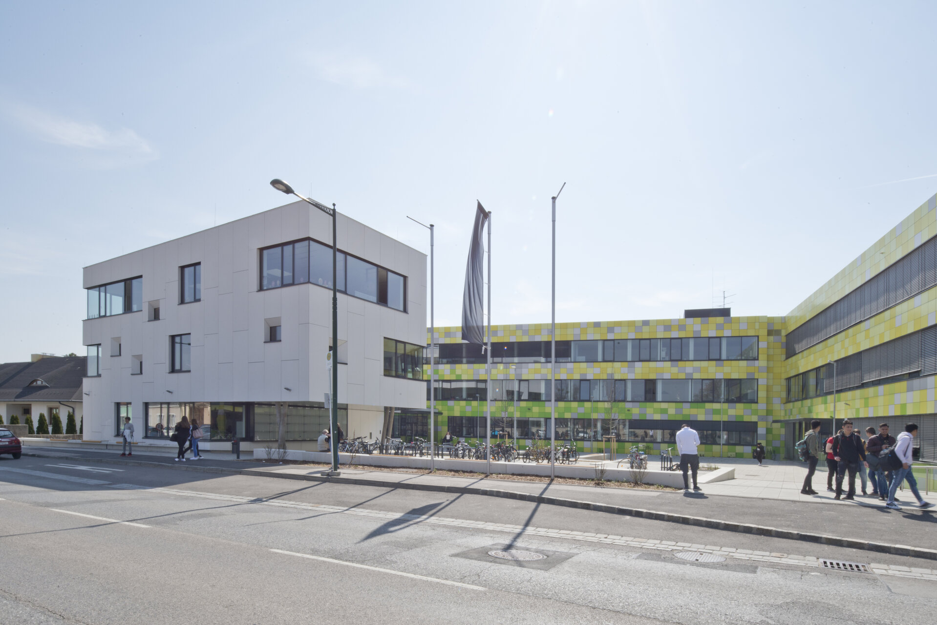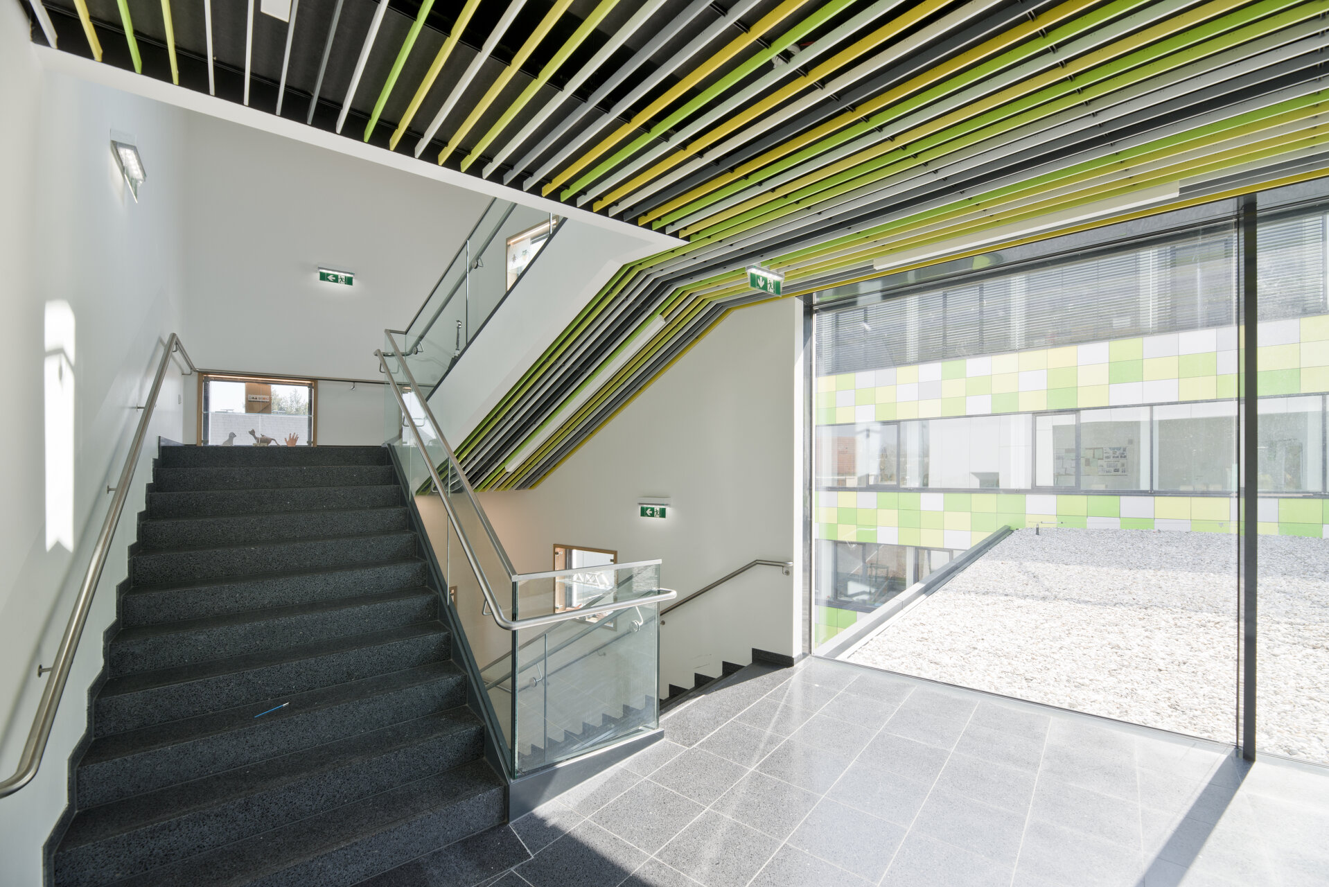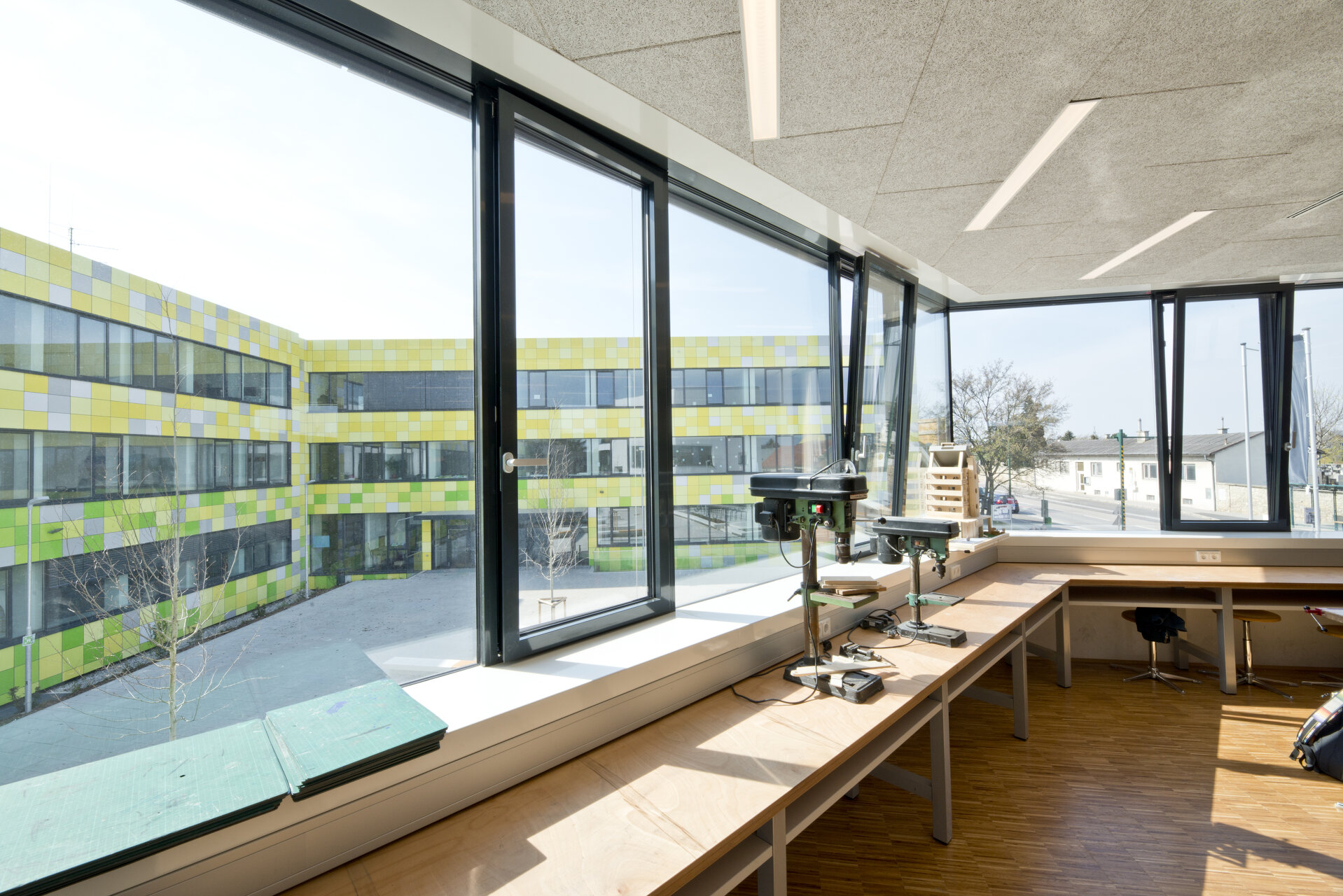 Das Farbkonzept in Gelb-Grüntönen folgt den Vorgaben der Fassadengestaltung des Bestandsbaus durch das Architektenteam Franz&Sue, das für die thermische Sanierung und Adaptierung der Turnsäle verantwortlich zeichnet. Der bunten Fassade wird in den Innenräumen eine helle, zurückhaltende Palette von Farbtönen an Wänden, Boden und Decke gegenübergestellt. Farbakzente finden sich in den Sanitäranlagen und bei der Möblierung. Das Farbkonzept zieht sich auch im Leitsystem durch. Ein flexibles Lamellensystem an den Decken der Gangbereiche lässt die Haustechnik verschwinden. Der außenliegende Sonnenschutz lenkt mit spezieller Beschichtung der Lamellen diffuses Licht bis tief in die Räume.