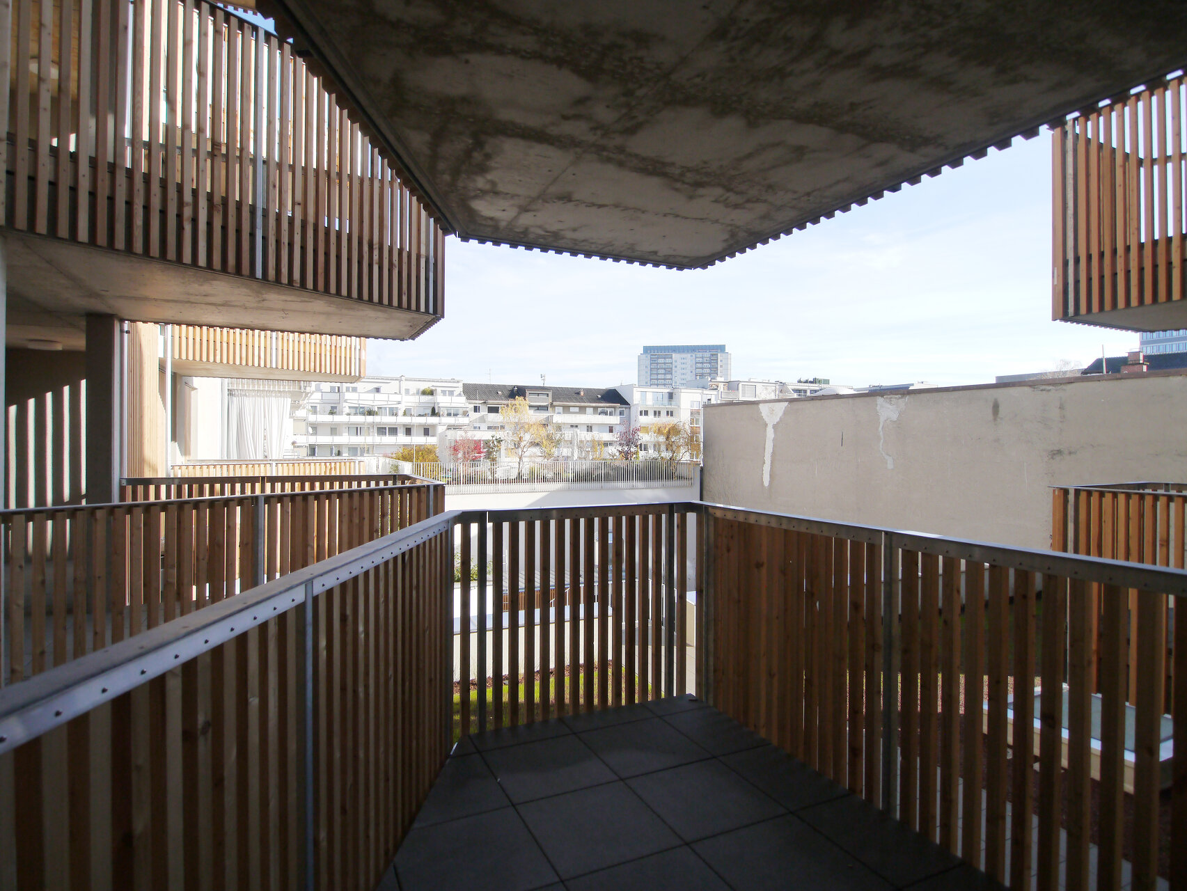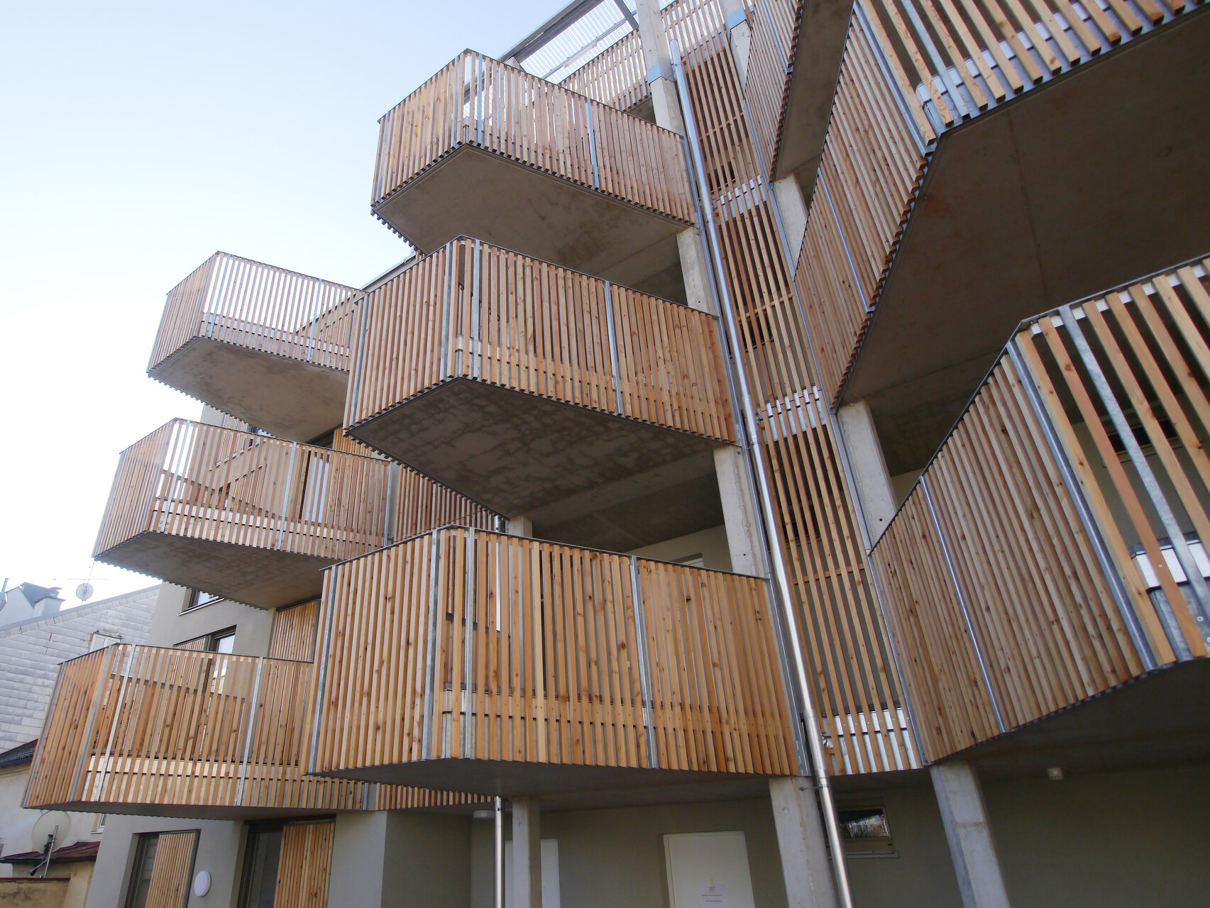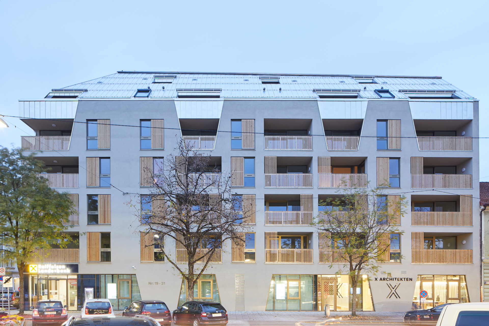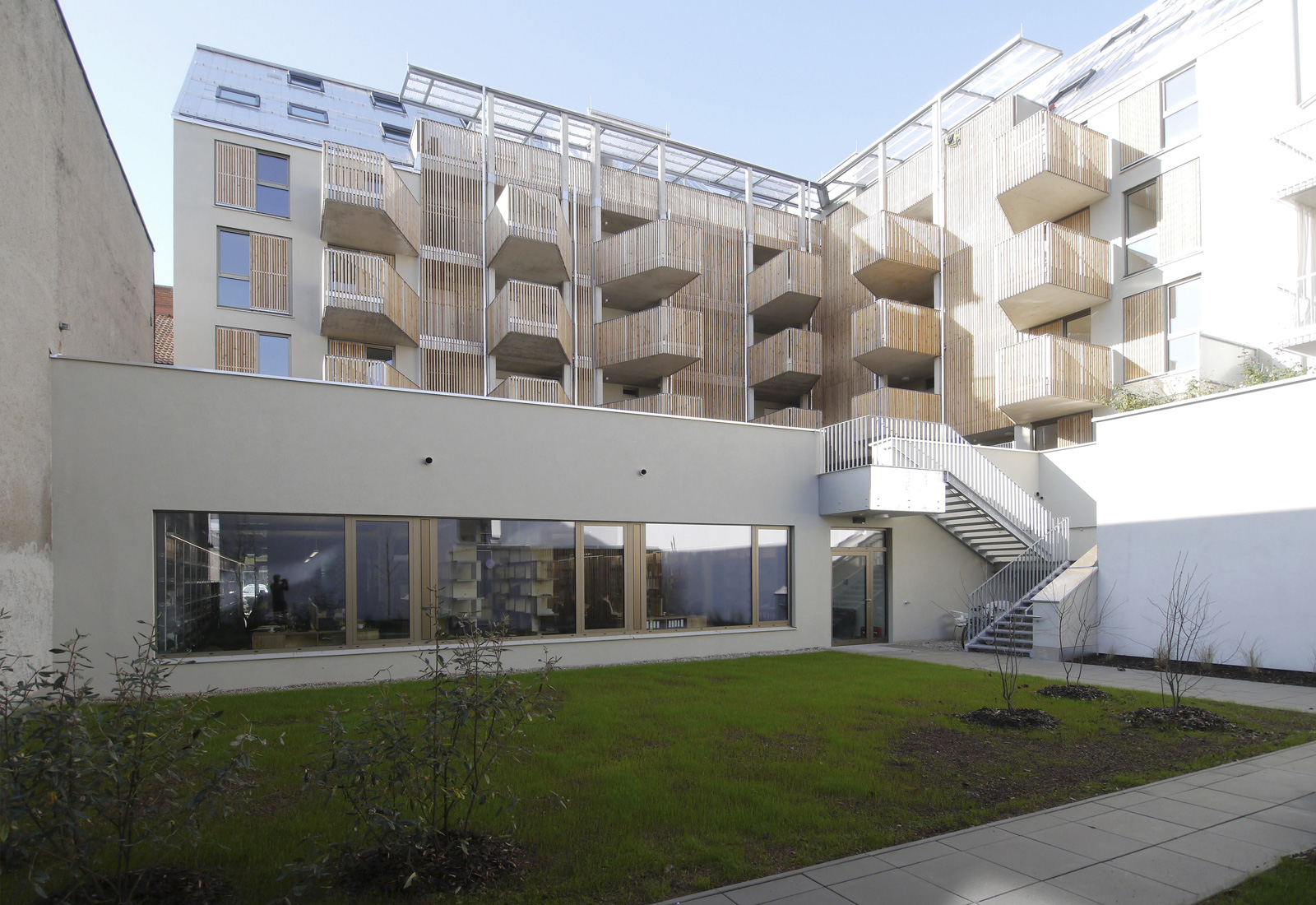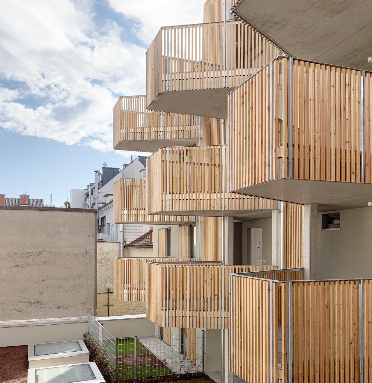 Kommunikation heißt die Prämisse: Die durchgesteckten und damit sehr gut belichteten Wohnungen erreicht man über breite Laubengänge, die auskragenden Balkone zum Innenhof fördern das Gemeinsame. Zur Straßenseite schaffen ebenso Holzelemente bei den großen Loggien für Atmosphäre, aber auch für die markante Strukturierung der Fassade. (Text: Martina Pfeifer Steiner)