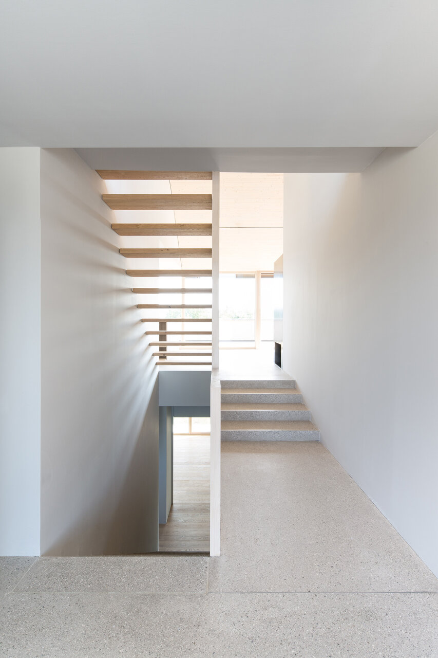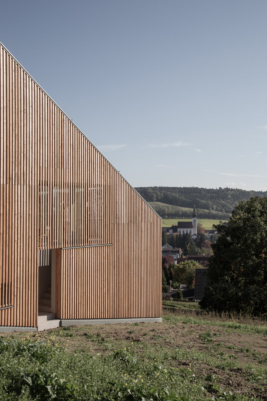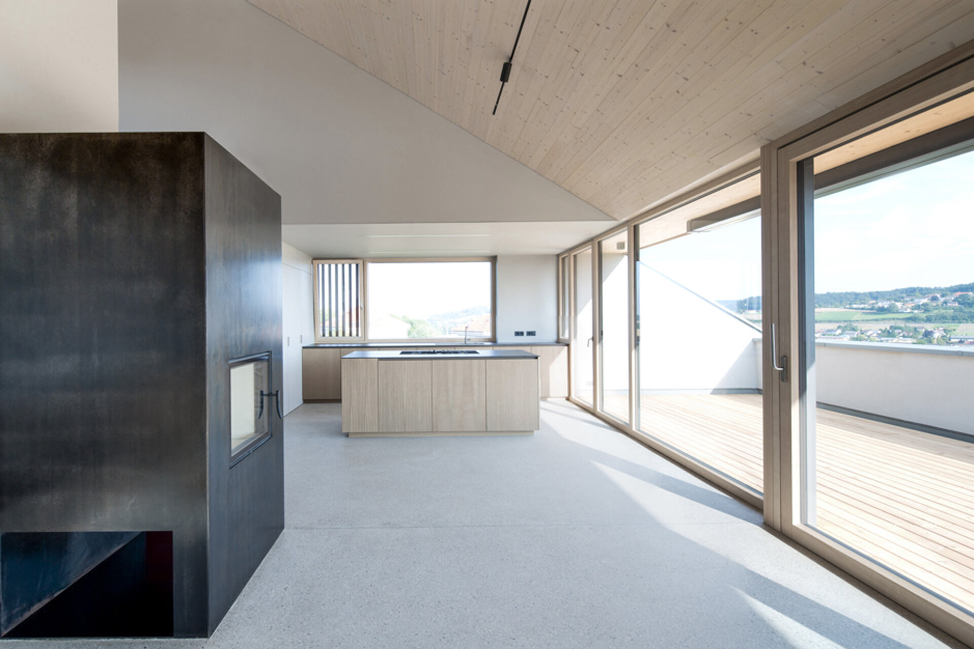 Ein schlichtes Satteldachhaus mit der Firstrichtung entlang des Hügels gewährleistet eine behutsame Höhenentwicklung hang- und talwärts. Die Niveaus wurden der Nutzung und innerhalb der Möglichkeit des Bebauungsplanes entsprechend gegliedert. So sind Kinder- und Schlafbereiche unterm Gartenniveau situiert. Ein 2/3-Geschoß höher, erfolgt der Eingangsbereich mit zugehöriger Infrastruktur. Eine Holzwandscheibe verbindet vertikal diese Raumzonen und Ebenen und begleitet vielfältig den Erschließungsweg durchs Haus. Etwas erhöht folgt der Ess- und Küchenbereich mit vorgelagerter geschützter Terrasse. In der offenen Galerie im Dachgeschoß wird gelesen und gewohnt, mit Blick auf die nördlichen Hügelketten und ebenso mit zugehöriger introvertierter Terrasse.