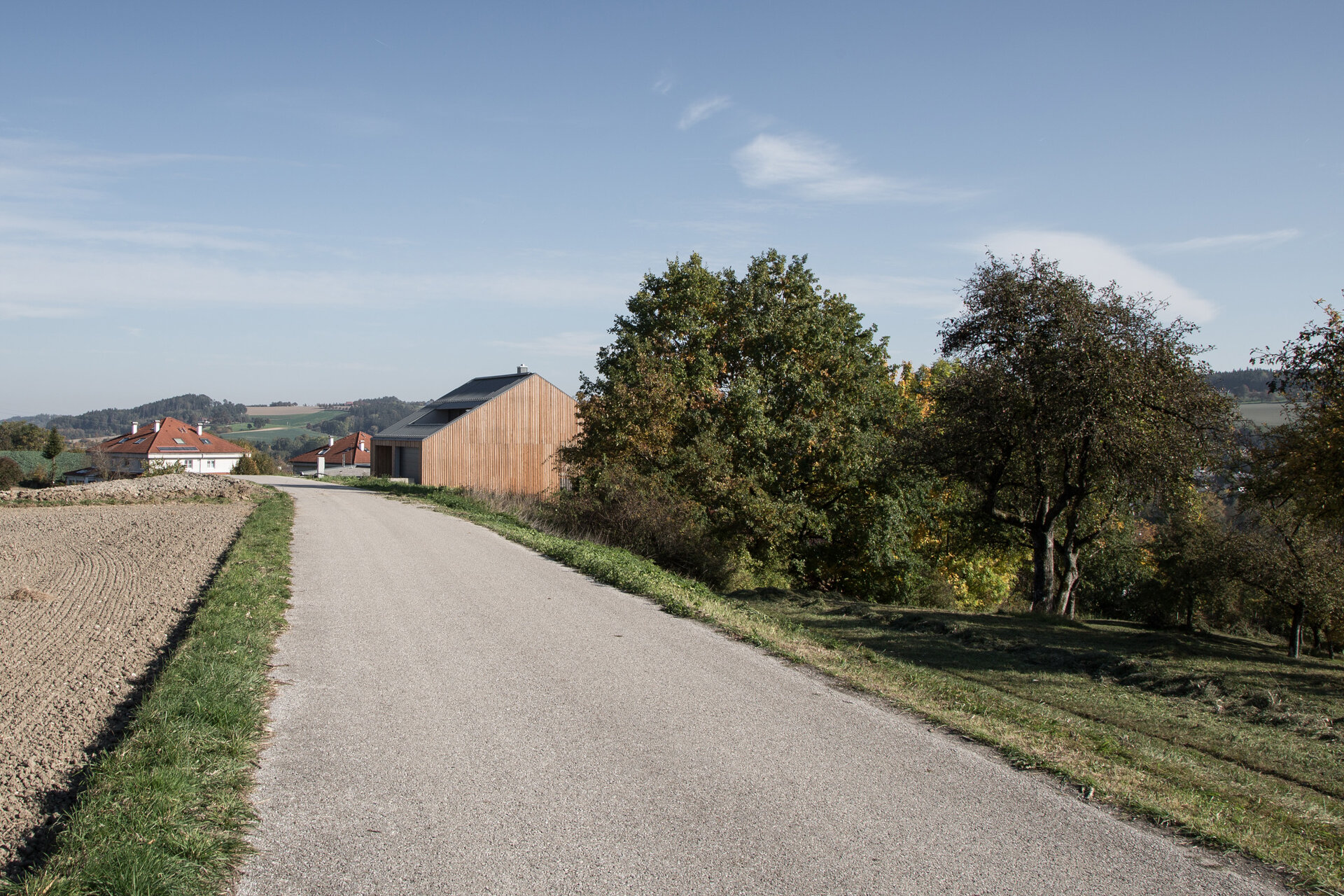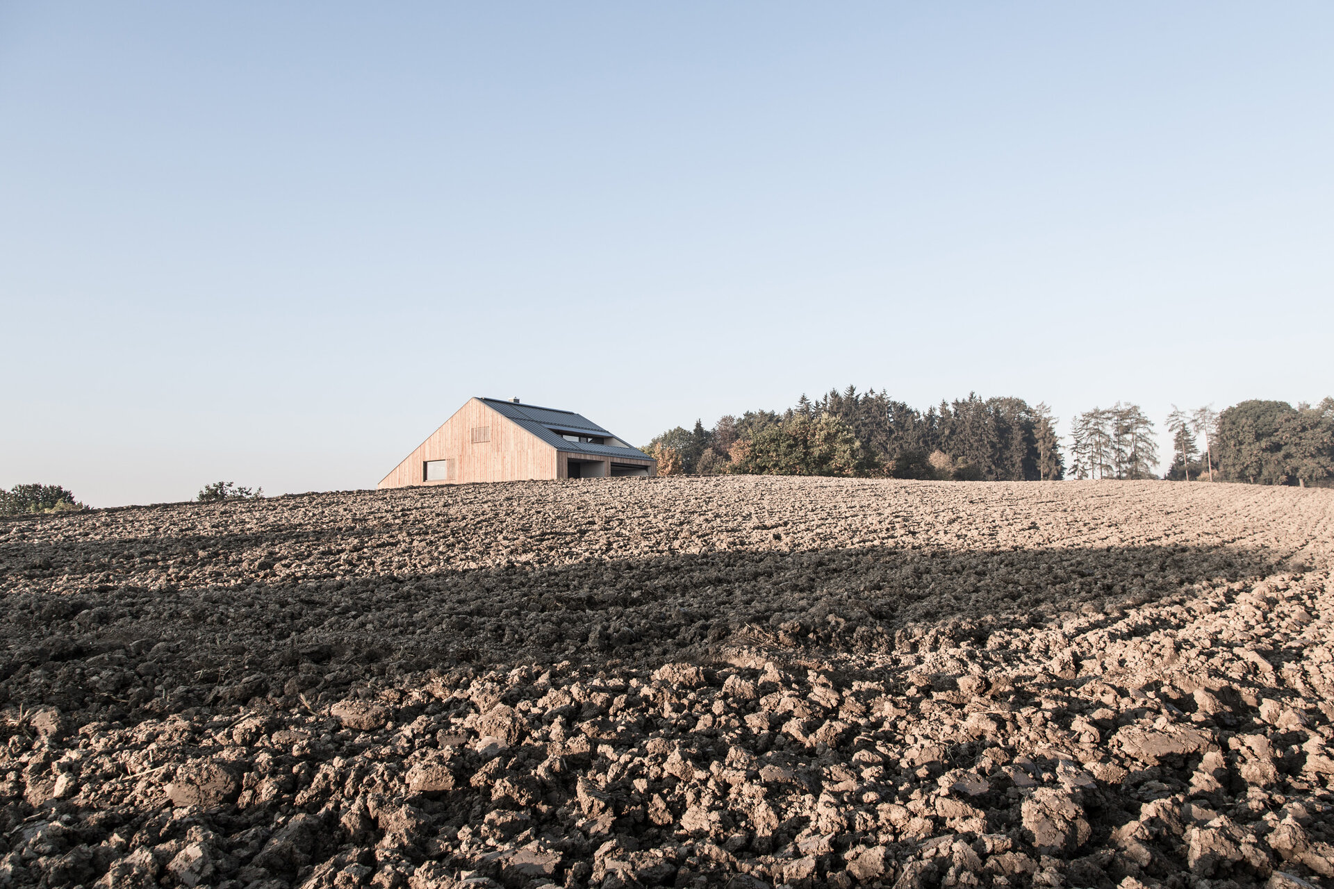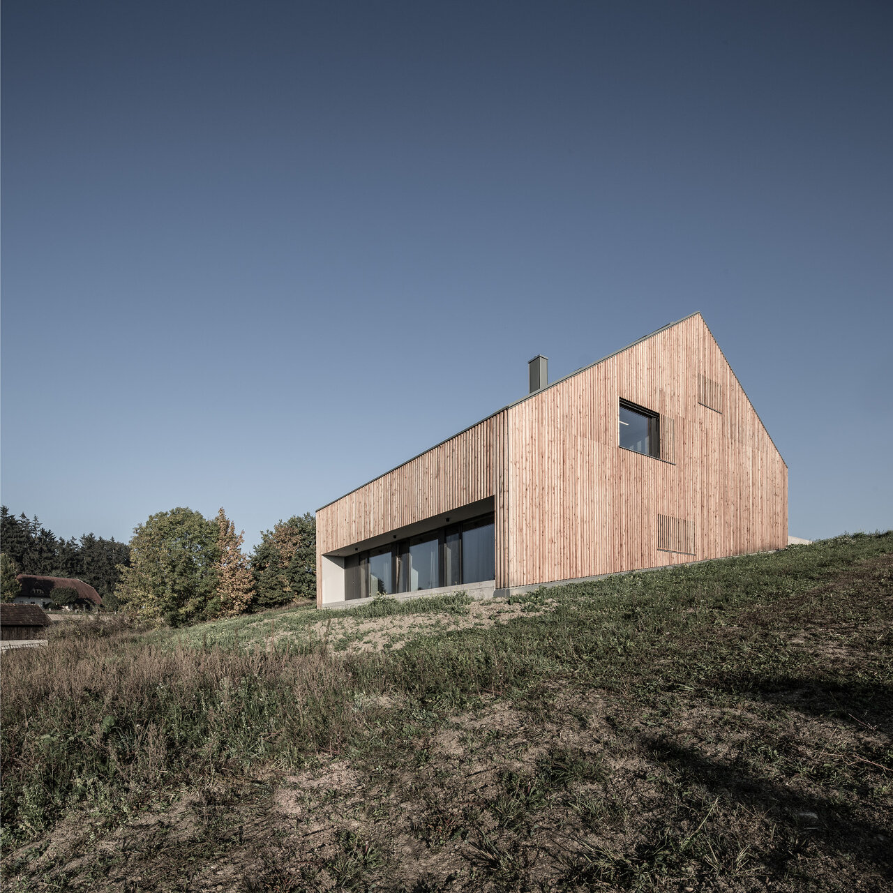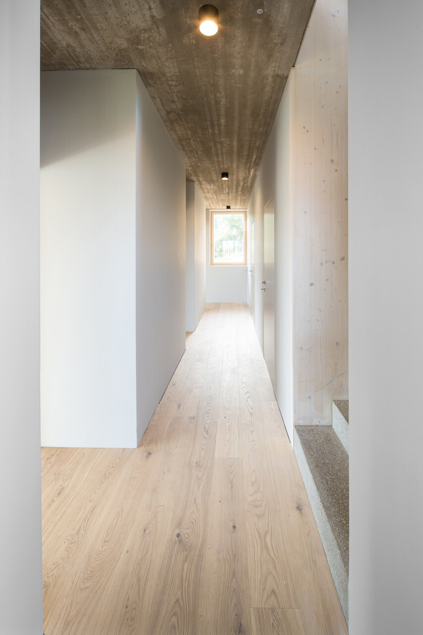 Die erdnahen Bauteilen wurden massiv konstruiert und das Dachgeschoß mit Satteldach in Holzskelettbau errichtet. Unbehandelte naturbelassene Hölzer wurden im Innenausbau angewendet. Die verbauten Materialien und Oberflächen sind pur und robust. Die Sichtbetondecke zum Untergeschoß wurde mit Holzbrettern geschalt und roh belassen. Die Fassade wurde mit einer sägerauen unbehandelten Deckelschalung aus Lärche ausgeführt. Tiefen, Schatten und Rhythmus prägen die Erscheinung. Je weniger Elemente ein Gebäude erfordert, umso gravierender ist die Entscheidung für die Notwendigen. (Text: Architekt)