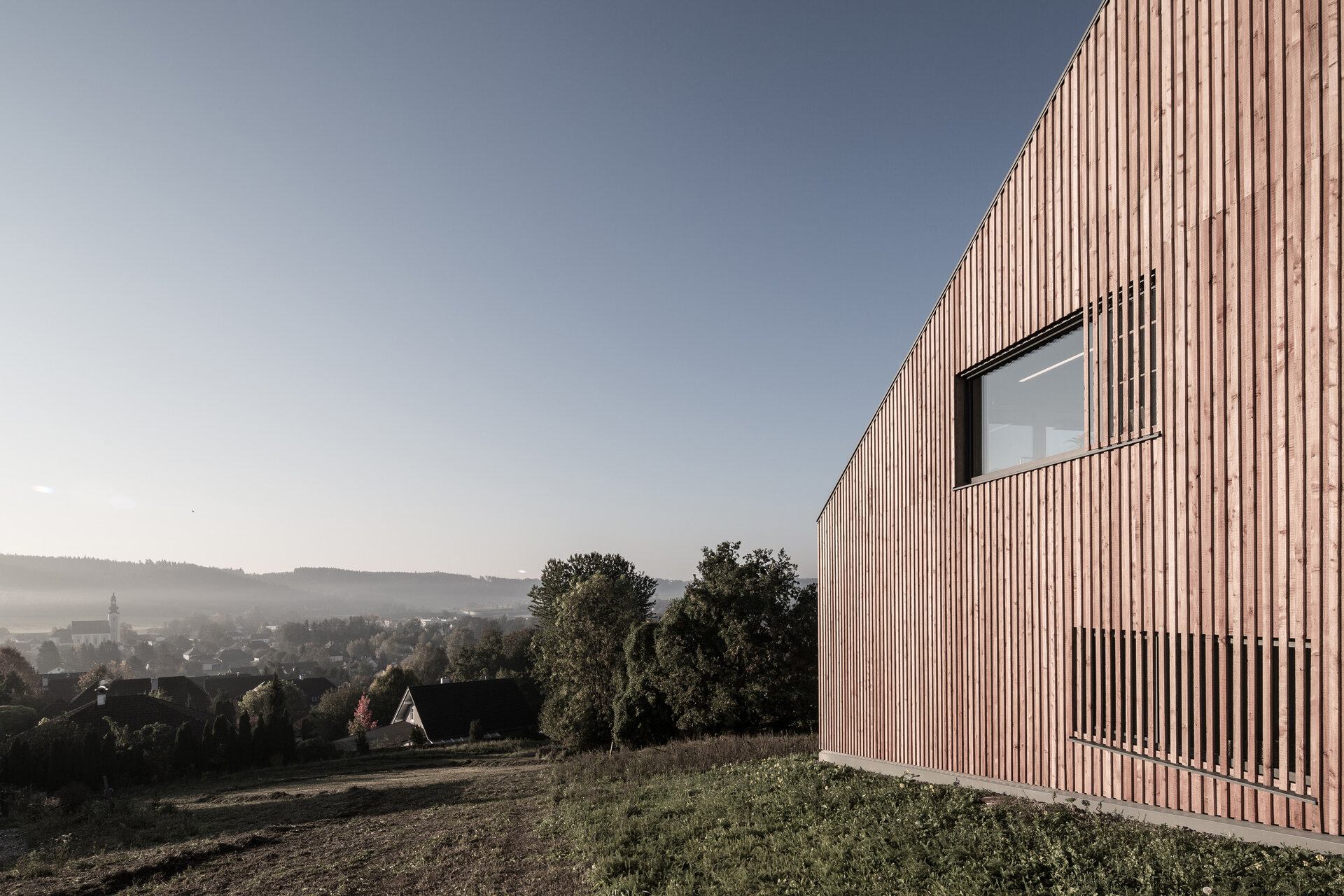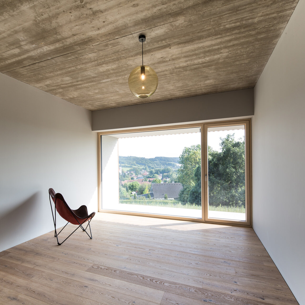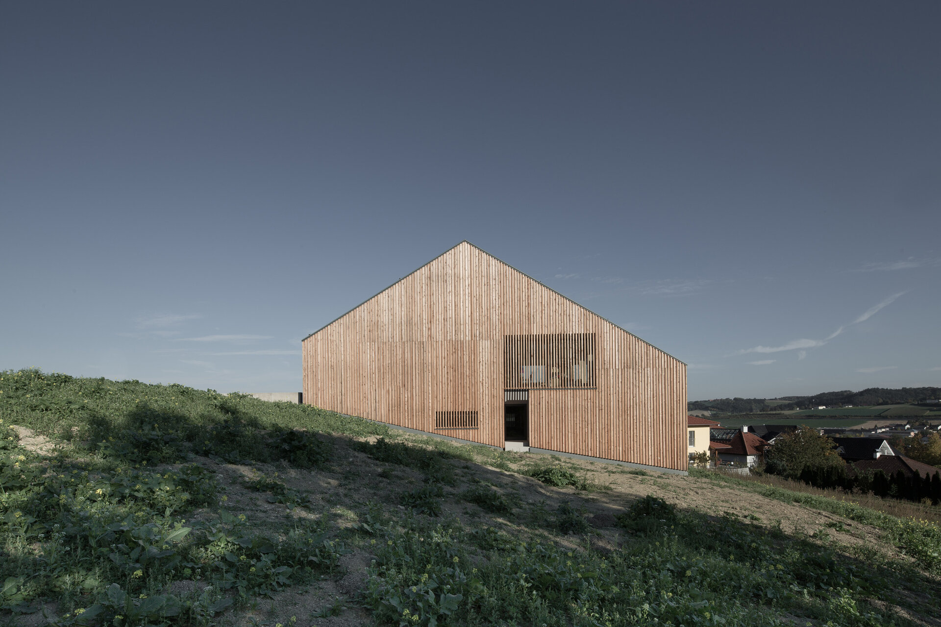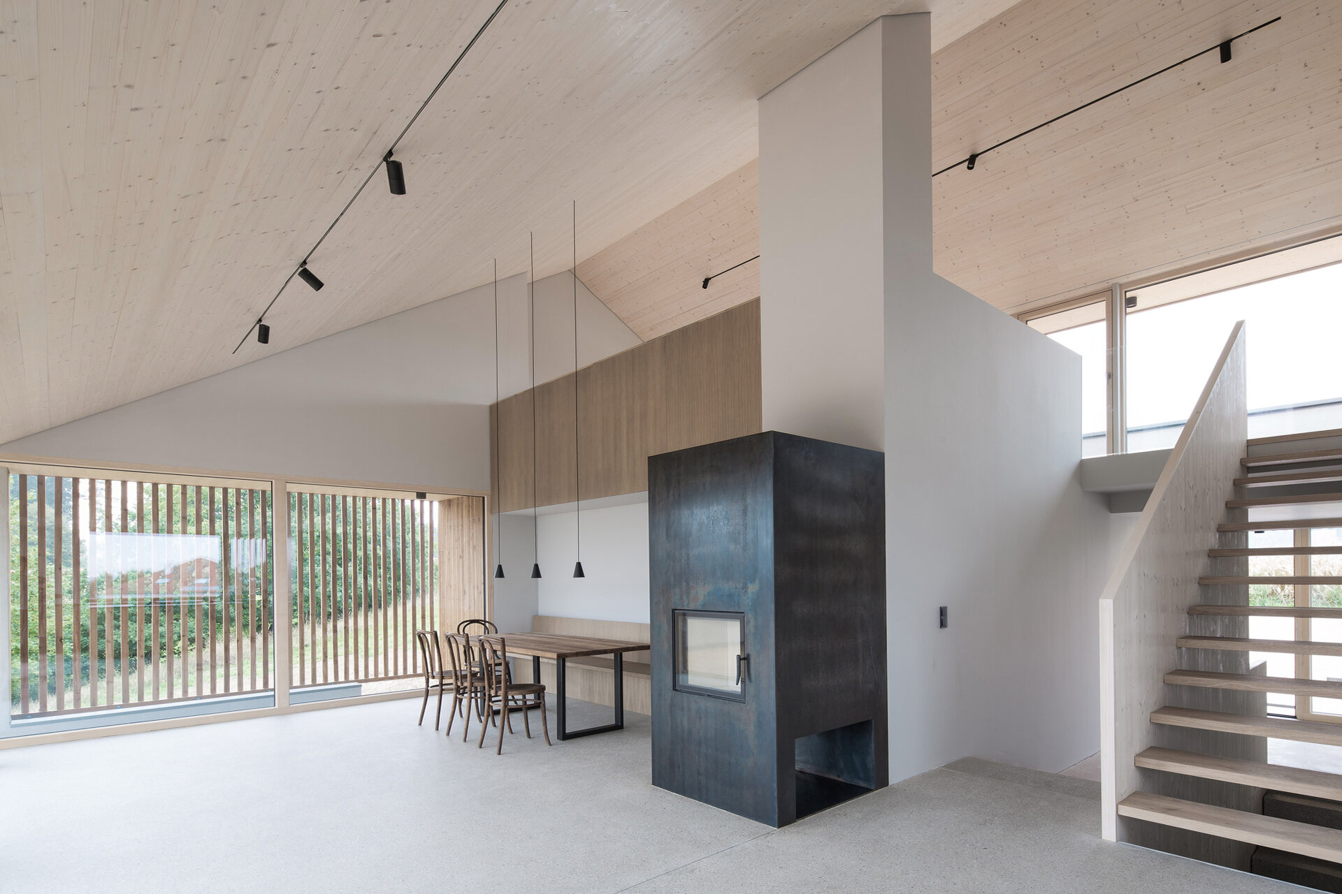 Die erdnahen Bauteilen wurden massiv konstruiert und das Dachgeschoß mit Satteldach in Holzskelettbau errichtet. Unbehandelte naturbelassene Hölzer wurden im Innenausbau angewendet. Die verbauten Materialien und Oberflächen sind pur und robust. Die Sichtbetondecke zum Untergeschoß wurde mit Holzbrettern geschalt und roh belassen. Die Fassade wurde mit einer sägerauen unbehandelten Deckelschalung aus Lärche ausgeführt. Tiefen, Schatten und Rhythmus prägen die Erscheinung. Je weniger Elemente ein Gebäude erfordert, umso gravierender ist die Entscheidung für die Notwendigen. (Text: Architekt)
