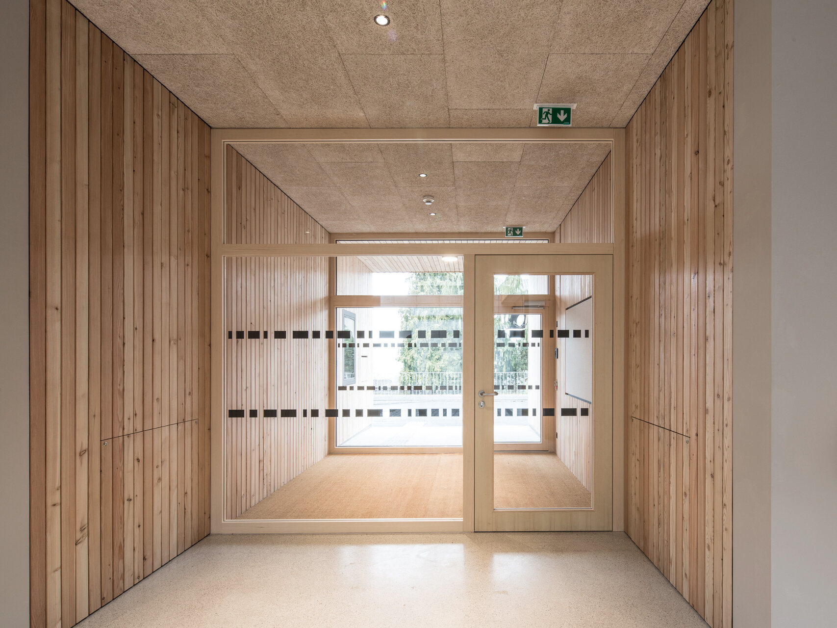 Wolf Architektur/Kienesberger haben die beiden Geschoße zweihüftig angelegt. Der Kindergarten wird auf seiner unteren Ebene an der Westseite von der ruhigen Fürstenhagenstraße und über einen neuen, von der Anhöhe vor dem Stift herabführenden Fußweg erschlossen. Der Haupteingang befindet sich in einem witterungsgeschützten Einschnitt und führt über einen Windfang direkt in den zentralen Erschließungsbereich. Gleich beim Eintreten fällt der Blick in einen Spielhof, der den Gang mit Tageslicht erfüllt. Der Hof belichtet auch den multifunktionalen Raum, in dem die Kinder ihr Mittagessen einnehmen, auf der einen und den Ruhe- und Bewegungsraum auf der anderen Stirnseite des Hauses. Straßenseitig sind links vom Haupteingang die Räume der Krabbelstube untergebracht. Rechts davon reihen sich zunächst das Zimmer der Leiterin, der Personalraum und ein Gruppenraum aneinander. Im Obergeschoß finden sich drei Gruppenräume, die einen Ruhe- und Bewegungsraum in die Mitte nehmen und an der Nordostecke des Hauses von einer großen überdachten Terrasse ergänzt werden. Den Gruppenräumen in beiden Geschoßen sind ebenfalls gedeckte Terrassen vorgelagert, über die man in den Garten gelangt. Spätestens hier verwandelt sich die anspruchsvolle Topografie des Bauplatzes vom Kosten- in einen nicht zu unterschätzenden Gestaltungsfaktor.