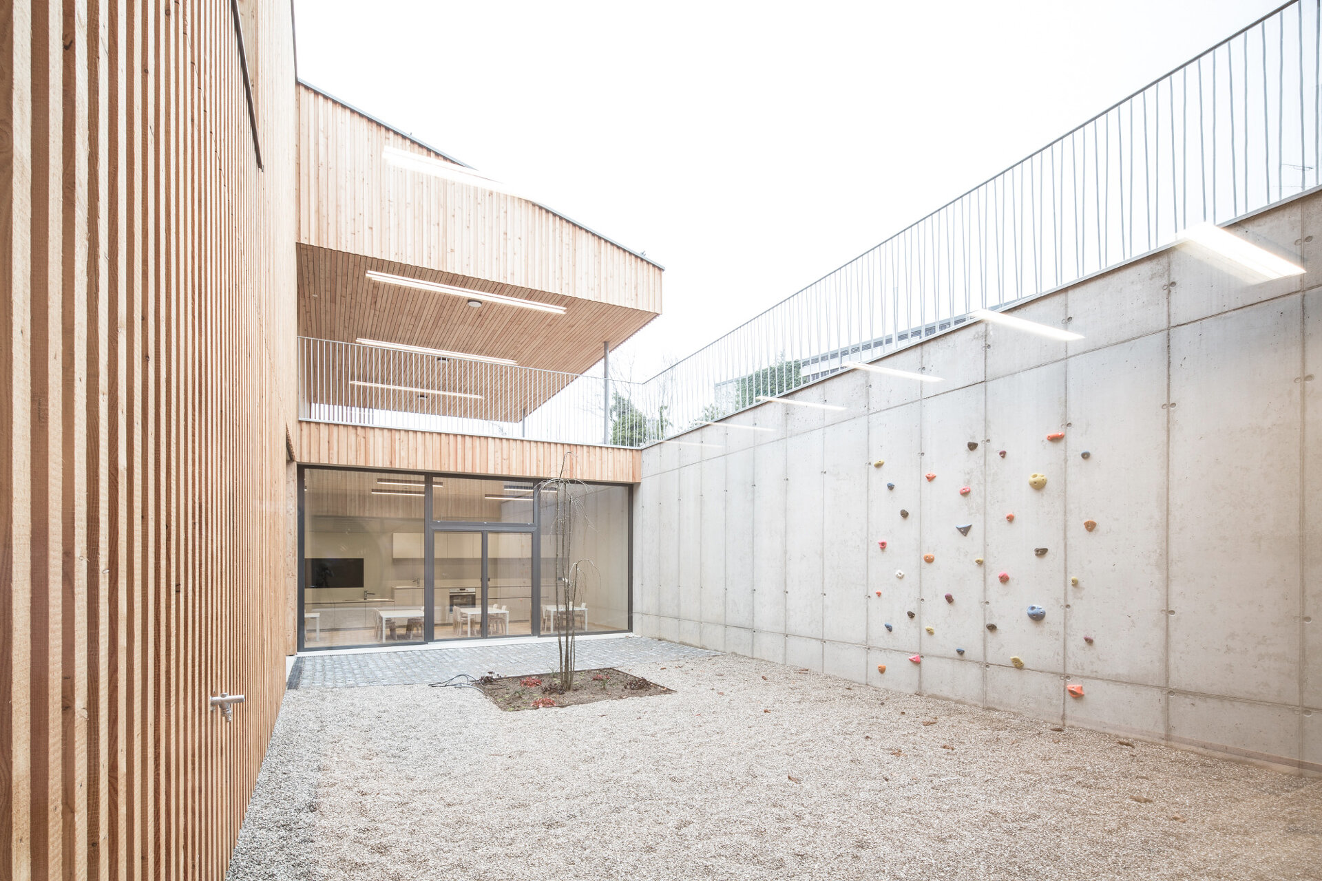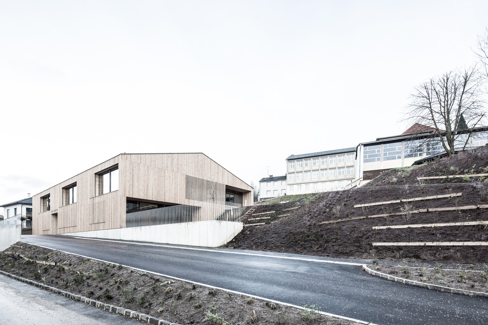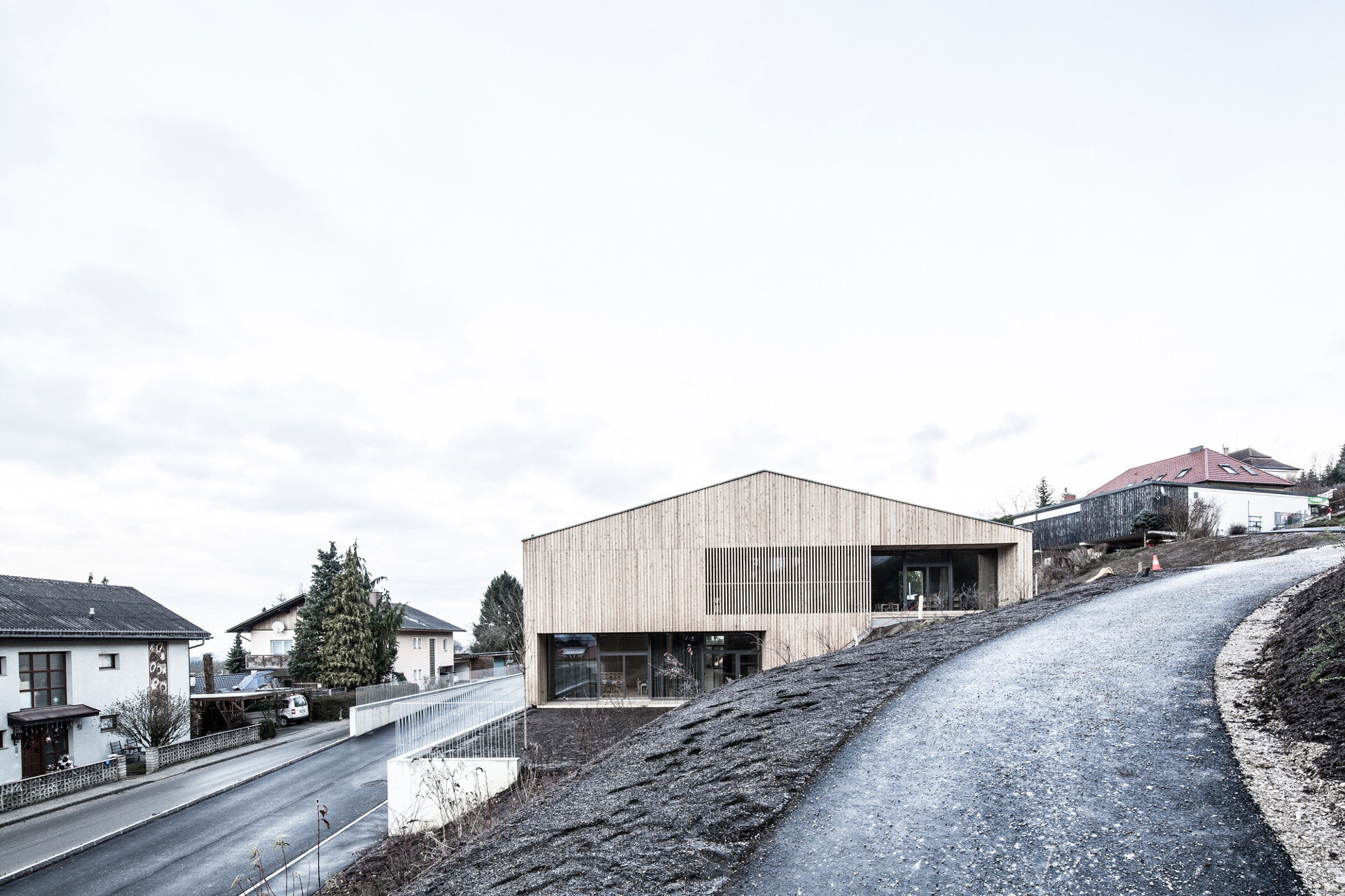 Wolf Architektur/Kienesberger setzten einen geometrisch sehr einfach anmutenden zweigeschoßigen, von einem Satteldach abgeschlossenen Körper so an eine Geländekante, dass seine beiden Ebenen direkt an das Terrain angebunden sind. Die vom schlichten Umriss ausgesendete, leicht lesbare Botschaft „Haus“ ist dem Wunsch der Architekten geschuldet, nichts Ortsfremdes in das zwischen den öffentlichen Gebäuden oben am Hang und den Siedlungshäusern weiter unten aufgespannte Umfeld zu setzen. Es versteht sich von selbst, dass die aus Freiraum wie aus Gebäude komponierte Anlage ruhig und einfach wirkt, aber als Ergebnis einer Vielzahl verschränkter Erzählstränge eine komplexe Angelegenheit ist.