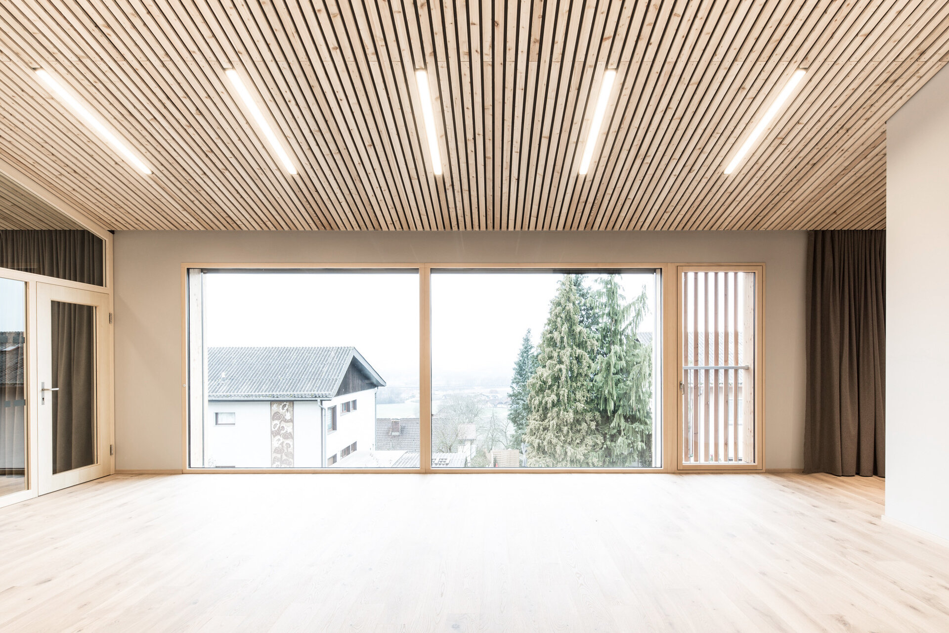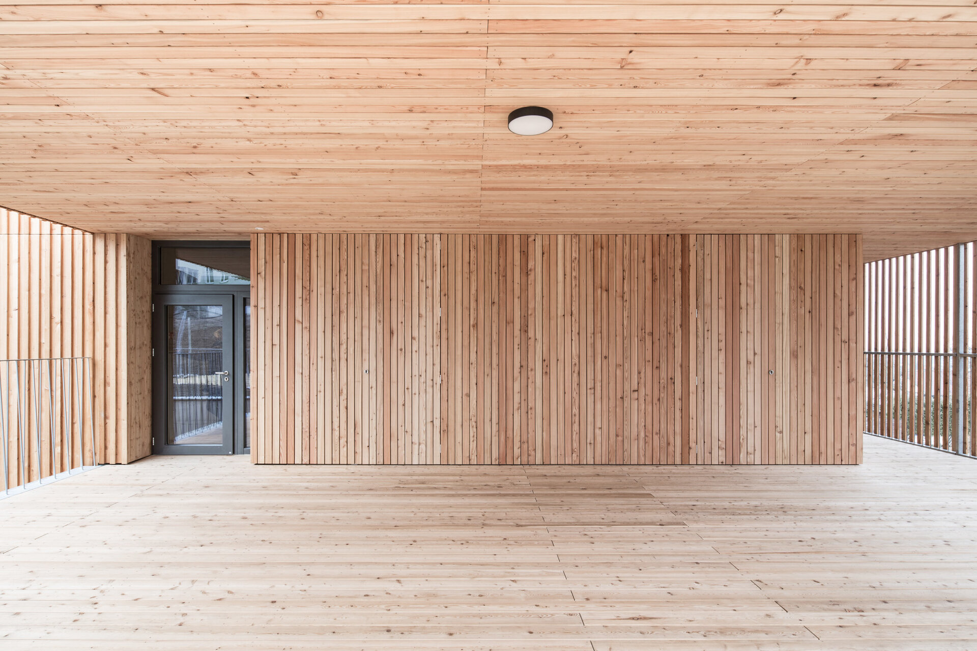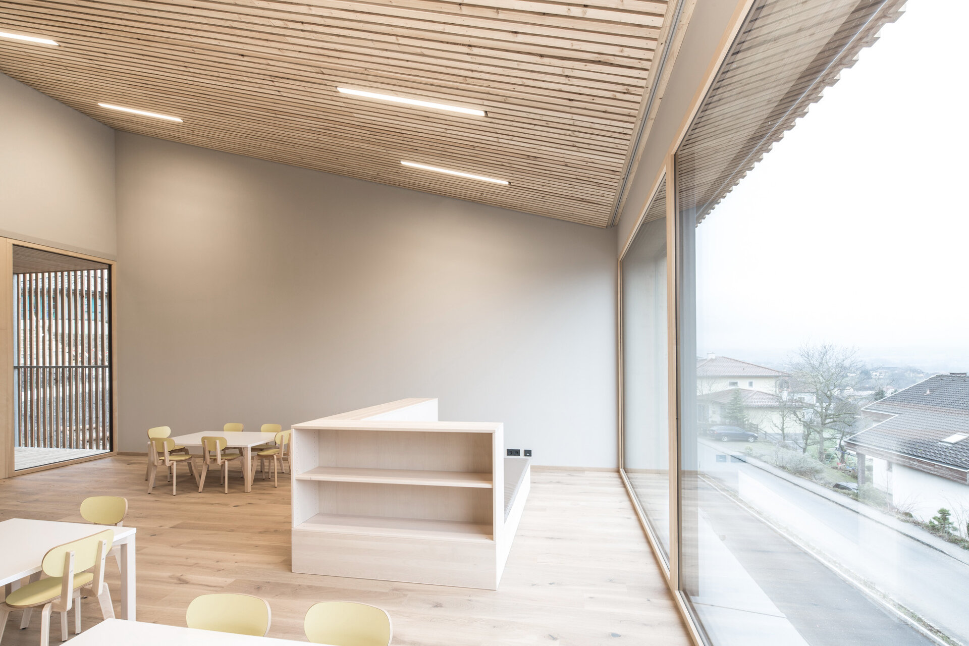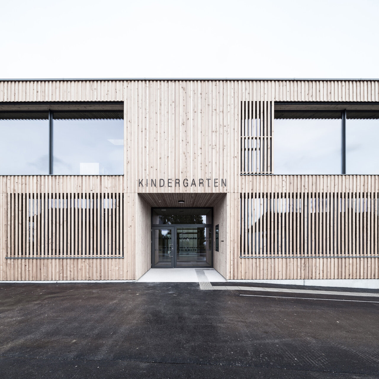 Der Bewegung, die aus der Geländeformation in die Anlage hineinwirkt, haben Wolf Architektur/Kienesberger mit einer überaus disziplinierten Ausformung des Gebäudes geantwortet. Dem Außenraum wendet das Haus homogen wirkende Flächen zu, die zwar von Öffnungen und Rücksprüngen strukturiert werden, ihren Zusammenhalt jedoch nicht verlieren. Der souveräne Umgang mit dem Baustoff Holz, im Außenauftritt durch die vertikal gegliederte Fassade aus sägerauem Lärchenholz prominent gezeigt, im Inneren des Kindergartens mit den Böden, den Glasportalen, dem eigens entwickelten Mobiliar und der Untersicht des Satteldaches präsent, beweist, dass eine ökologisch verantwortungsbewusste Haltung in der Wahl der Technologien ohne Einbußen an Eleganz möglich ist. Der Gemeindekindergarten in Schlierbach ist zweifellos funktionstüchtig, robust und wirtschaftlich; er fügt sich nahezu lautlos in sein Umfeld. Doch gerade im Leisen, Unaufgeregten, Sanften liegt die im Wortsinn feine Grenze zur Baukultur.