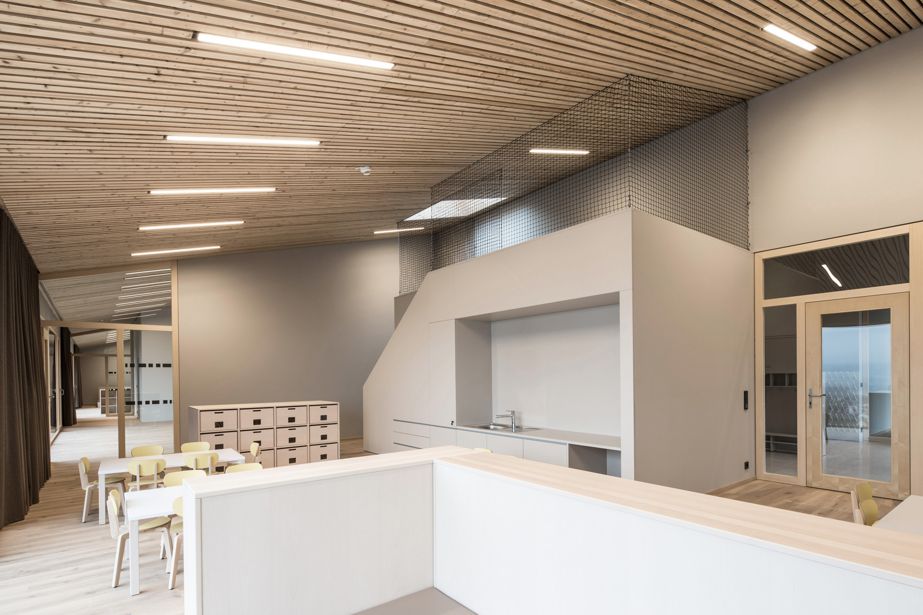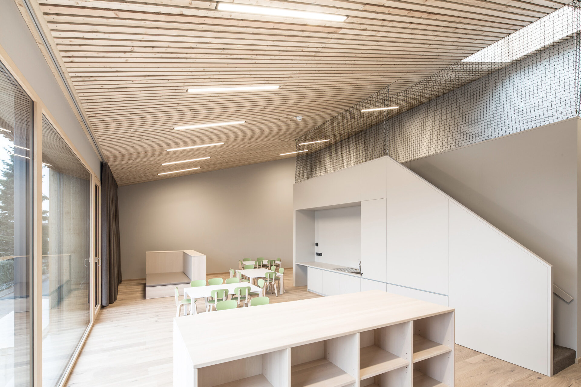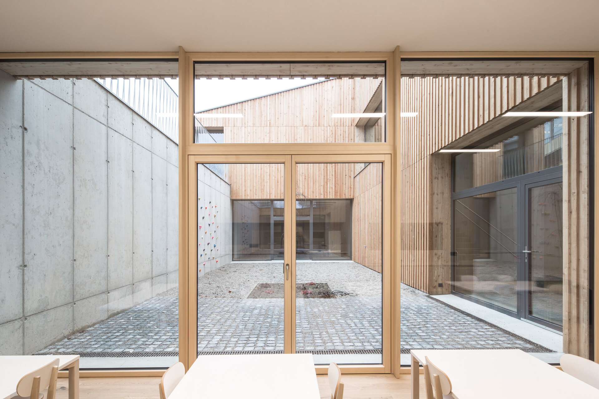 An erster Stelle nach der getroffenen Standortwahl standen die Überlegungen zum reibungslosen Ineinandergreifen der vielfältigen Anforderungen an das Haus: Die Räume müssen auf die Körpergröße und die Fähigkeiten kleiner, im Bereich der Krabbelstube sehr kleiner Kinder abgestimmt sein. Gleichzeitig sind die Bedürfnisse der Pädagogen zu berücksichtigen, die sich etwa mit den allseits beliebten, für sie leider nur auf allen vieren betretbaren Spielhäuschen schwertun. Es soll gespielt, gelernt, gekocht, gegessen und geschlafen werden. Am zeitlich individuell gestaffelten Ende des Tages ist eine geordnete Übergabe der Kinder an die Eltern zu organisieren. Feste wollen gefeiert werden, allerlei Administratives ist auch zu erledigen. Nicht zuletzt muss man jederzeit draußen spielen, aber hurtig das WC aufsuchen können, ohne Schmutz ins Haus zu tragen. Inspiration, Freiraum und Geborgenheit sind ebenso wichtig wie Sicherheit, Hygiene und Kontrolle.
