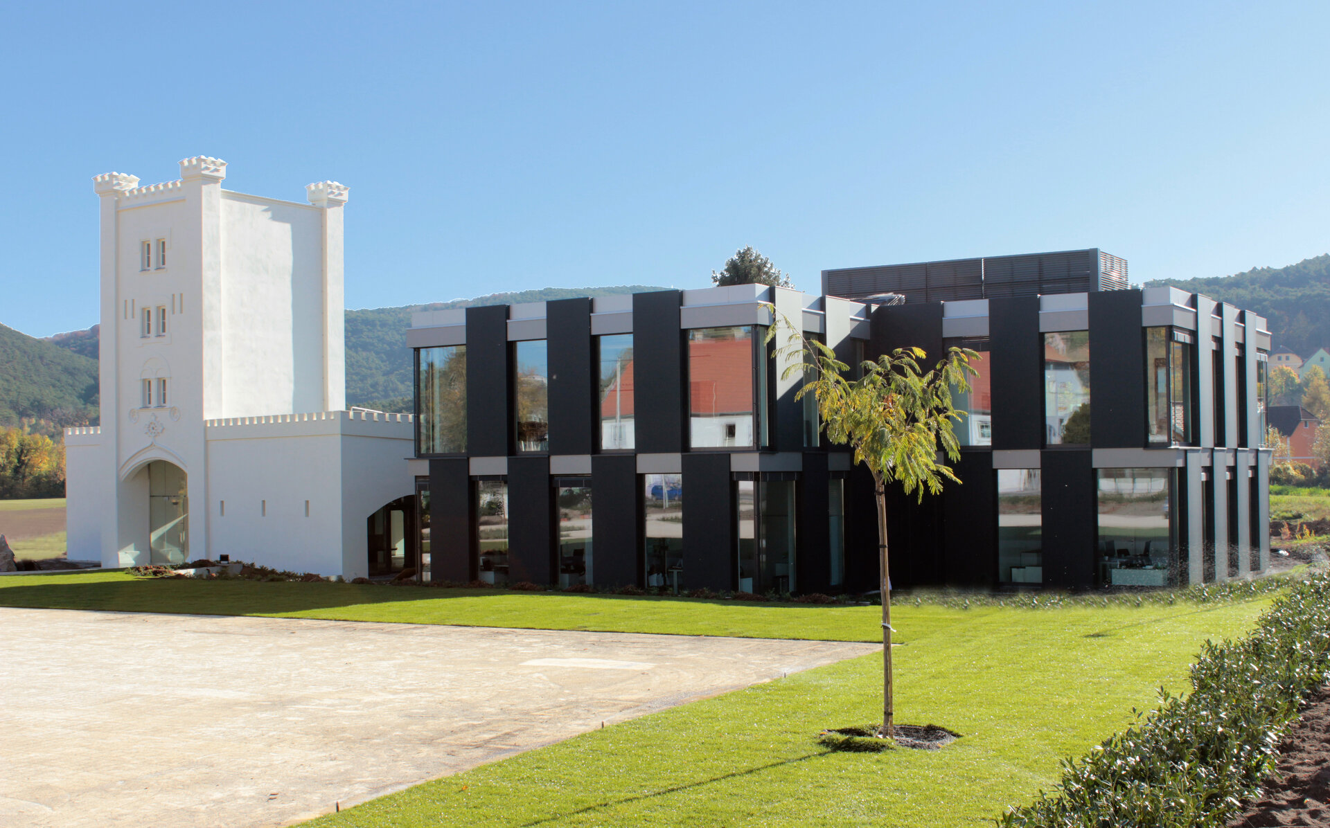 Stahlbeton ausgeführt sind. Die hinterlüftete Fassade aus Aluminium-Verbundplatten assoziiert in Abwechslung mit den großen Glasflächen die Turmzinnen. Das Flachdach ist extensiv begrünt. Terrassen in beiden Geschoßen, die Freiraumgestaltung mit Gehwegen und auch bei den Parkplätzen bieten hohe Aufenthaltsqualität und erinnern an die Atmosphäre aus früheren Zeiten. (Text: Architekt:innen, bearbeitet)