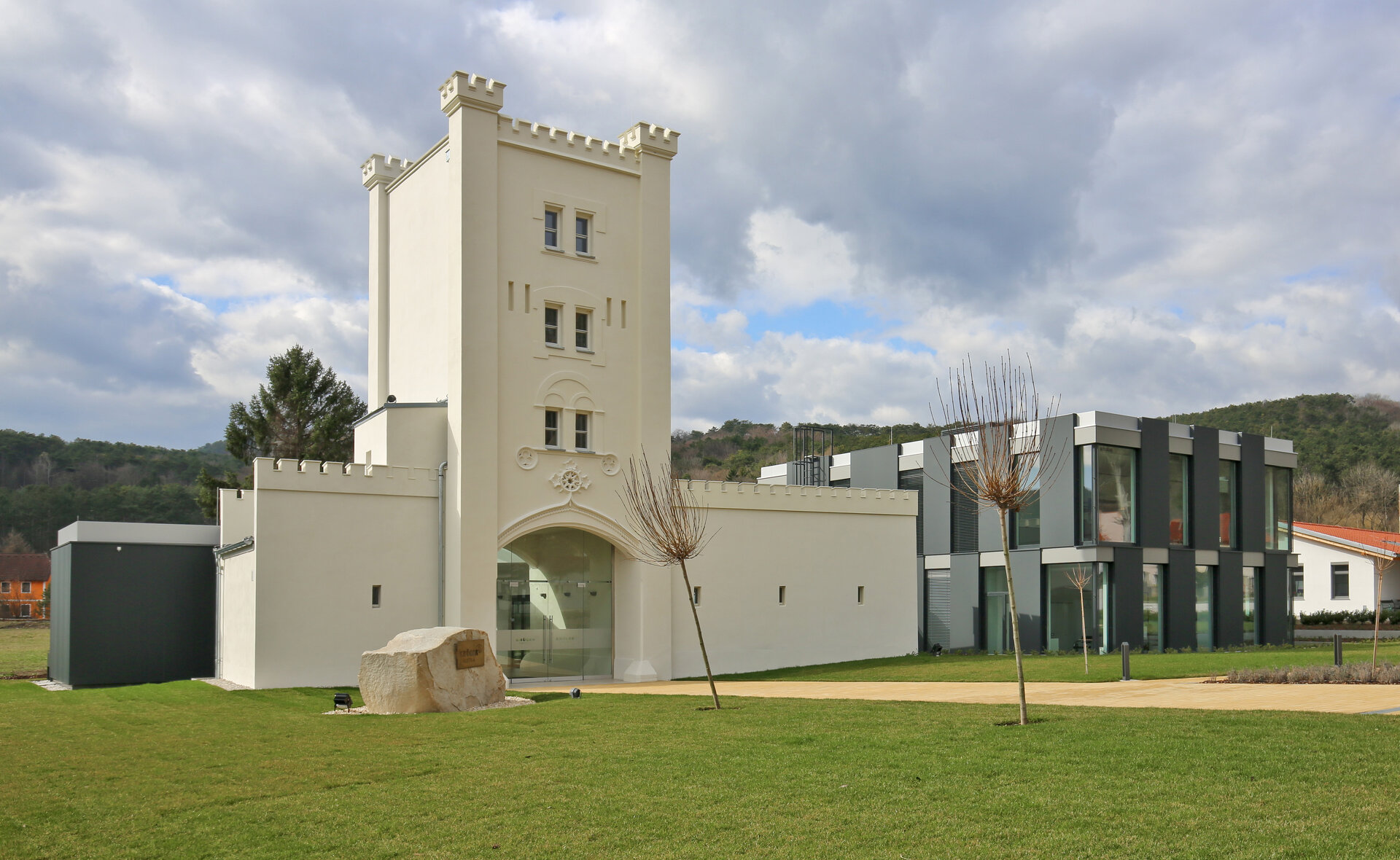 Als Bürostandort revitalisiert, schließt nun an den sorgfältig restaurierten Turm ein Neubau an. Eingangsportal, ein Besprechungsraum und die zentrale Erschließung bleiben im Turm, über das Foyer wird zum Empfang und Ausstellungsbereich in den Büroneubau geleitet. Der Turm wurde trockengelegt, ausgeheizt, der Verputz mit handgemischten Strass-Kalkmörtel ausgebessert, die Zinnen einzeln ausgelöst, beschädigte Teile neu geformt und mit den erhaltenen, ursprünglichen Zinnen neu versetzt. Inklusive Verzierungen ist er wieder einheitlich, wie ursprünglich vorgesehen, in Kalkfarbe gestrichen.