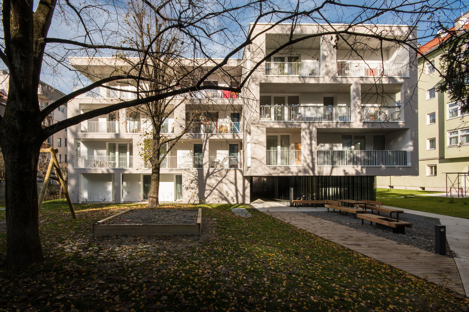 Der über einem leicht z-förmigen Grundriss ausgeführte Baukörper nimmt bestehende Achsen auf. Klar vom Bestand abgerückt und durch die reduzierte Höhe ordnet er sich der dominanten Blockrandbebauung unter. Das Erdgeschoß ist im Bereich der Fahrradabstellräume transparent ausgeführt, womit die visuelle Durchlässigkeit verstärkt wird. Mitten durch das Erdgeschoß führt ein Weg, von dem aus die jeweils fünf Wohnungen pro Geschoß über ein helles Stiegenhaus erschlossen werden. Die Wohnungen selbst wurden flexibel konzipiert, so dass etwa nachträglich eine Wohnküche abgetrennt werden kann. Kleine Gärten im Erdgeschoß und Loggien bzw. Balkone in den Obergeschoßen bieten private Freibereiche. Die offenen Loggien prägen im Wechselspiel mit versetzt positionierten Fenstern die Fassade erzeugen ein lebendiges und abwechslungsreiches Erscheinungsbild.