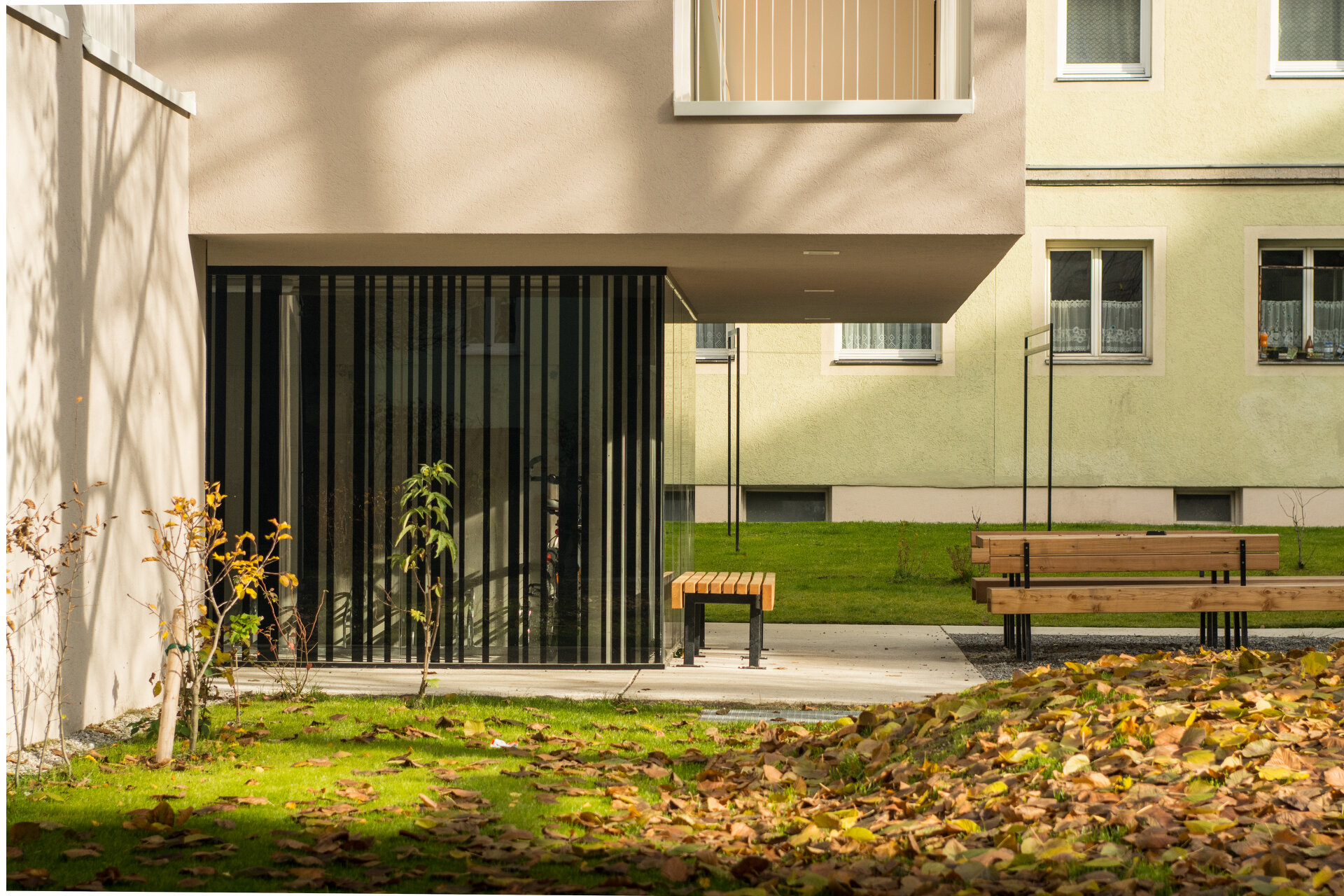 Der Hof wurde durch ein neues Wegenetz gestaltet, dass vom Durchgang in der Gumppstraße und von der Defreggerstraße aus zum Neubau führt und in Wege abzweigt, über die auch die bestehenden Gebäudeteile erschlossen werden. Neugeschaffene Freiräume wie ein platzartiger zentraler Bereich sind mit dem bestehenden Grünraum verwoben, auch die einspurige Rampe der Tiefgaragenabfahrt ist in das Gesamtkonzept integriert. (Text: Claudia Wedekind)