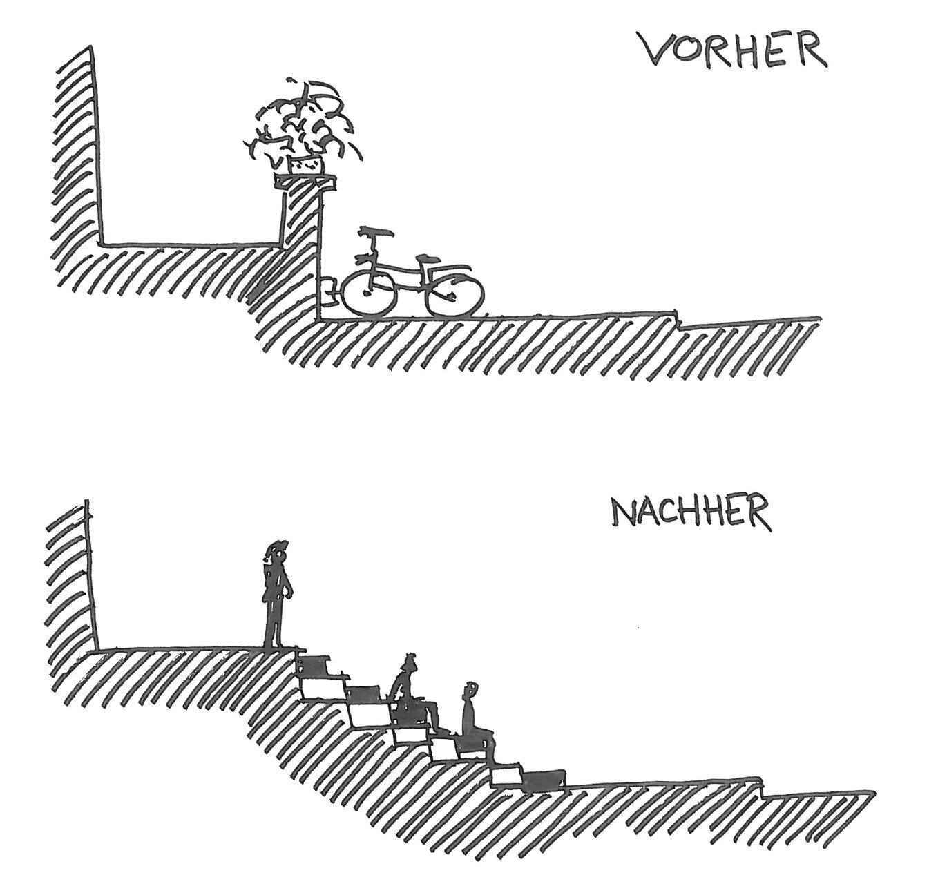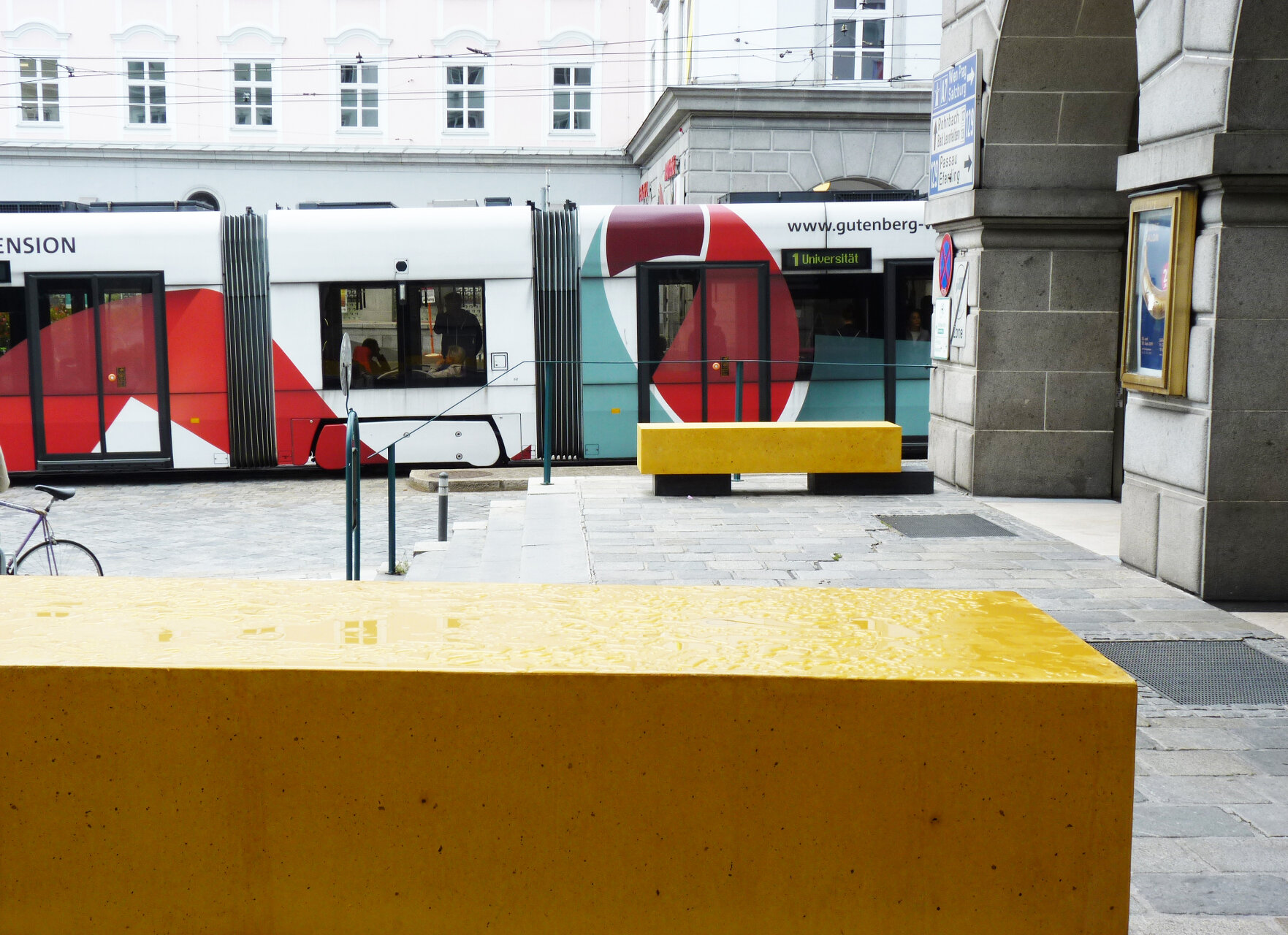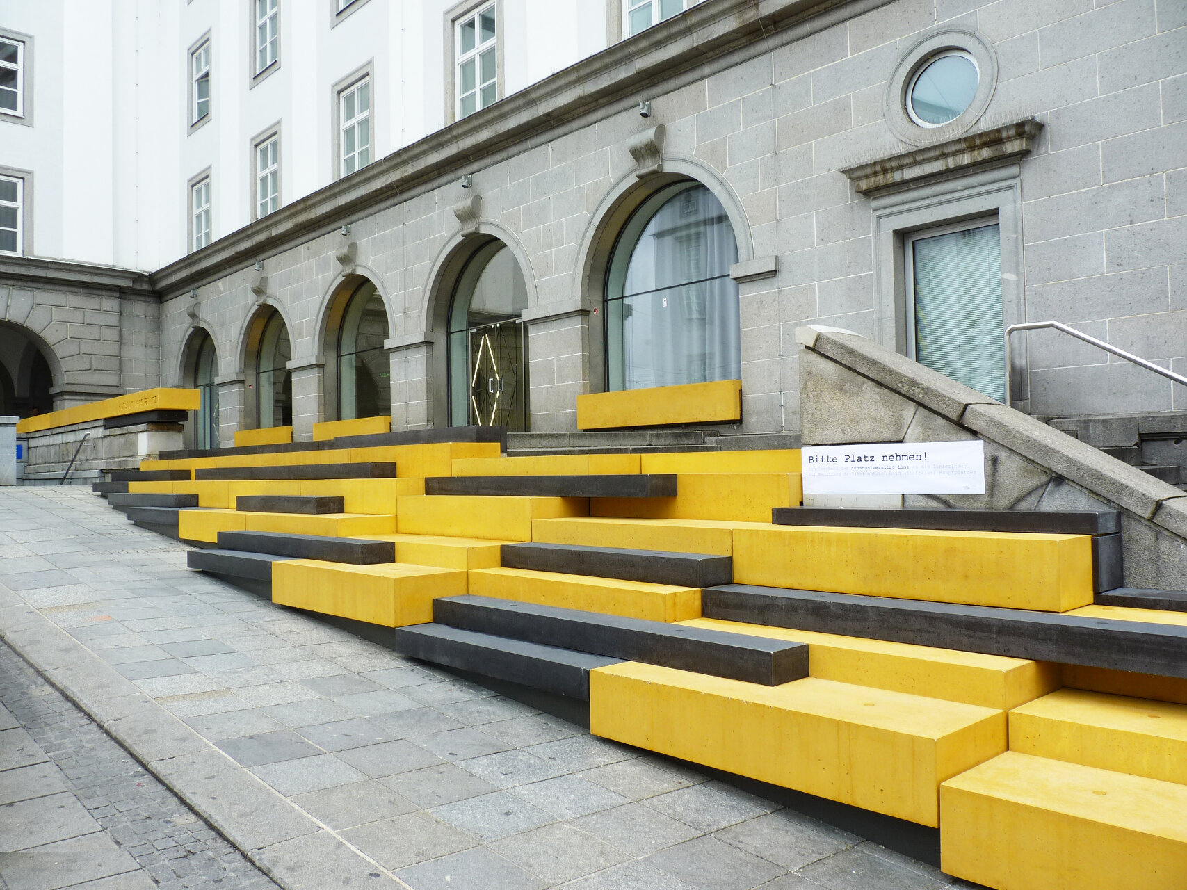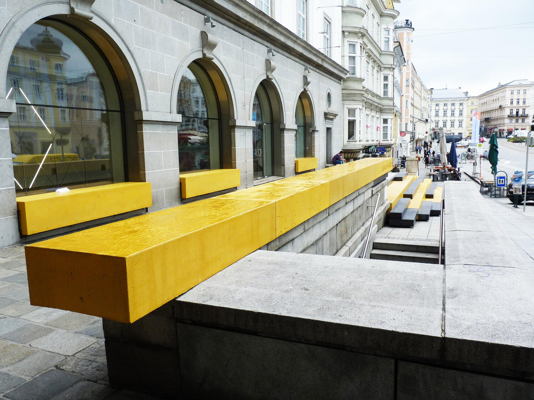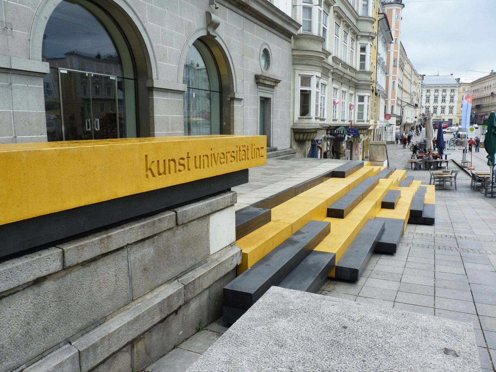 Inspiriert von den temporären Sitzstufen an gleicher Stelle bei „Linz 09“, ebenfalls von caramel, soll diese neue Stadtmöblierung die Kunstuniversität Linz sowie das „Splace am Hauptplatz“ – die Ausstellungsräumlichkeiten im Erdgeschoss der Kunstuni, zum Hauptplatz hin öffnen und umgekehrt. Die temporäre Installation soll mindestens drei Jahre zur Verfügung stehen. Im Sommer verschafft ein wenig Sprühnebel partiell Abkühlung beim Verweilen auf der urbanen Sitzlandschaft.