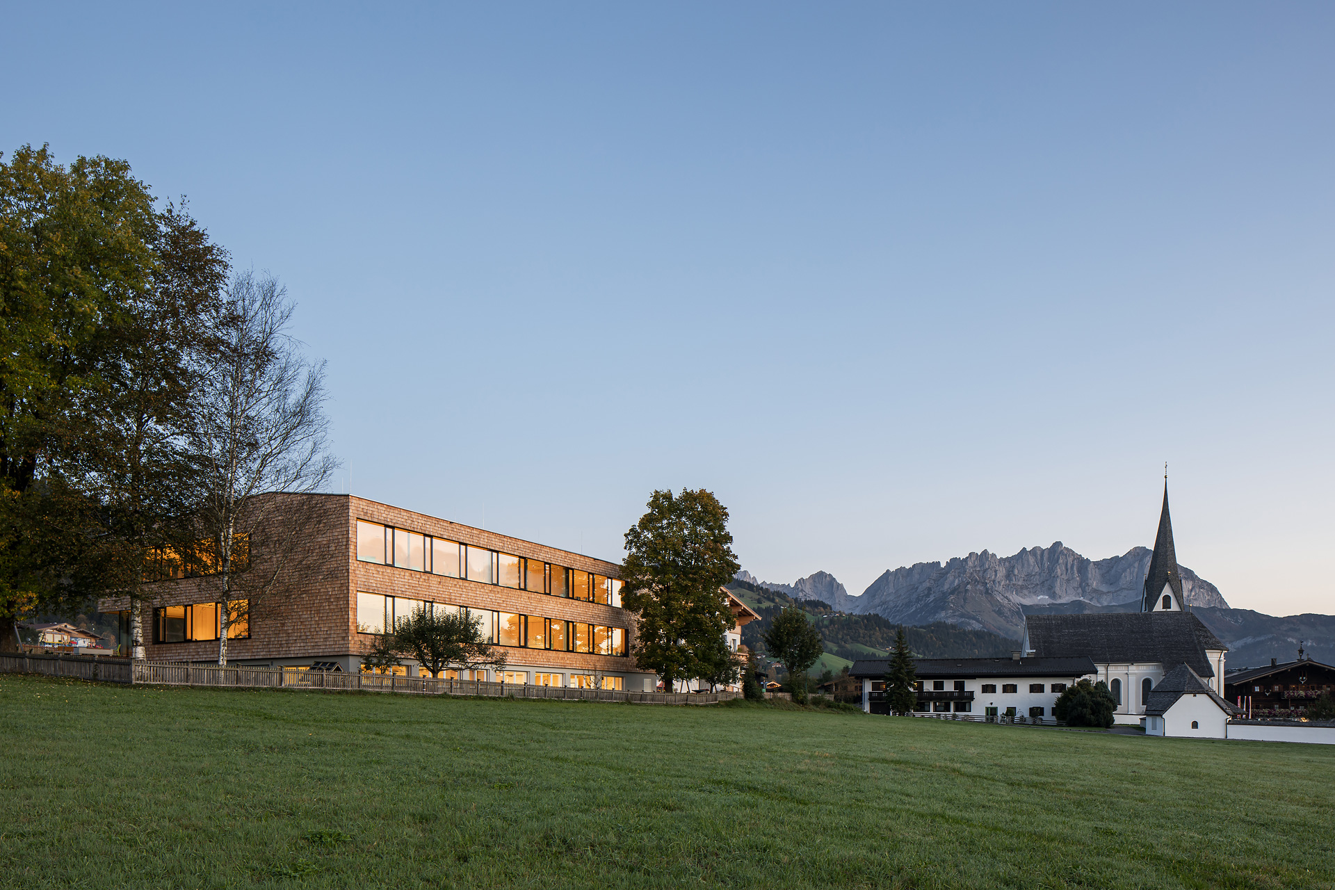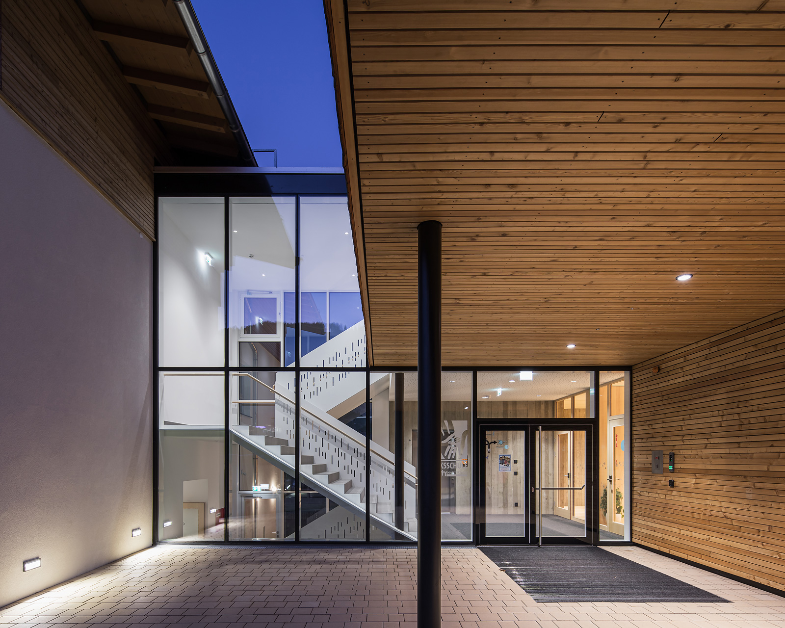 Das Gebäude ist in Hybridbauweise errichtet, mit Erdgeschoß in Stahlbeton, Obergeschoß und Dach als Holzbau. Die vorhandene Gasheizung wird weiterverwendet, aus Gründen der Energieeffizienz ein CO2– gesteuertes Lüftungssystem eingebaut. (Text: Architekten, bearbeitet)