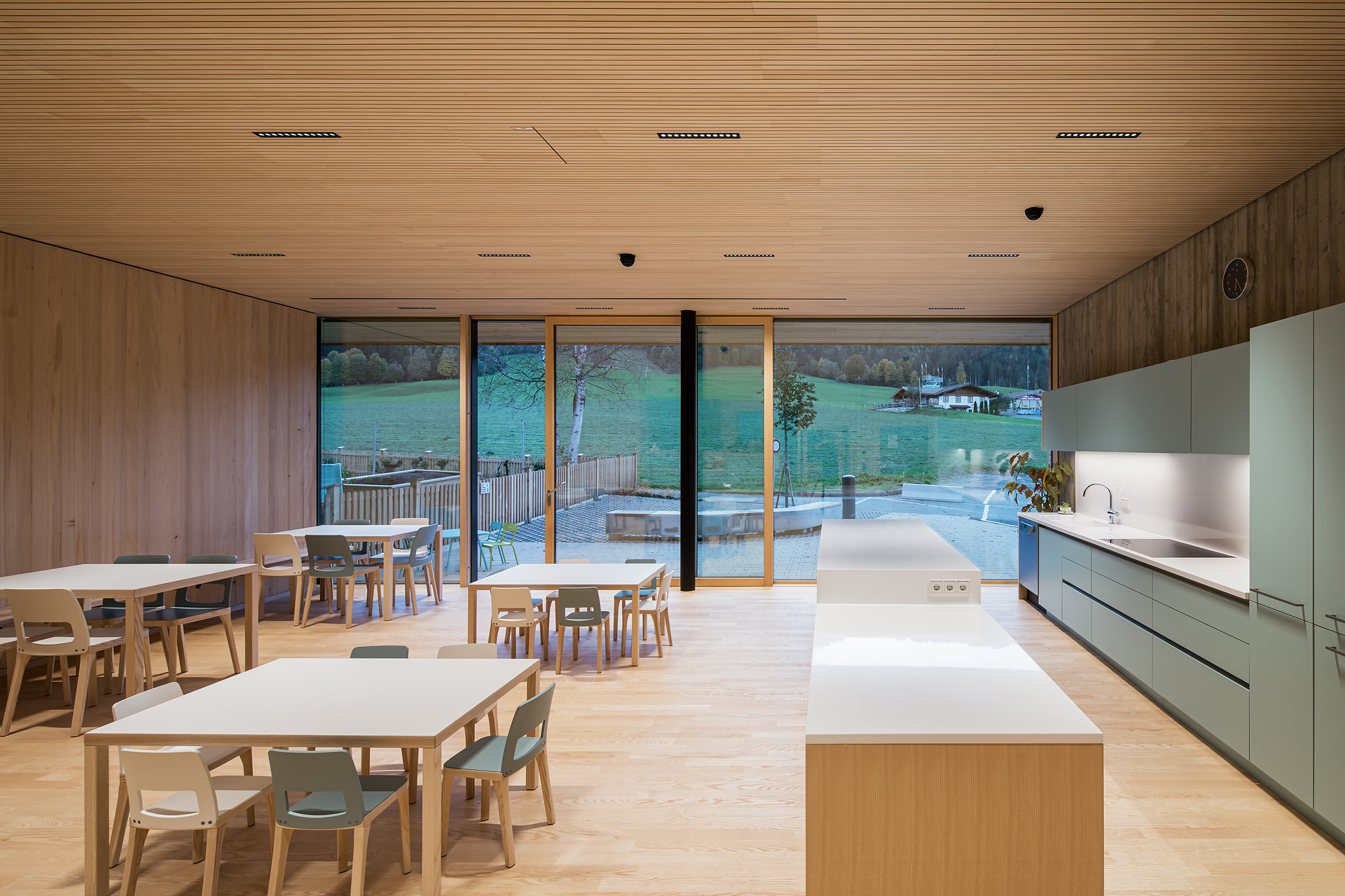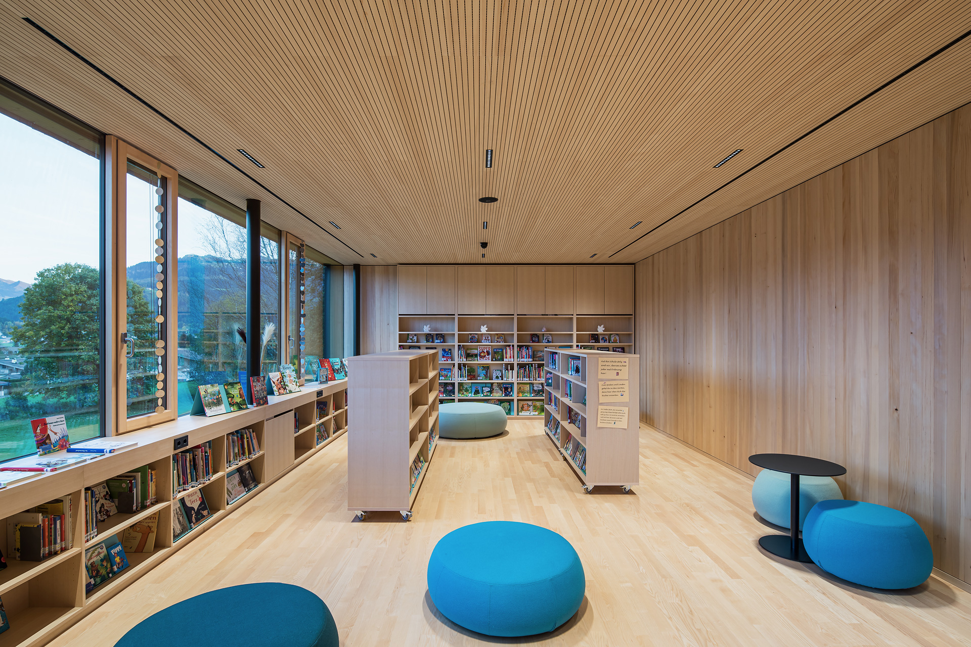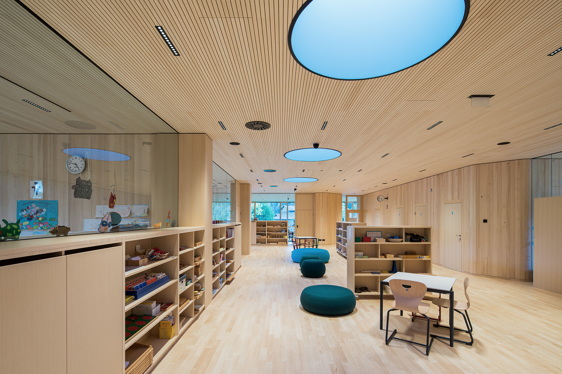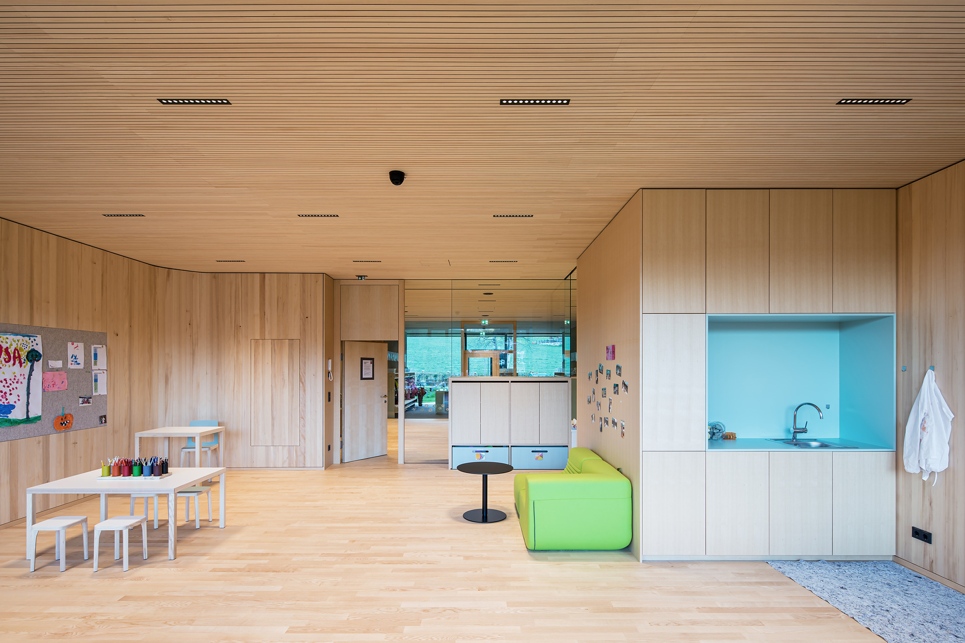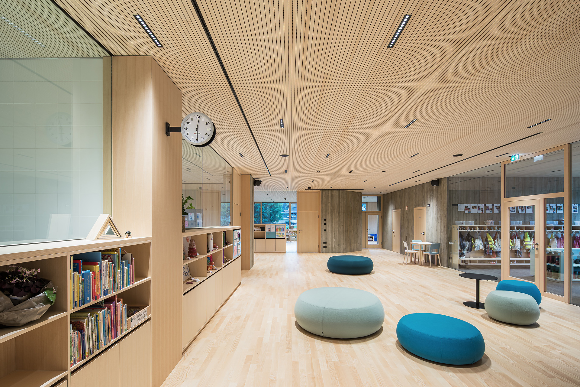 In den vorgegebenen Grundriss werden Gruppenräume und Klassen zueinander versetzt angeordnet. Die Zwischenräume bieten spannungsvolle Raumfolgen und Lichtsituationen. Im Kindergarten ergibt sich eine zentrale, allgemeine Spielzone. Die Gruppenräume erweitern sich mit großzügiger Verglasung und kindgerechten Parapethöhen zum Garten. Trennwände zur Mittelzone sind in unteren Teil als von beiden Seiten bedienbare Möbel ausgeführt. Im Obergeschoß entsteht für die Volksschule eine zentrale Lernlandschaft mit Bibliothek, die auch als Aula funktioniert. Blickbeziehungen in die Klassen und ins Freie machen diesen Bereich hell und freundlich. Die Decken und Wände aus unbehandeltem Tannenholz lassen in den Klassen Wohnzimmeratmosphäre aufkommen.