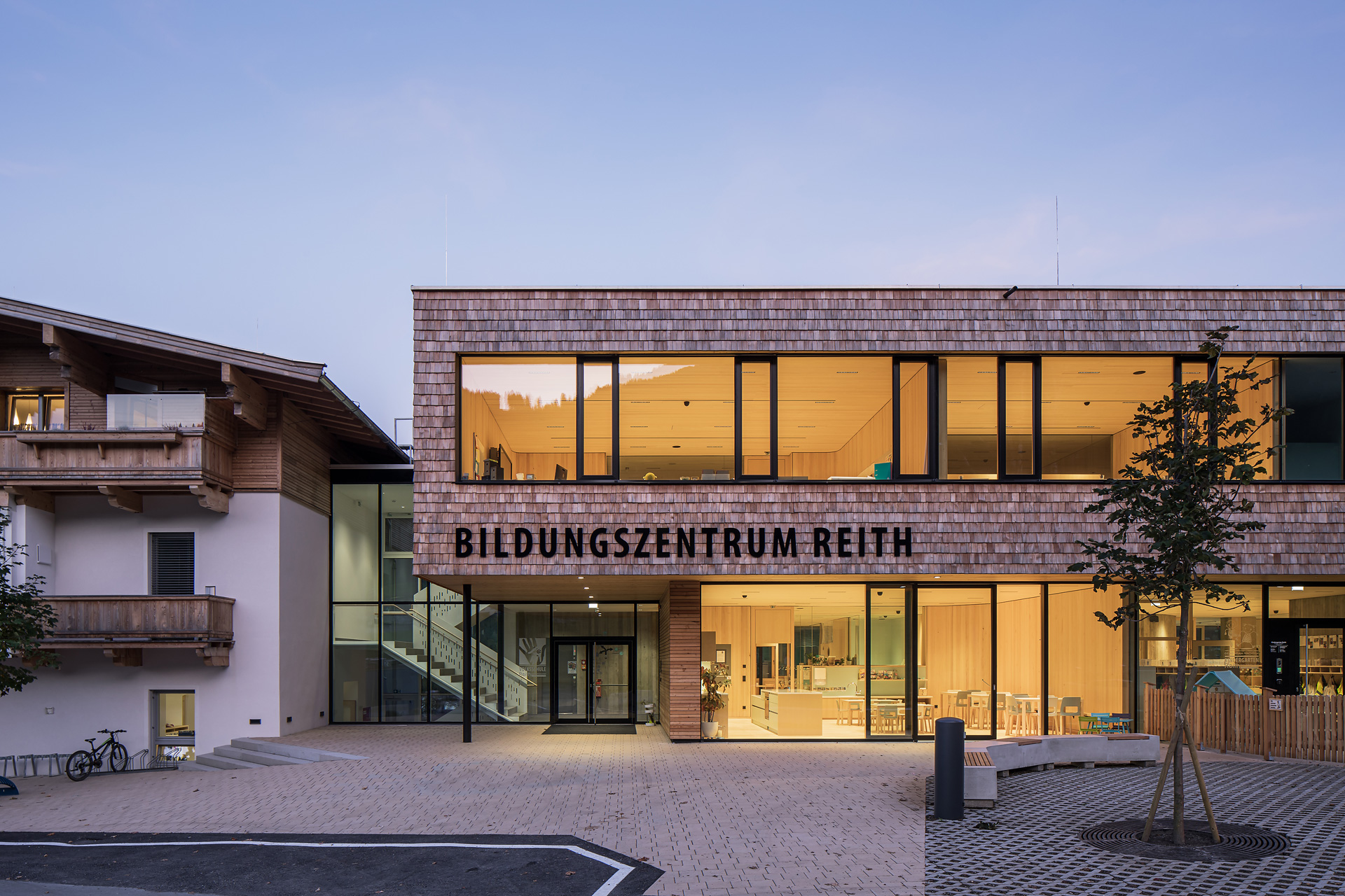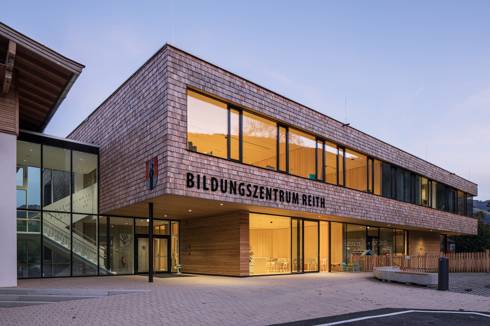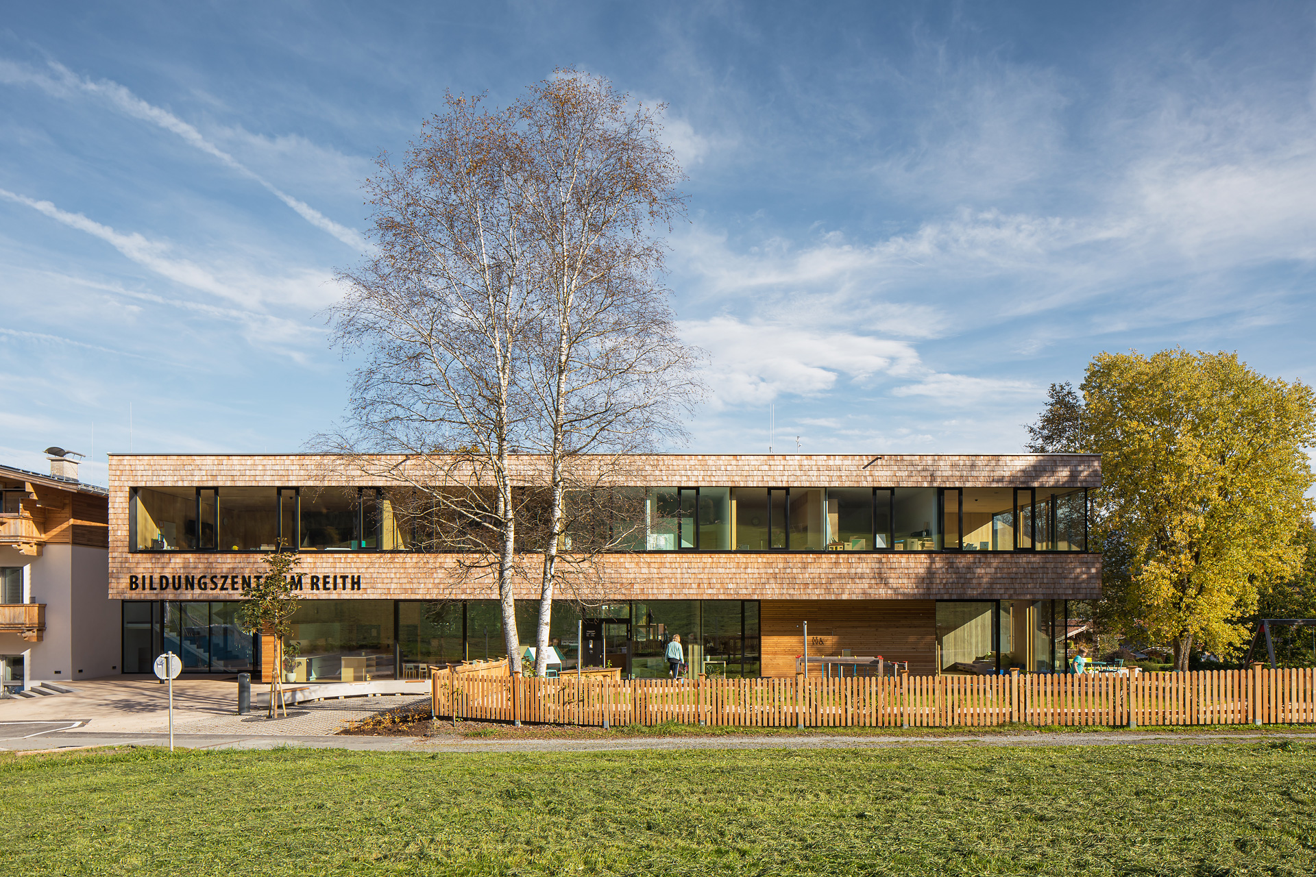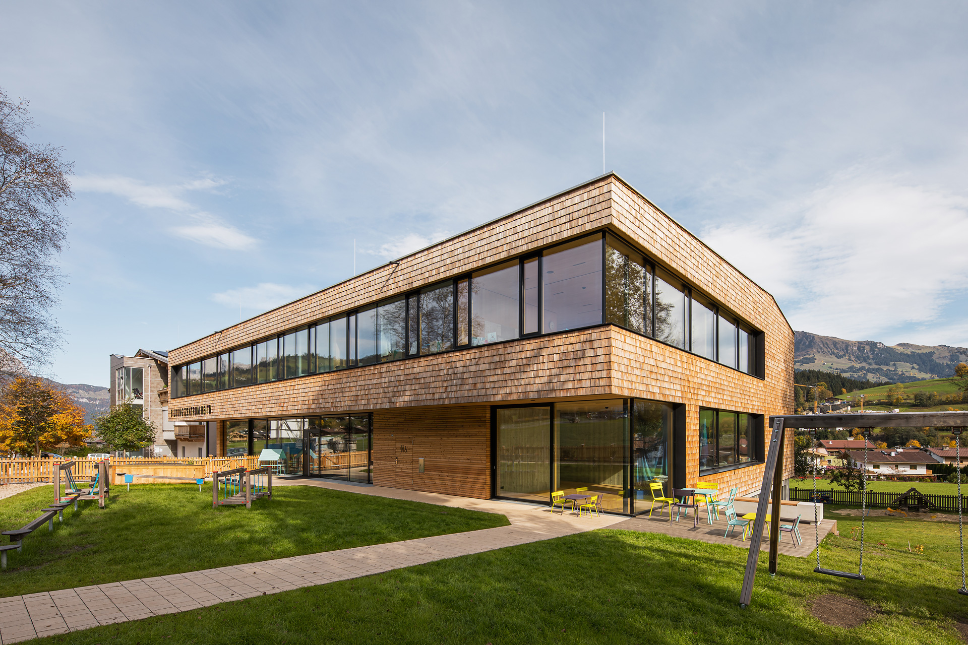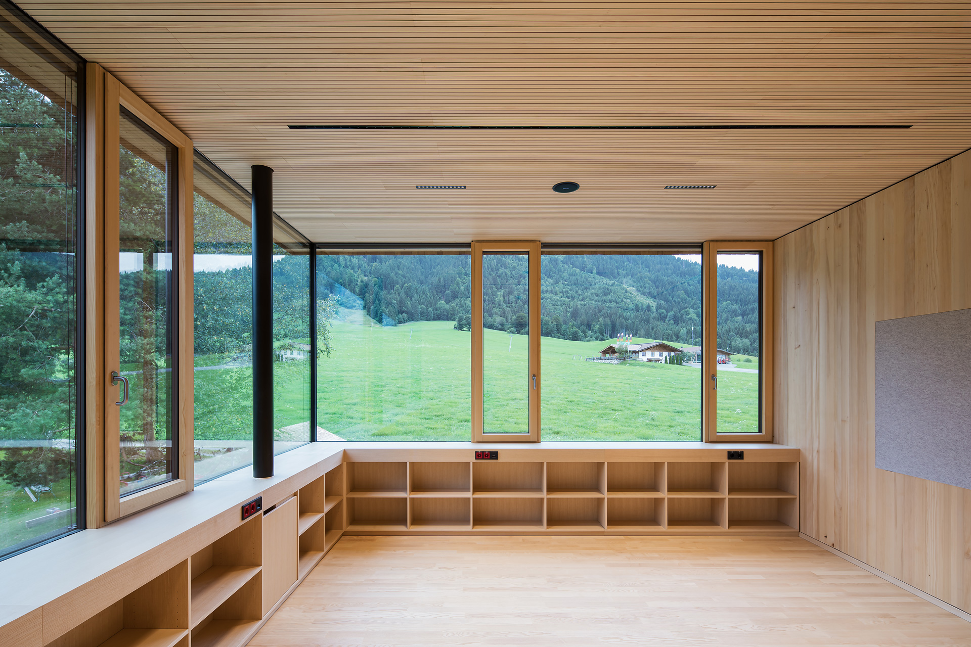 In den vorgegebenen Grundriss werden Gruppenräume und Klassen zueinander versetzt angeordnet. Die Zwischenräume bieten spannungsvolle Raumfolgen und Lichtsituationen. Im Kindergarten ergibt sich eine zentrale, allgemeine Spielzone. Die Gruppenräume erweitern sich mit großzügiger Verglasung und kindgerechten Parapethöhen zum Garten. Trennwände zur Mittelzone sind in unteren Teil als von beiden Seiten bedienbare Möbel ausgeführt. Im Obergeschoß entsteht für die Volksschule eine zentrale Lernlandschaft mit Bibliothek, die auch als Aula funktioniert. Blickbeziehungen in die Klassen und ins Freie machen diesen Bereich hell und freundlich. Die Decken und Wände aus unbehandeltem Tannenholz lassen in den Klassen Wohnzimmeratmosphäre aufkommen.