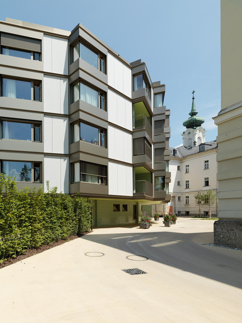Euphorisch rühmte das „Salzburger Volksblatt“ anlässlich der Eröffnung im Jahr 1898 die Vereinigten Versorgungsanstalten der Stadt Salzburg in Nonntal: „Jeder, der dieses neue Denkmal der Humanität und des Culturfortschrittes Salzburgs je betreten hat, wird mit uns der Überzeugung sein, daß weit und breit in den Landen herum kein Heim gefunden werden kann, in welchem das Alter nach einem Leben voll Arbeit seine letzten Lebenstage so behaglich verbringen kann, als in diesem Hause.“ Der klösterlich anmutende Bau mit Kapelle an der Karl-Höller-Straße entstand nach einem Entwurf von Franz Drobny, damals Architekt im städtischen Dienst, später Stadtbaudirektor in Karlsbad und Rektor der Technischen Hochschule Graz. Über ein Jahrhundert lang wurde das Gebäude immer wieder an sich ändernde Pflegekonzepte angepasst – bis es nicht mehr ging. Heute sind nicht nur die Ansprüche an den Wohnkomfort höher, sondern auch die Menschen, die institutionelle Pflege in Anspruch nehmen, älter – im Schnitt über 80 – und dementsprechend stärker pflegebedürftig. Da im denkmalgeschützten Bestand, das in Salzburg seit der Neuausrichtung sämtlicher Seniorenheime der Stadt favorisierte Betreuungsmodell in Hausgemeinschaften schwer realisierbar gewesen wäre, schrieb man einen ein Wettbewerb für einen Neubau an der Rückseite aus, bei dem die Villacher Architekten Sonja Gasparin und Beny Meier reüssierten. Im Altbau werden derzeit geförderte Wohnungen errichtet.