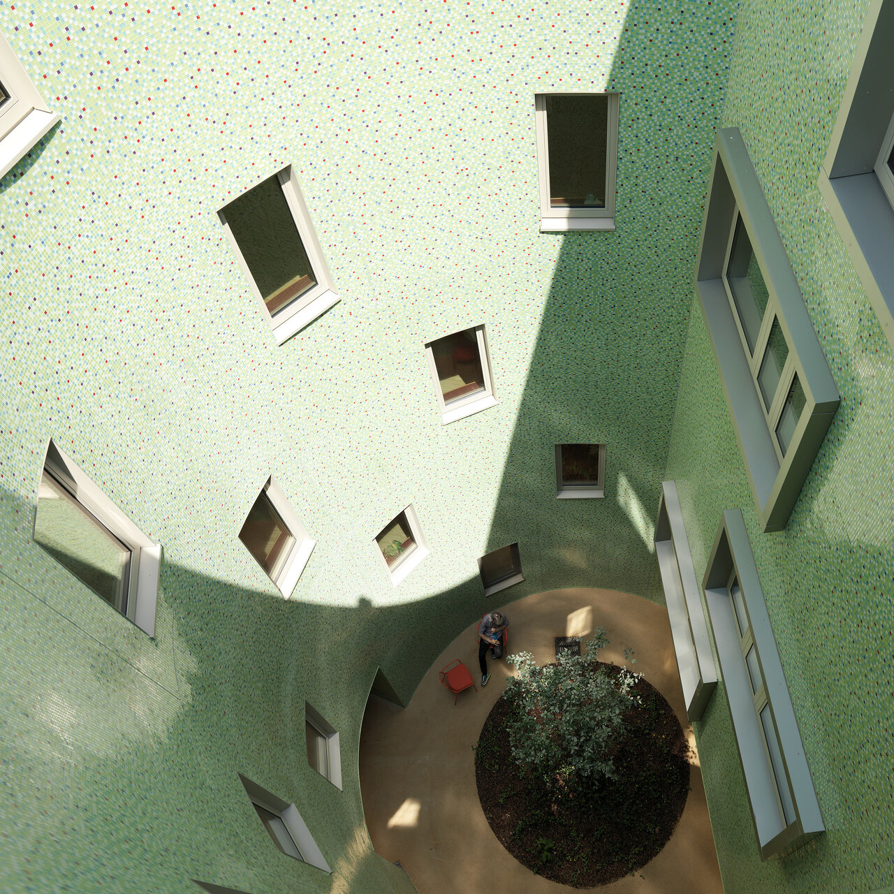 Sehr individuell, geprägt von der Handschrift der Betreuer und ihrer Anvertrauten, wird in den Kleineinheiten der Alltag gelebt. Eines aber zieht sich durch das ganze Haus: eine hochwertige, auf Details bedachte Gestaltung, bei der das „Altenspezifische“, das die Erfordernisse und Vorschriften in Hinblick auf Sicherheit und Hygiene unumgänglich mit sich bringt, im Hintergrund bleibt. Von hoher Güte sind Material-, Farb- und Möblierungskonzept. Das beginnt an der Fassade, die im Wechselspiel von putzähnlichen Plattenverkleidungen und metallischen Fassadenelementen beim nördlichen Gebäudeteil etwas heller als beim Südtrakt gestaltet wurde, was zur feingliedrigen Wirkung beiträgt. Dort, wo Außenwände an Aufenthaltsräume im Freien treffen – am Sockelgeschoß, im Atrium und bei den Loggienwänden –, kam Glasmosaik zum Einsatz, dessen Farbigkeit an eine Blumenwiese erinnert. Hochwertiges wie Pietra Piasentina – ein weiß geaderter braungrauer Kalkstein – in den zentralen Erschließungsbereichen und sonst fast überall Holzböden sorgen für einen robust-eleganten Hintergrund. Das Mobiliar ist bei aller gebotenen Zweckmäßigkeit dennoch wohlgestaltet.