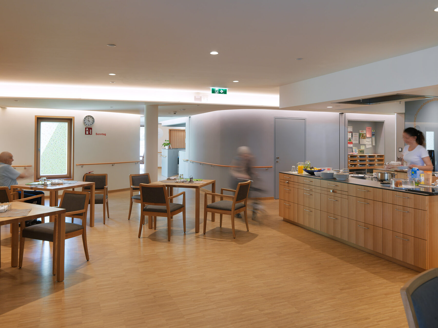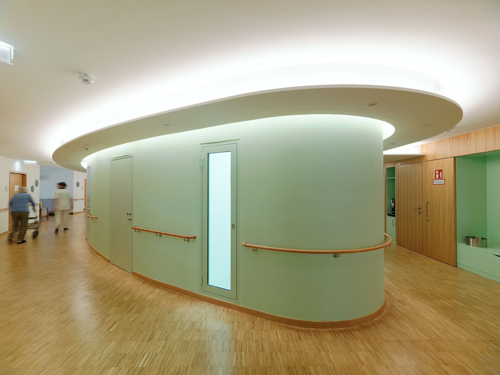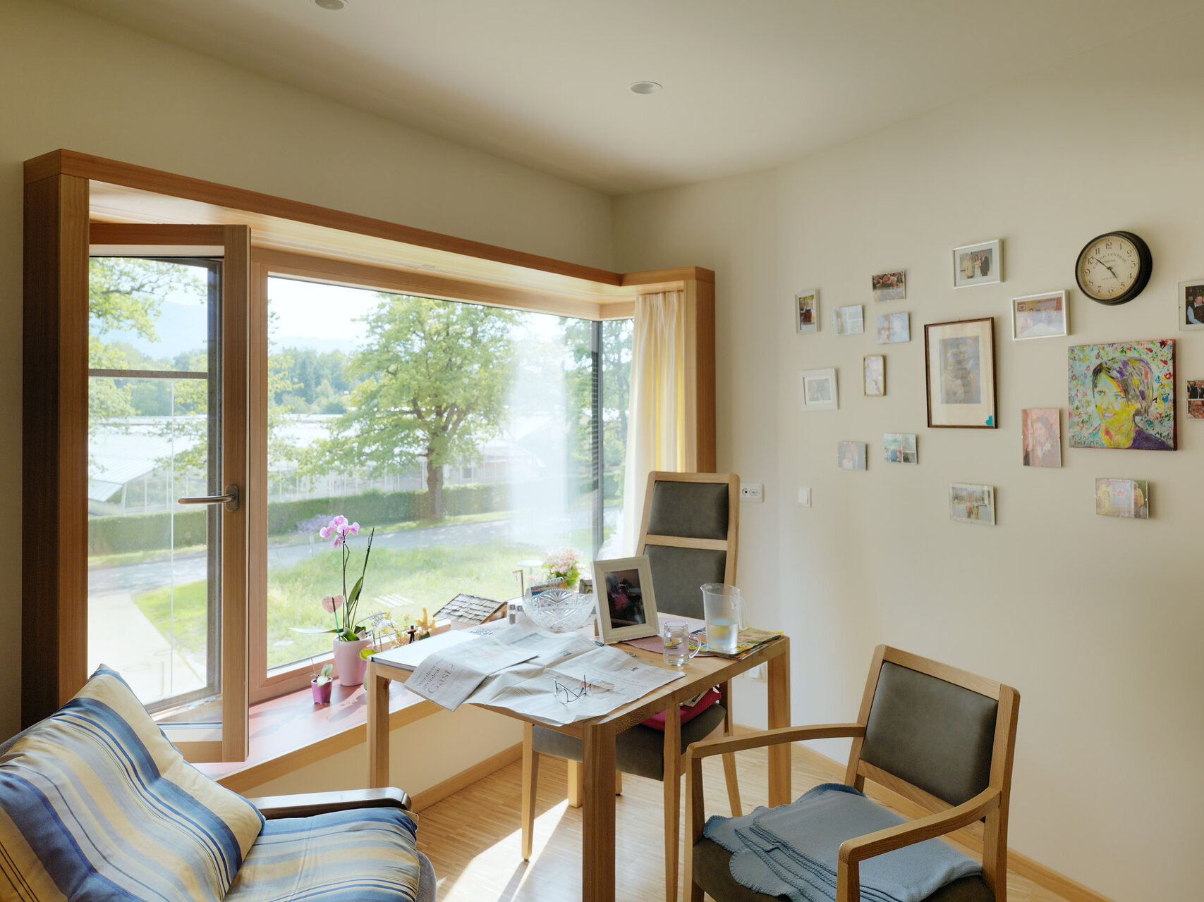 Ähnlich einem Haushalt basiert das Hausgemeinschaftsmodell auf der Idee eines Zusammenlebens in einem wohnlichen Milieu. „Die Pflege steht nicht mehr so im Vordergrund“, betont Pflegedienstleiterin Heidi Hager. Wer noch kann, übernimmt leichte Hausarbeiten und ist damit nicht zur Passivität verdammt. Zwölf Personen leben im konkreten Fall in einer Hausgemeinschaft. Die notwendigen Pflegeleistungen werden nach individuellem Bedarf von qualifiziertem Pflegepersonal übernommen. Als fixe Bezugspersonen, die quasi den Haushalt führen, sind Alltagsmanager eingesetzt. Sie sorgen auch für die Zubereitung der täglichen Mahlzeiten in den Wohnküchen. Diese gemeinschaftlichen Zentren jeder der acht Einheiten orientieren sich jeweils zu großen überdeckten Gemeinschaftsterrassen, die gartenseitig in der Mittelachse auskragen, und denen nach innen jeweils ein kleines Wohnzimmer vorgelagert ist. Verglast und mit Vorhängen als intimere Rückzugsorte gestaltet, werden sie auch vom Personal gern für kleine Auszeiten im fordernden Pflegealltag genutzt. Zudem verfügt jede Hausgemeinschaft über eine kleinere Loggia als Rückzugsort im Freien. Dazwischen sind die individuellen Einheiten für jeweils eine Person so aufgefächert, dass über Erkerfenster mit niedrigem Parapet für einen weiten Blickwinkel nach außen – ins Grüne, zu den Salzburger Hausbergen und zur Festung – gesorgt ist. Im Kern jeder Geschoßhälfte sind einerseits an strategisch günstiger Stelle die Pflegestützpunkte und diverse Nebenräume zu Inseln gruppiert. Zum anderen ist jeweils ein Atrium eingeschnitten, das zusätzlich Licht in die Gebäudemitte bringt. Dass damit auch für Blickverbindung zwischen den Geschoßen gesorgt ist, bereichert den Spaziergang um Rauminsel und Atrium in Achterschleifen, der besonders für demente Bewohner mit Orientierungsschwierigkeiten und hohem Bewegungsdrang ein wichtiger Beitrag zum Wohlbefinden ist.