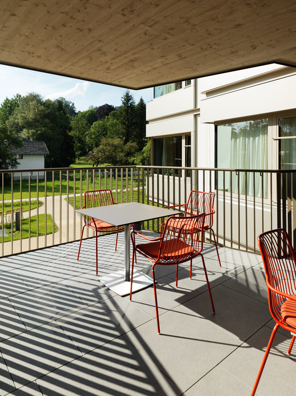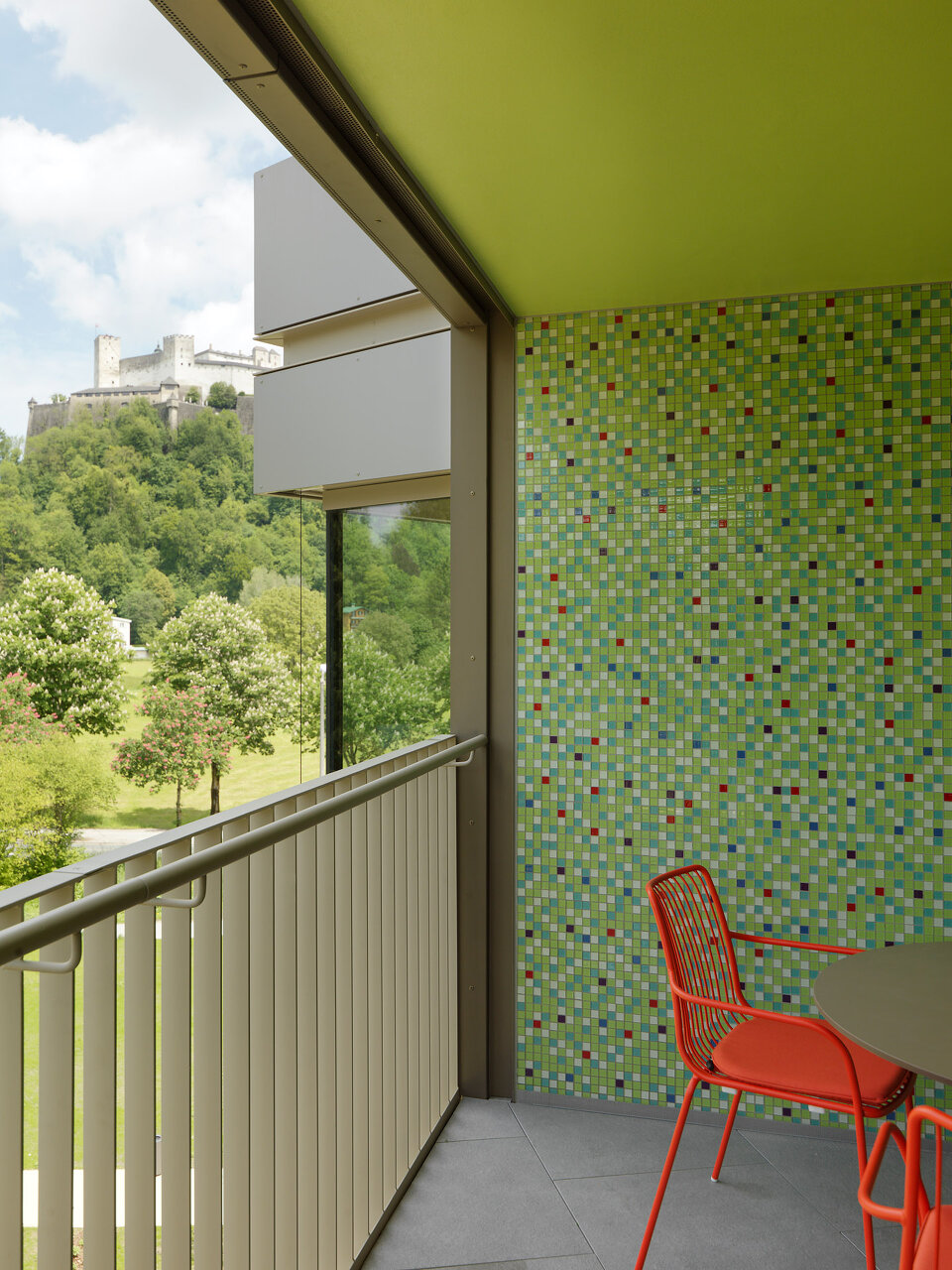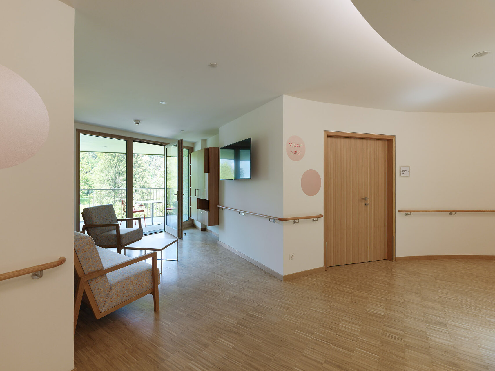 Ähnlich einem Haushalt basiert das Hausgemeinschaftsmodell auf der Idee eines Zusammenlebens in einem wohnlichen Milieu. „Die Pflege steht nicht mehr so im Vordergrund“, betont Pflegedienstleiterin Heidi Hager. Wer noch kann, übernimmt leichte Hausarbeiten und ist damit nicht zur Passivität verdammt. Zwölf Personen leben im konkreten Fall in einer Hausgemeinschaft. Die notwendigen Pflegeleistungen werden nach individuellem Bedarf von qualifiziertem Pflegepersonal übernommen. Als fixe Bezugspersonen, die quasi den Haushalt führen, sind Alltagsmanager eingesetzt. Sie sorgen auch für die Zubereitung der täglichen Mahlzeiten in den Wohnküchen. Diese gemeinschaftlichen Zentren jeder der acht Einheiten orientieren sich jeweils zu großen überdeckten Gemeinschaftsterrassen, die gartenseitig in der Mittelachse auskragen, und denen nach innen jeweils ein kleines Wohnzimmer vorgelagert ist. Verglast und mit Vorhängen als intimere Rückzugsorte gestaltet, werden sie auch vom Personal gern für kleine Auszeiten im fordernden Pflegealltag genutzt. Zudem verfügt jede Hausgemeinschaft über eine kleinere Loggia als Rückzugsort im Freien. Dazwischen sind die individuellen Einheiten für jeweils eine Person so aufgefächert, dass über Erkerfenster mit niedrigem Parapet für einen weiten Blickwinkel nach außen – ins Grüne, zu den Salzburger Hausbergen und zur Festung – gesorgt ist. Im Kern jeder Geschoßhälfte sind einerseits an strategisch günstiger Stelle die Pflegestützpunkte und diverse Nebenräume zu Inseln gruppiert. Zum anderen ist jeweils ein Atrium eingeschnitten, das zusätzlich Licht in die Gebäudemitte bringt. Dass damit auch für Blickverbindung zwischen den Geschoßen gesorgt ist, bereichert den Spaziergang um Rauminsel und Atrium in Achterschleifen, der besonders für demente Bewohner mit Orientierungsschwierigkeiten und hohem Bewegungsdrang ein wichtiger Beitrag zum Wohlbefinden ist.