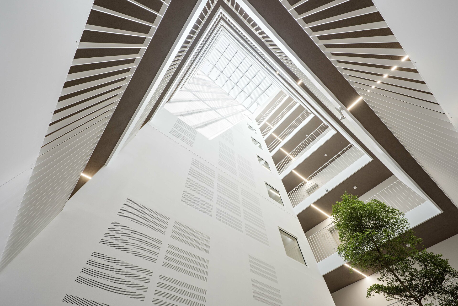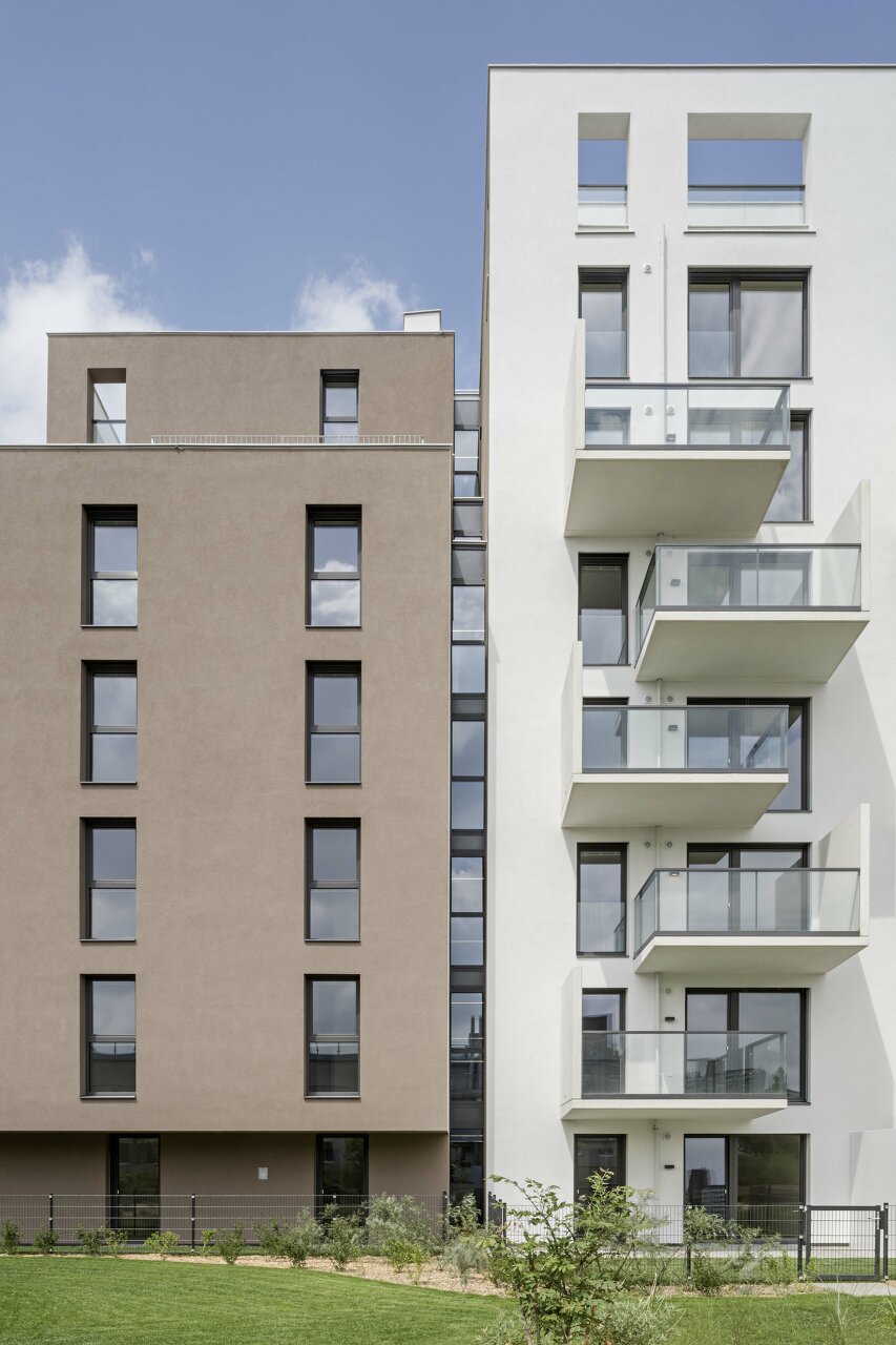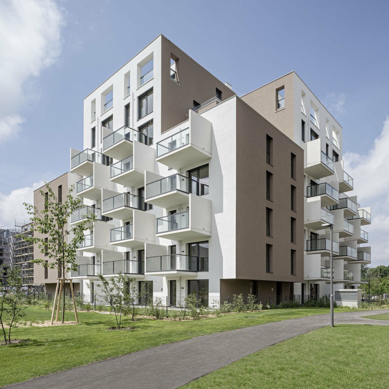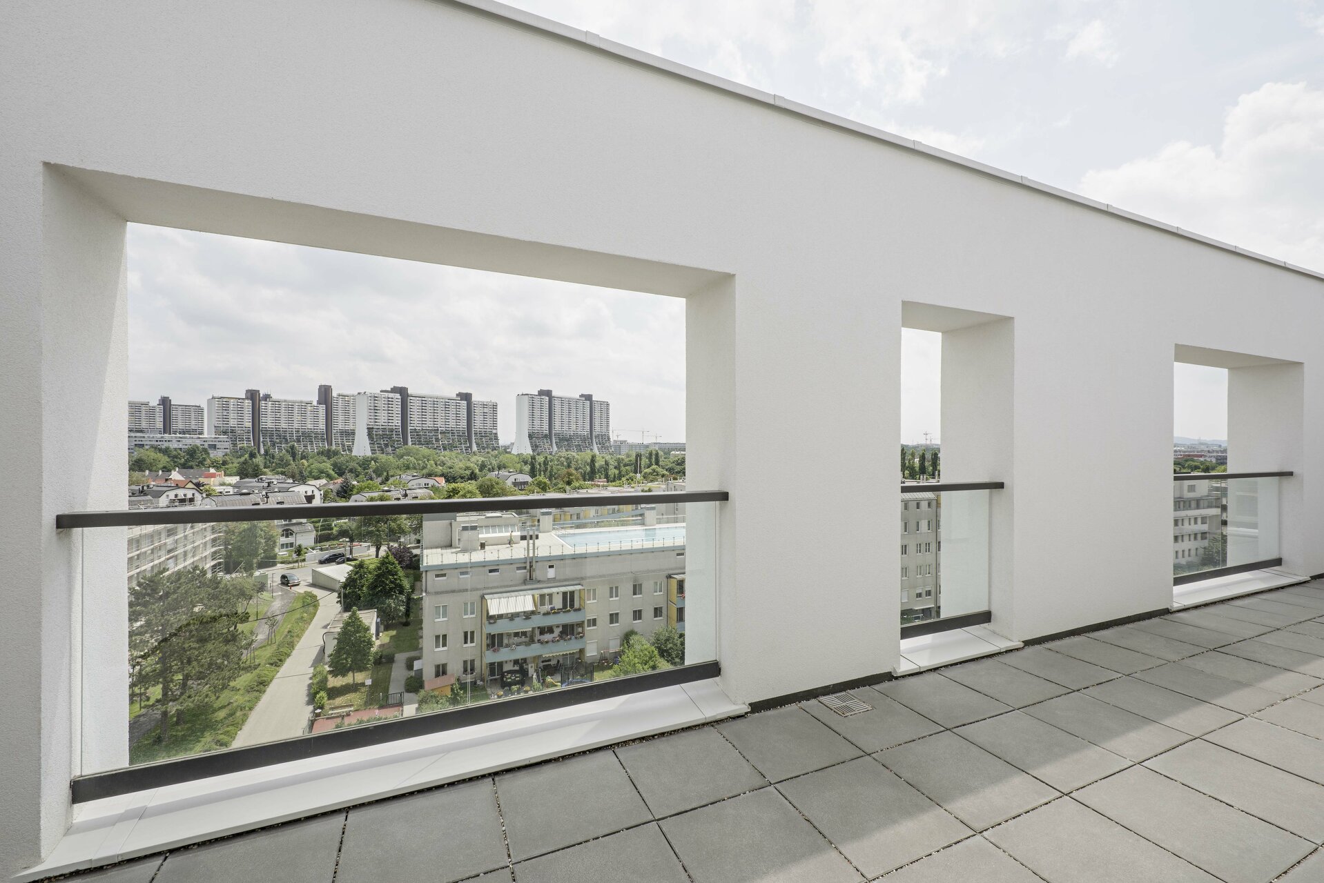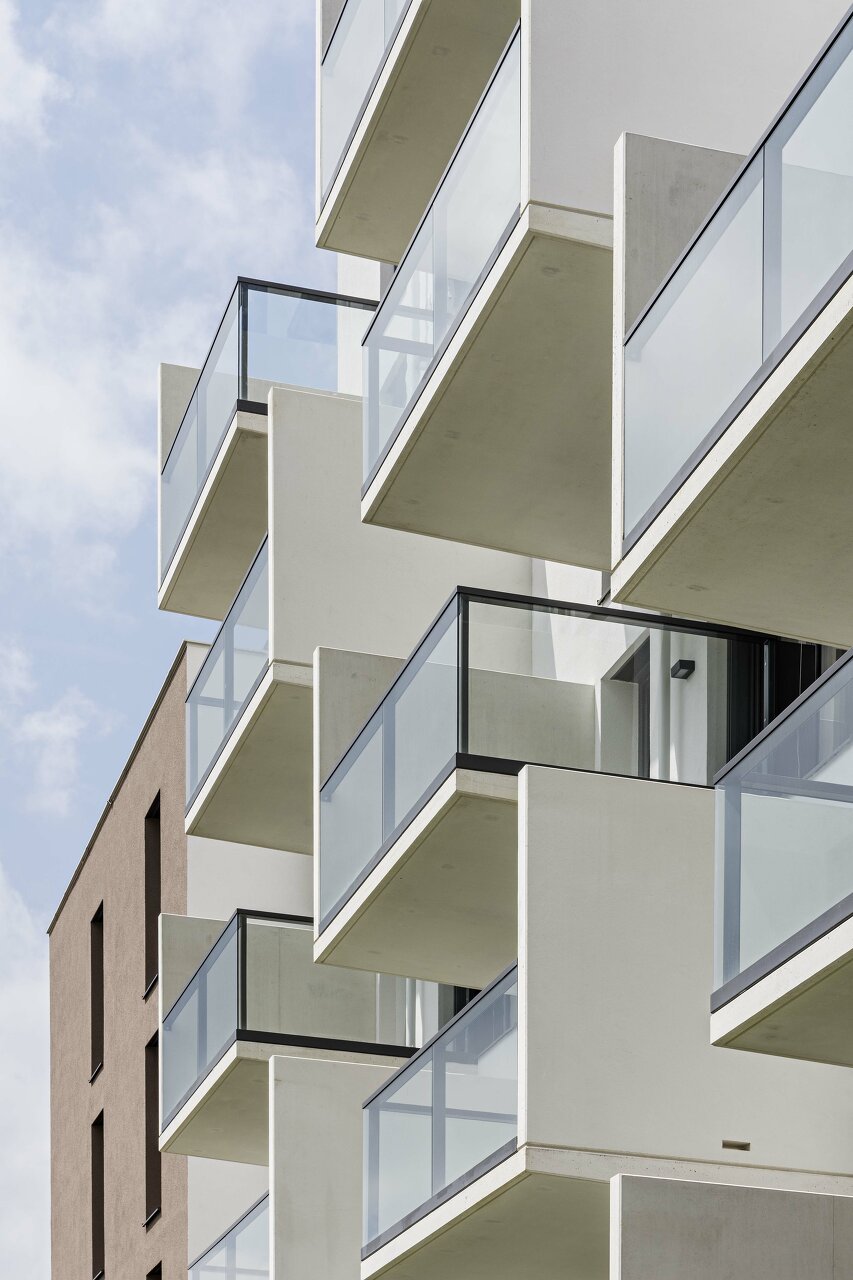 Die skulpturale Staffelung der Dachkubatur erzeugt hochwertige Freiflächen auf drei abgestuften Dachebenen in Ausnutzung der baurechtlichen Gegebenheiten. Im letzten Dachgeschoss wird die Fassade als Balustrade weitergeführt und schafft so geschützte, räumlich gefasste Dachterrassen. Die versetzten Balkone ermöglichen teilweise zweigeschossige Freibereiche und vermeiden eine eingeschränkte Belichtung der dahinter liegenden Aufenthaltsbereiche. Im Regelgeschoss sind die Ecken jeweils durch Dreizimmerwohnungen mit einer Wohnküche über Eck besetzt.