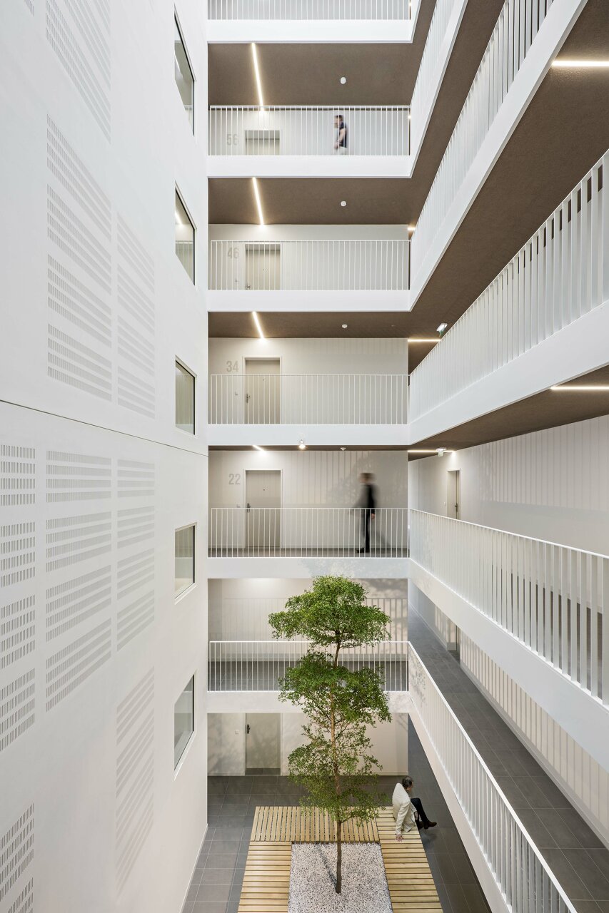 Das Wohnhaus mit dem Grundmaß von 32x 32 m setzt sich aus vier gleichartigen Baukörpern zusammen, welche windmühlenartig angeordnet in ihrer Mitte ein hallenartiges Atrium mit abgesetztem Stiegenhaus bilden. Die Gänge verlaufen in den einzelnen Geschossen ringförmig und durchbrechen das Gebäude jeweils an einer Seite in Form einer eingeschnittenen Gebäudefuge. Im Erdgeschoss wird die freie Mitte durch einen Baum besetzt, welcher den Freiraum in Form eines Platzes von außen nach innen führt. Die Halle ist zur Verbesserung der Akustik mit absorbierenden Platten verkleidet. Durch eine großes, lamellenbedecktes Glasoberlicht fällt Tageslicht ins Gebäudeinnere.