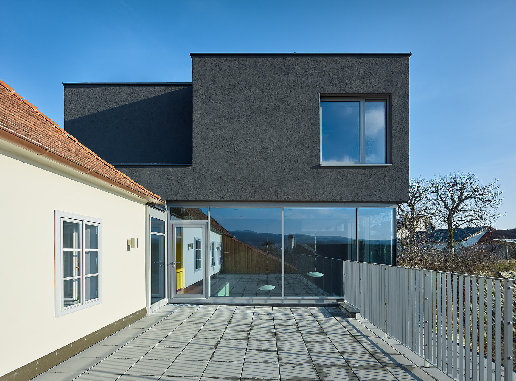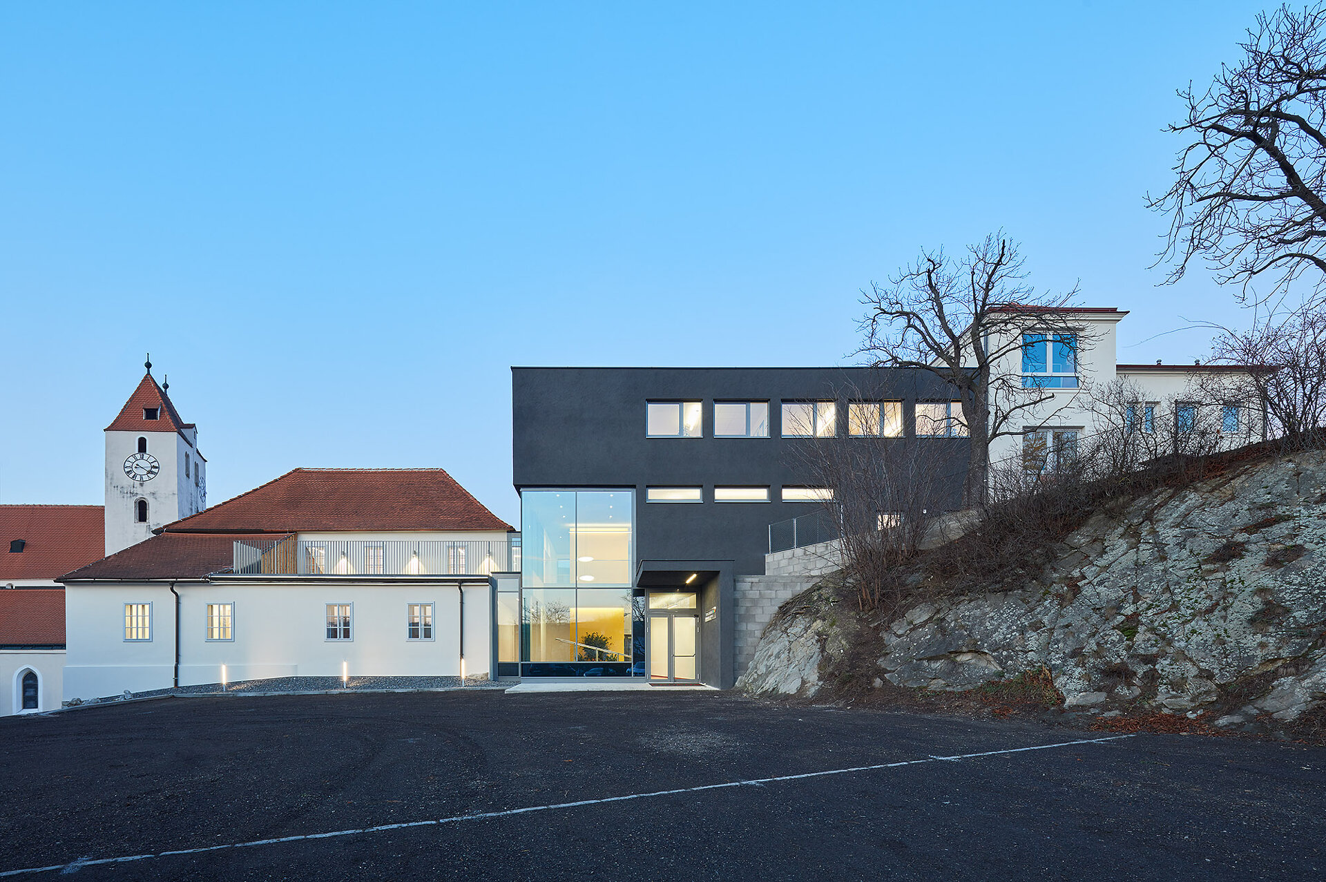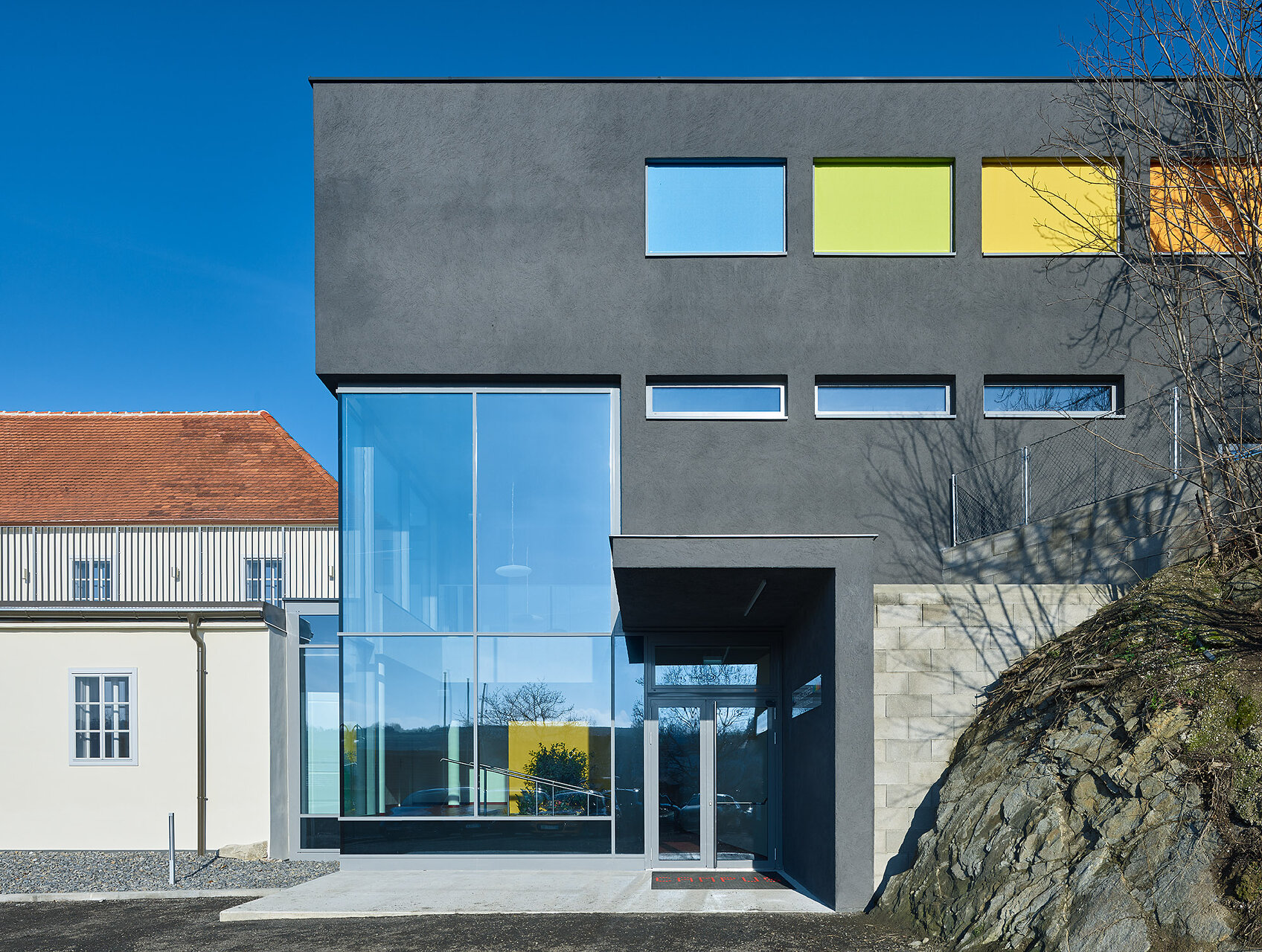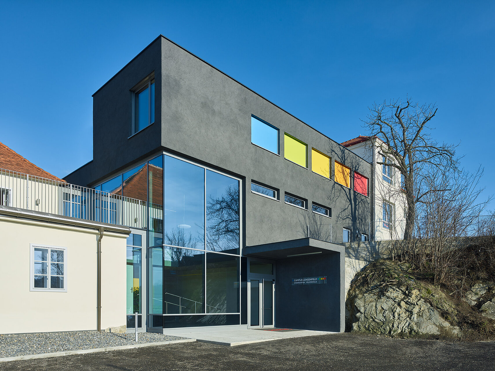 Die zugefügten Bauteile und vor allem der Verbindungsbau zwischen Schule und alter Volksschule sind ablesbar: scharf geschnitten, mit großen Glasflächen, geordneten Fensterreihen und die Fassade mit dunklem Putz – in historischer Technik mit Einfärbung durch Holzkohle – ausgeführt. Ein optischer Dreiklang von den zwei historischen Gebäuden und dem Neubau als Bindeglied. (Text: Architekt:innen, bearbeitet)