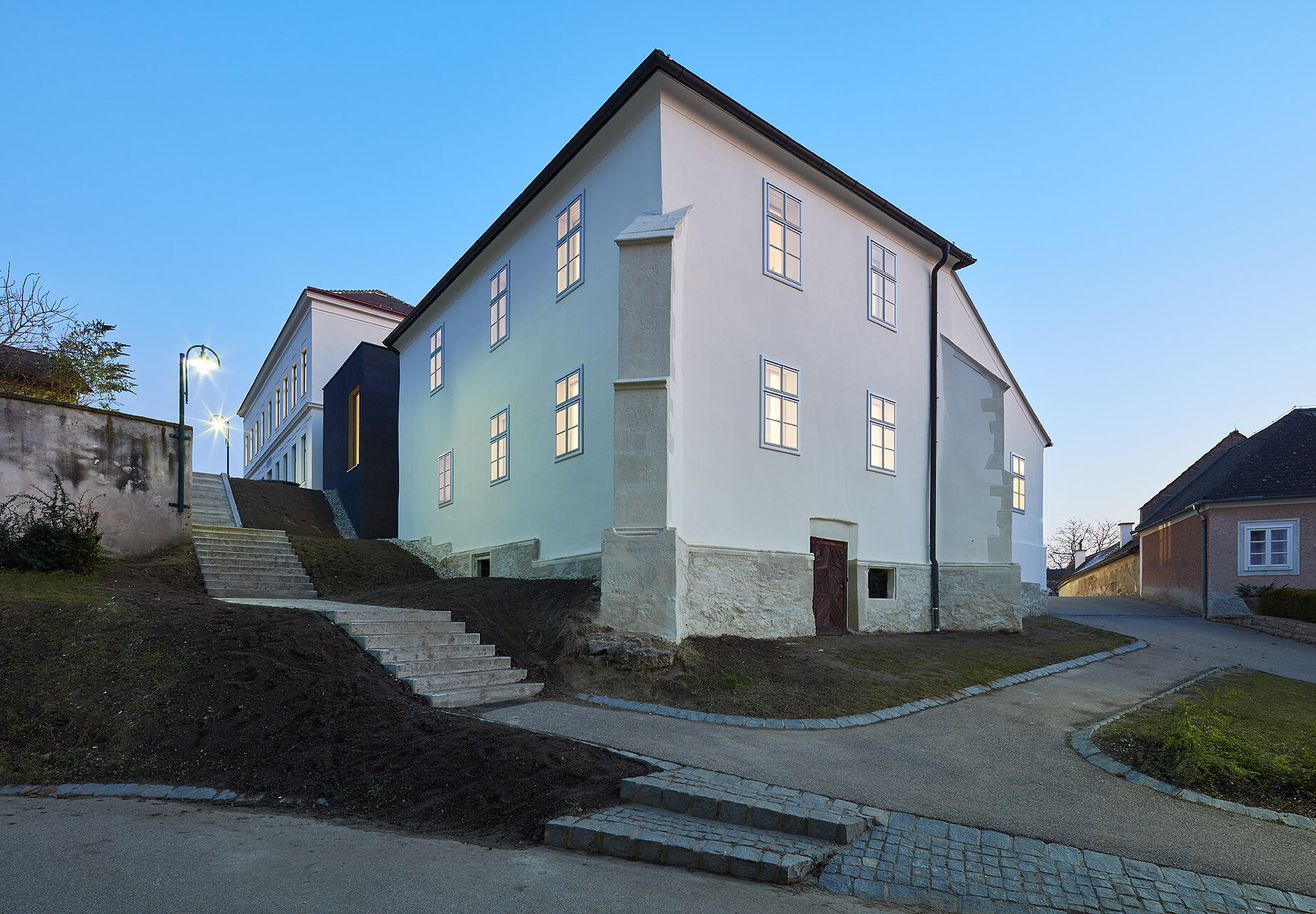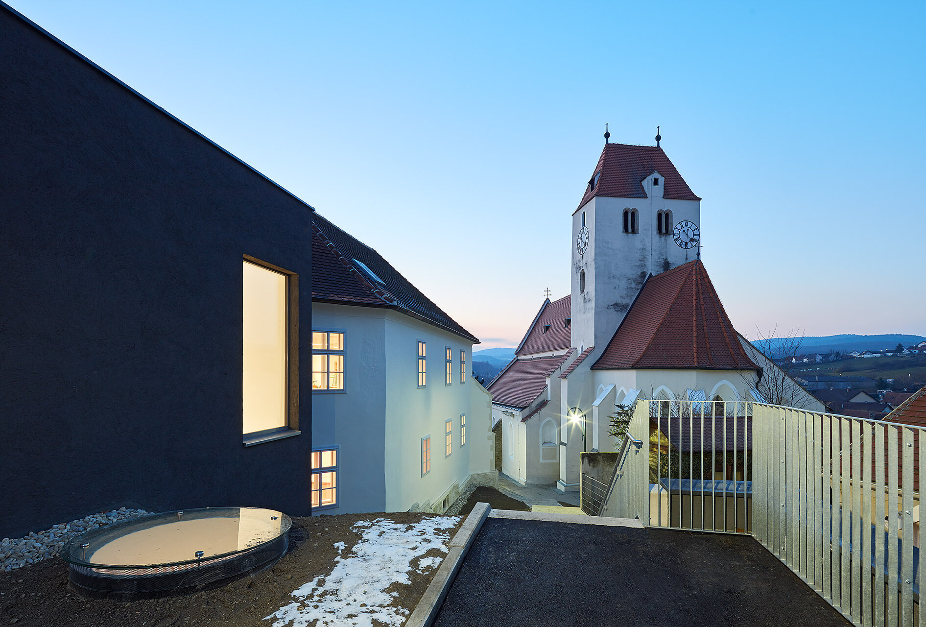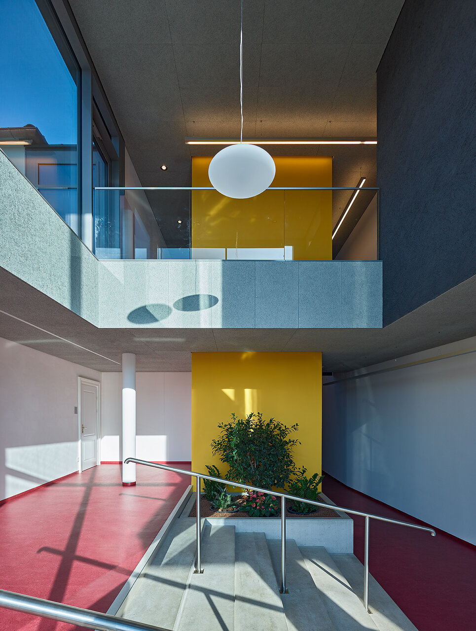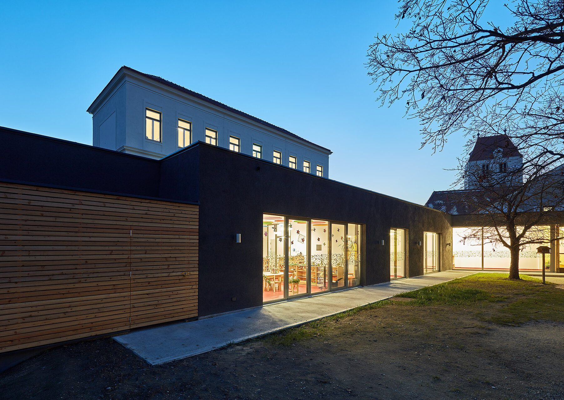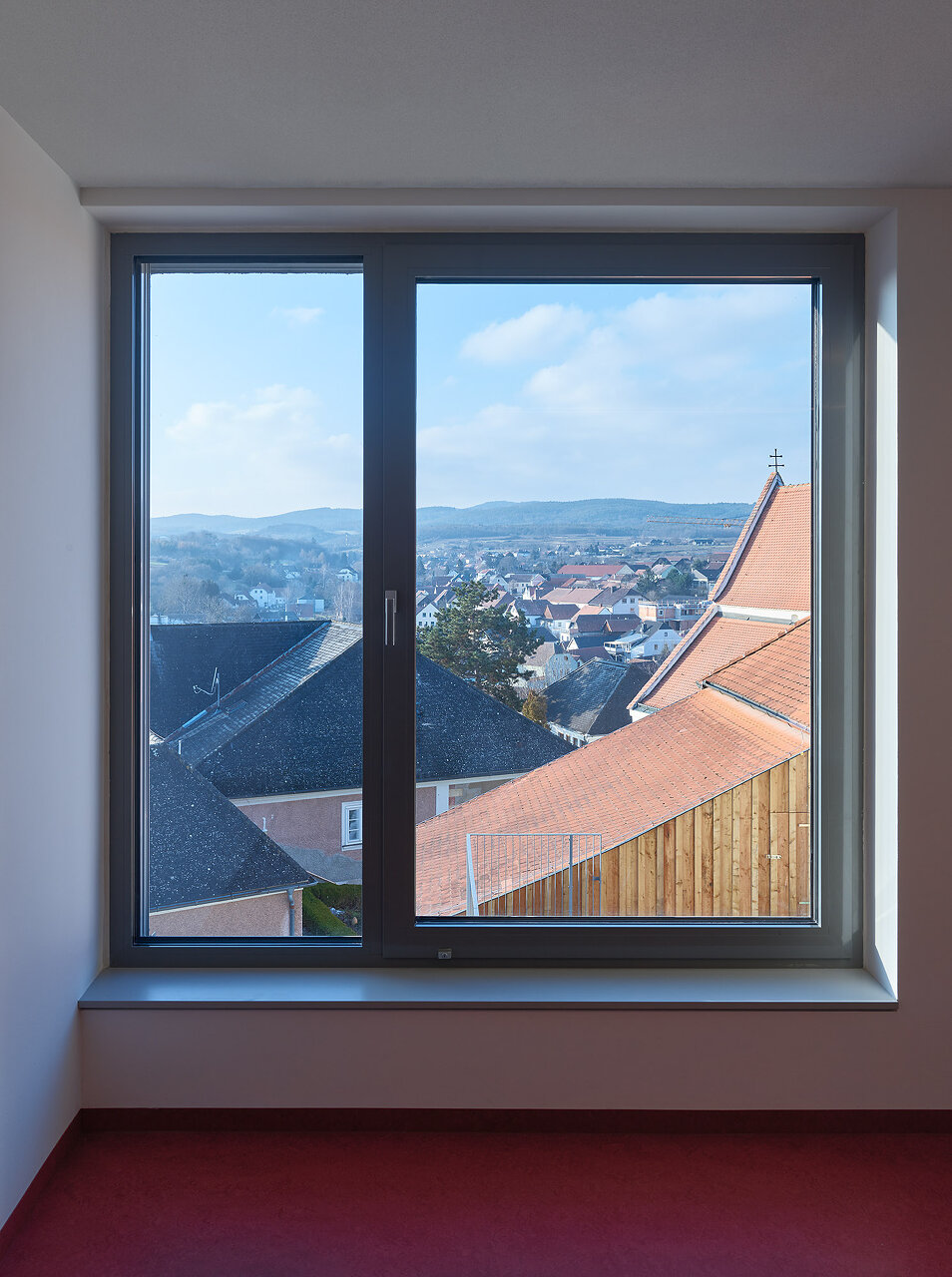 Die zugefügten Bauteile und vor allem der Verbindungsbau zwischen Schule und alter Volksschule sind ablesbar: scharf geschnitten, mit großen Glasflächen, geordneten Fensterreihen und die Fassade mit dunklem Putz – in historischer Technik mit Einfärbung durch Holzkohle – ausgeführt. Ein optischer Dreiklang von den zwei historischen Gebäuden und dem Neubau als Bindeglied. (Text: Architekt:innen, bearbeitet)