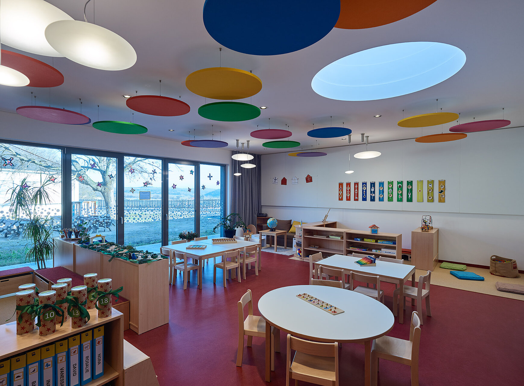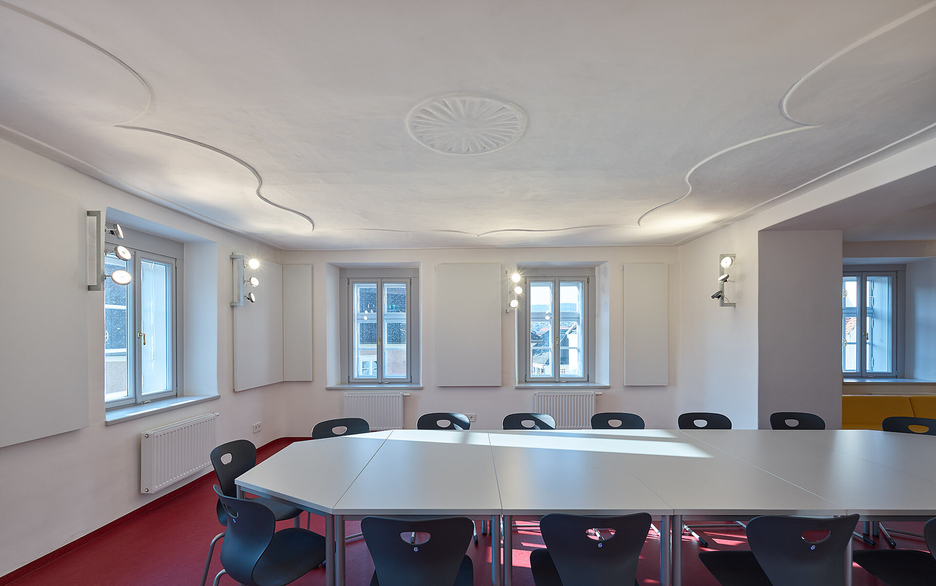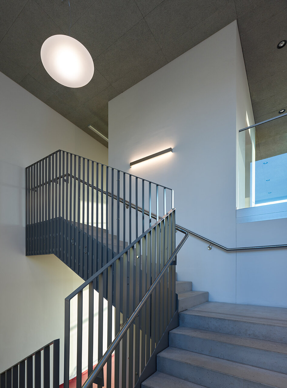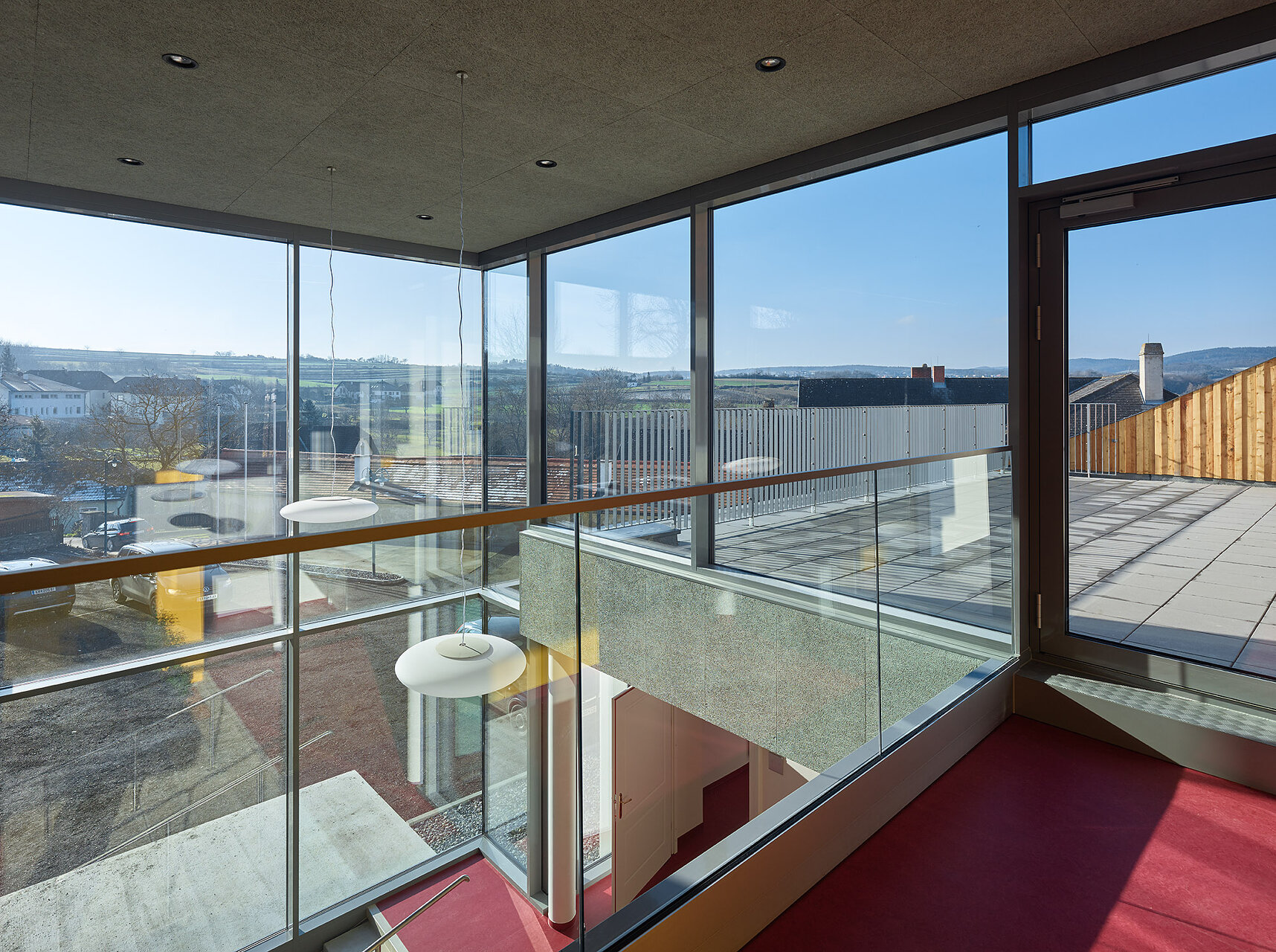 Die zugefügten Bauteile und vor allem der Verbindungsbau zwischen Schule und alter Volksschule sind ablesbar: scharf geschnitten, mit großen Glasflächen, geordneten Fensterreihen und die Fassade mit dunklem Putz – in historischer Technik mit Einfärbung durch Holzkohle – ausgeführt. Ein optischer Dreiklang von den zwei historischen Gebäuden und dem Neubau als Bindeglied. (Text: Architekt:innen, bearbeitet)