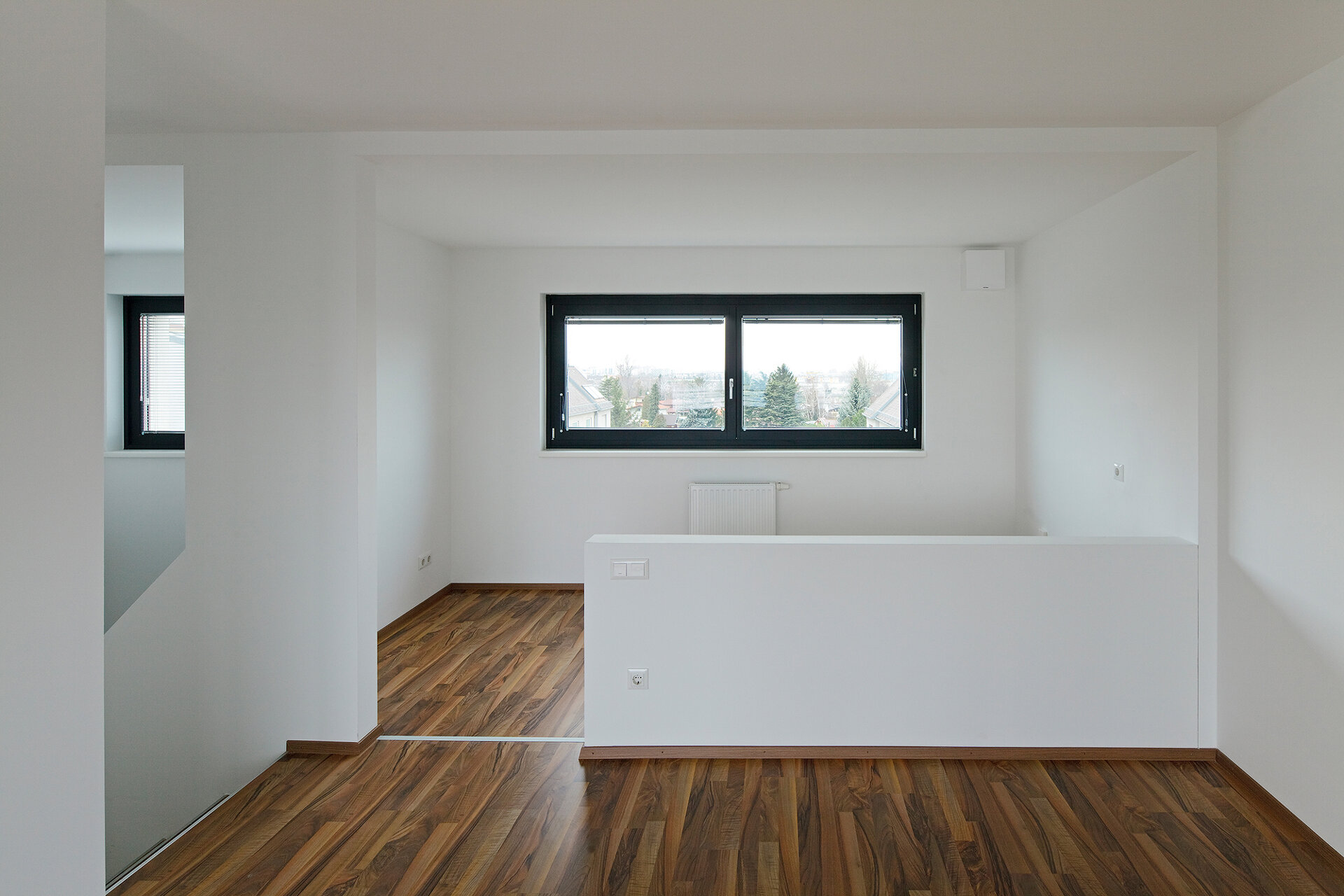 Die Auswahl der Materialien reduziert sich auf wenige Elemente: Im wesentlichen sind es helle Putzflächen, dunkle Eternitplatten, naturbelassene Holzlattenfassadenelemente und für die Geländer Max-Exterior- Platten bzw. Lochblech- oder Flachstahlkonstruktionen. Gartenseitig charakterisieren der Loggiazone vorgelagerte Schiebeläden das Erscheinungsbild. Diese sind nicht nur Sonnenschutz, sondern regulieren die Einsicht für mehr Privatheit.