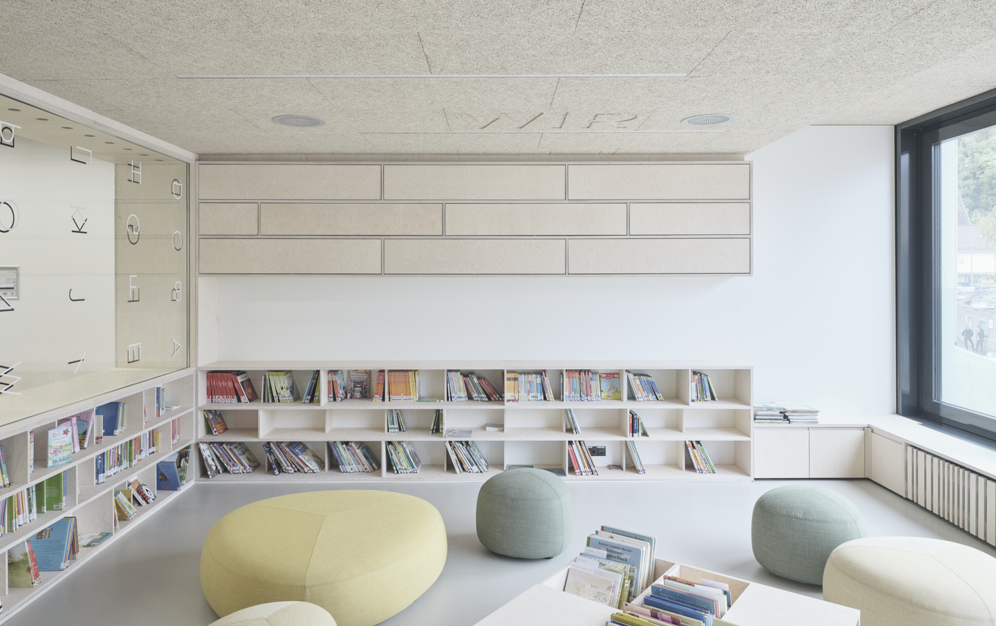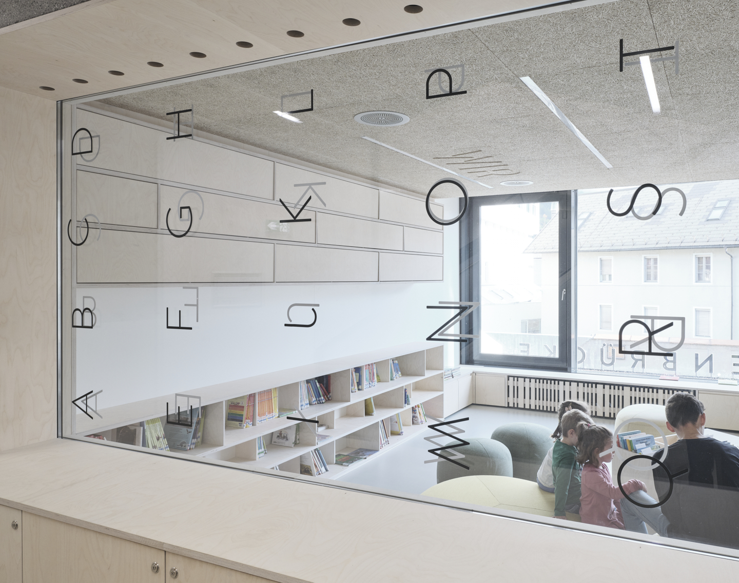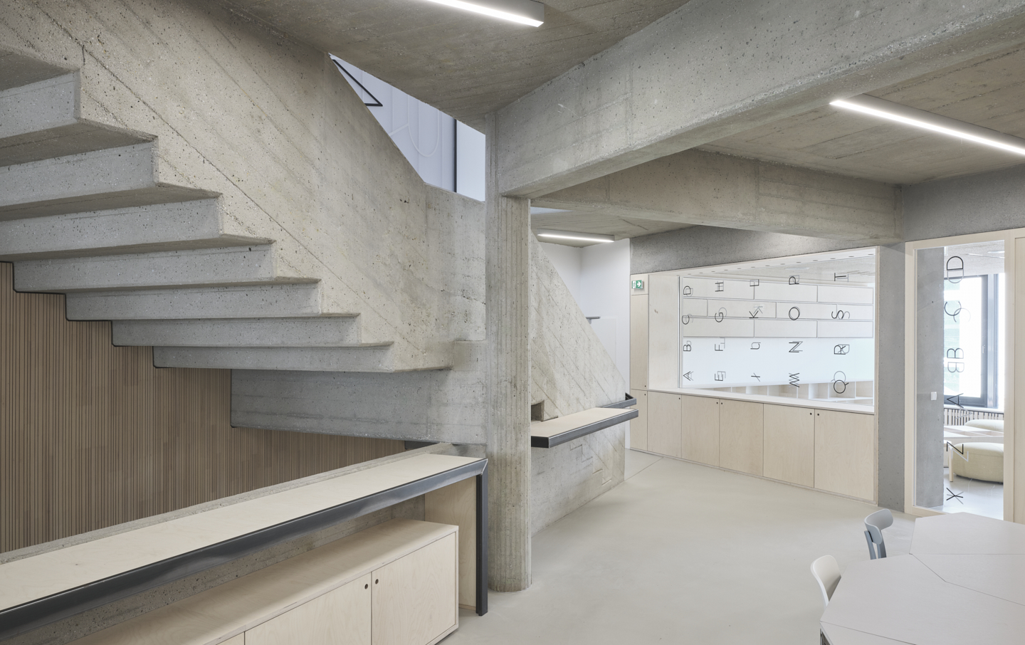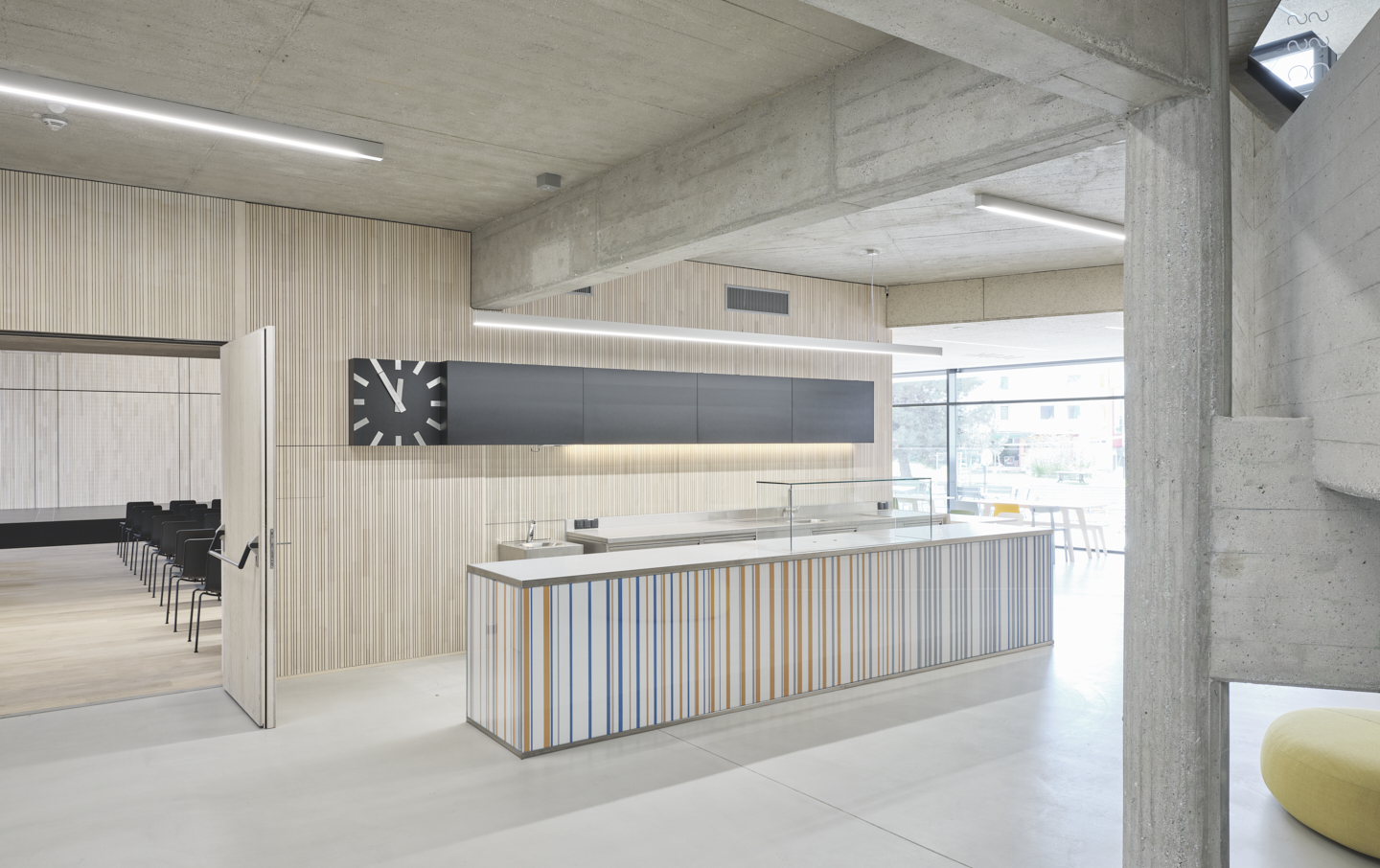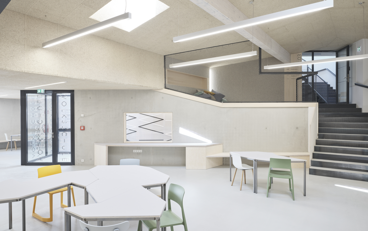 Große Fenster öffnen die Räume der Volksschule zur Straße. Die Öffnungen der setzen sich im Gebäude fort und bringen Tageslicht ins Innere. Vormals dunkle Gänge werden damit zu hellen Lernfoyers für freie Unterrichtsformen. Die Wände im Innenraum haben im Laufe der Jahre unterschiedliche Farbgebungen und Beläge erhalten. Die darunter verborgene Betonstruktur deutet auf handwerklich gekonnte Schalarbeiten aus den 1970er-Jahren hin. Oberflächen in natürlichen Materialien, Wandelemente aus Weisstanne, Akustik-Deckenfelder in zementgebundener Holzwolle und roh belassene Betonoberflächen lassen nun atmosphärische, ruhige Räume entstehen. Für die Volksschule wurden polygonale Tische für freie Unterrichtsformen geplant, bunte Kunststoffsessel mit Wippfunktion laden zur Veränderung ein, eine gepolsterte Nische zur Entspannung.