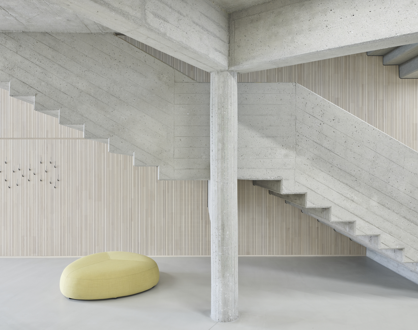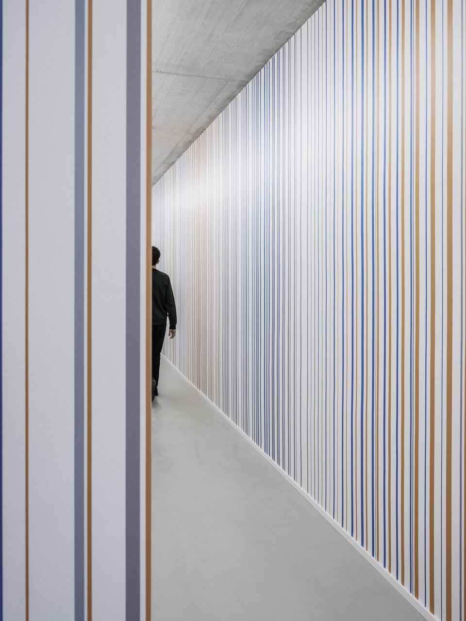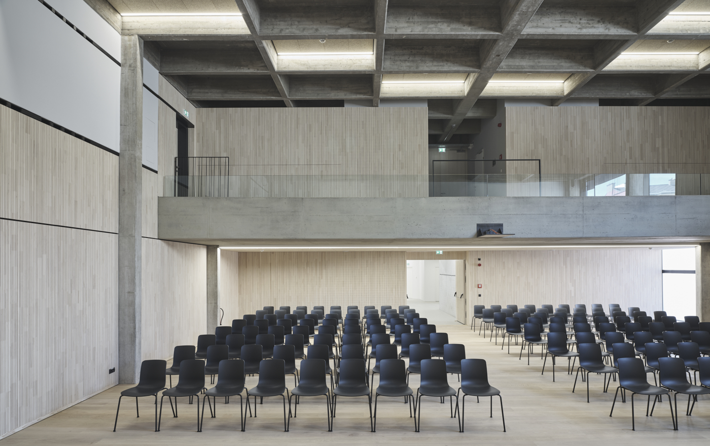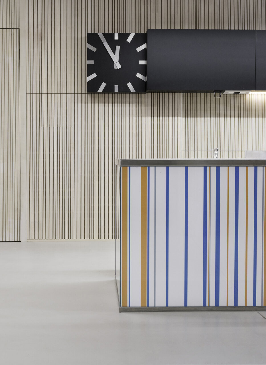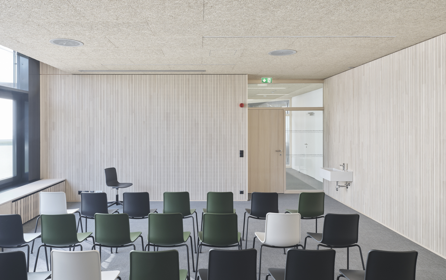 Große Fenster öffnen die Räume der Volksschule zur Straße. Die Öffnungen der setzen sich im Gebäude fort und bringen Tageslicht ins Innere. Vormals dunkle Gänge werden damit zu hellen Lernfoyers für freie Unterrichtsformen. Die Wände im Innenraum haben im Laufe der Jahre unterschiedliche Farbgebungen und Beläge erhalten. Die darunter verborgene Betonstruktur deutet auf handwerklich gekonnte Schalarbeiten aus den 1970er-Jahren hin. Oberflächen in natürlichen Materialien, Wandelemente aus Weisstanne, Akustik-Deckenfelder in zementgebundener Holzwolle und roh belassene Betonoberflächen lassen nun atmosphärische, ruhige Räume entstehen. Für die Volksschule wurden polygonale Tische für freie Unterrichtsformen geplant, bunte Kunststoffsessel mit Wippfunktion laden zur Veränderung ein, eine gepolsterte Nische zur Entspannung.