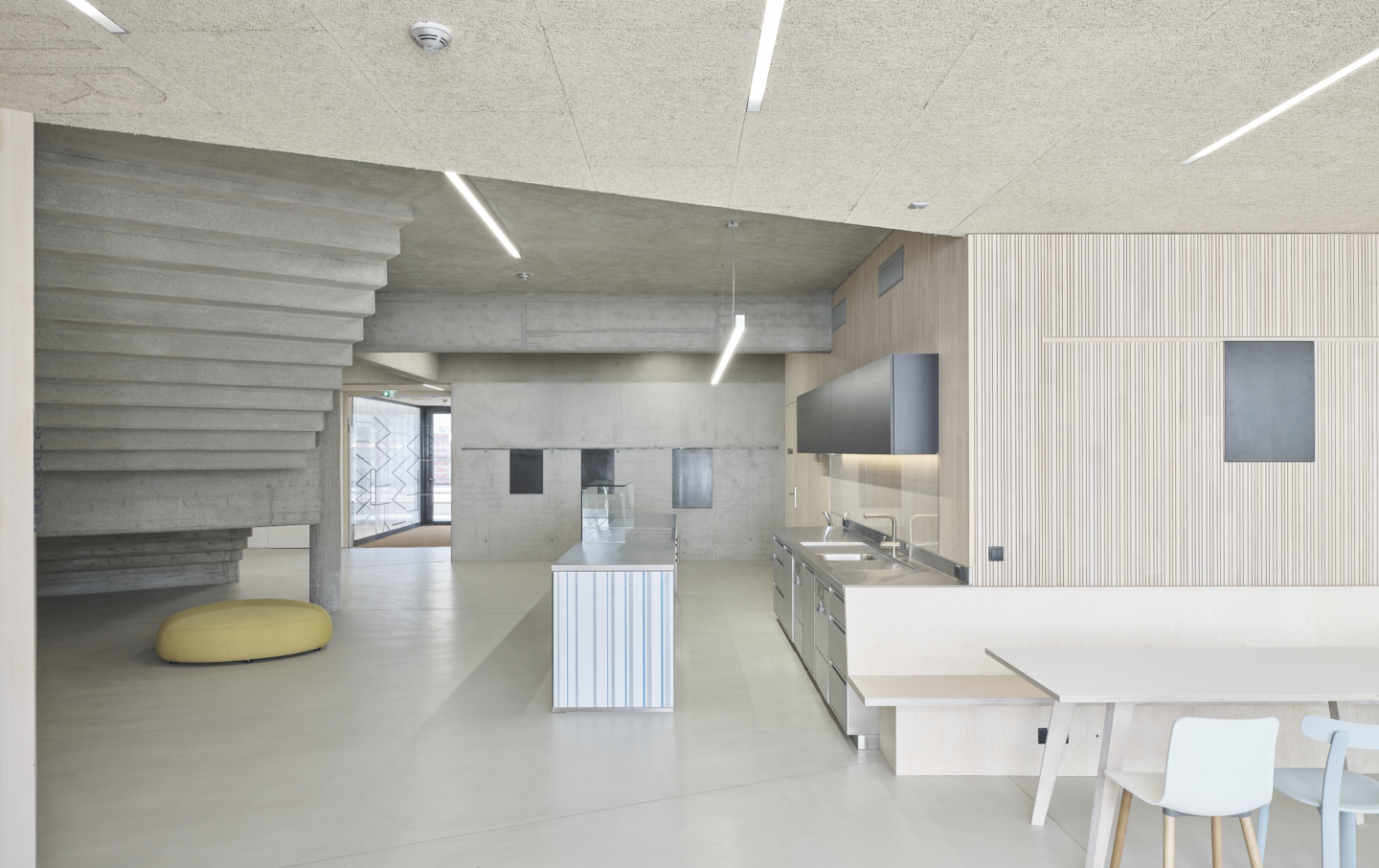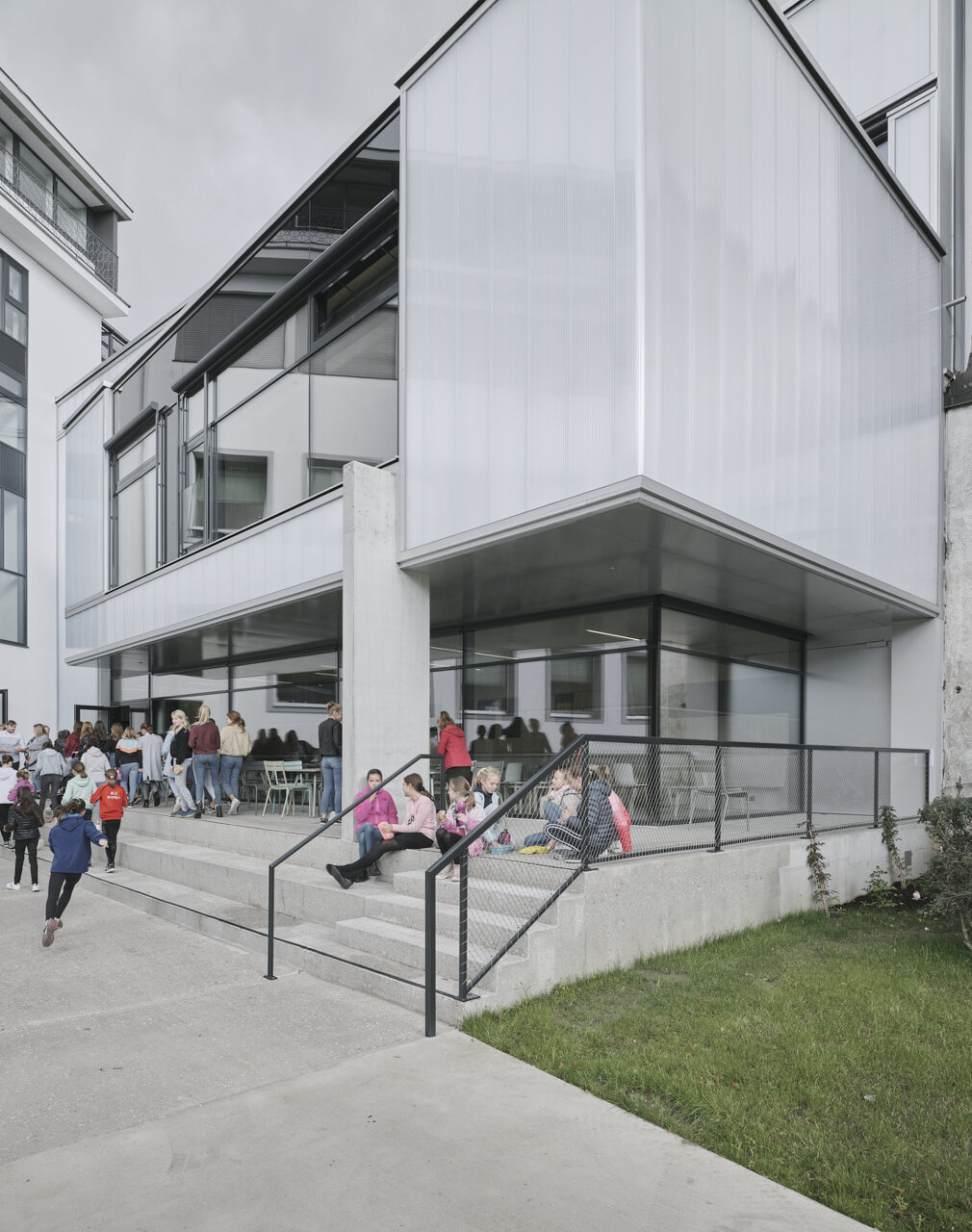 Erweitert wird das Gebäude zum grünen Schulhof, für Pausen und Mittagstisch ein Buffet und großes Aufenthaltsfoyer geschaffen, ergänzt mit einer überdachten Terrasse. Auch auf dem Turnsaaldach entsteht ein Freibereich als Zusatznutzen der gesetzlich vorgeschriebenen Fluchtwege. (Text: Architektin, bearbeitet)