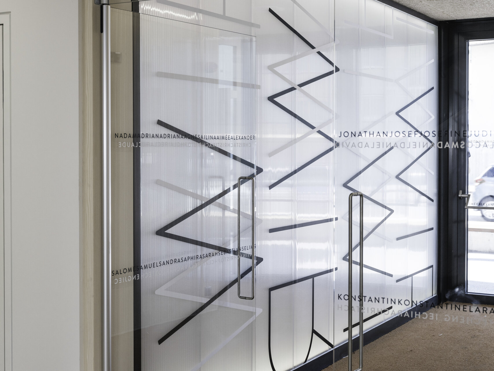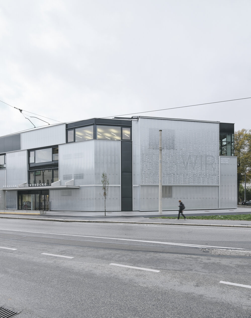 Das Bestandsgebäude passt sich mit seiner Putz-Fassade und den Fenstereinfassungen den umliegenden Villen an, im Süden grenzt die Pfarrkirche an. Die Kontraste nimmt der Gelenksbau dazwischen mit einheitlicher Fassade auf. Das Sammelsurium der verschiedenen Bauphasen und Höhenentwicklungen fasst das zeigemäße Fassadenkleid aus transluszenten Polycarbonatplatten zusammen.
