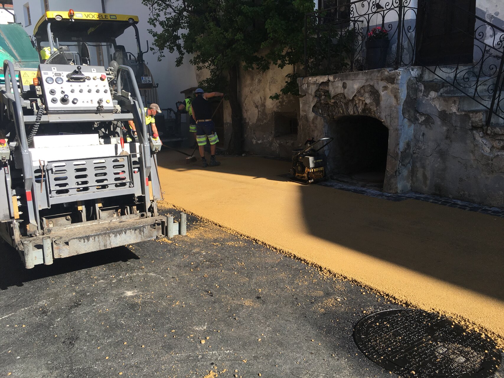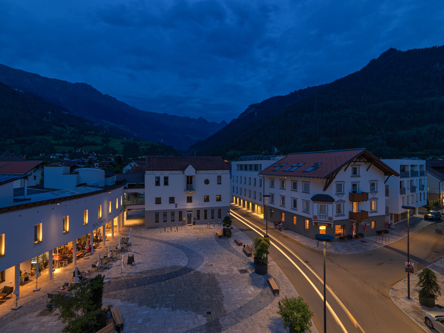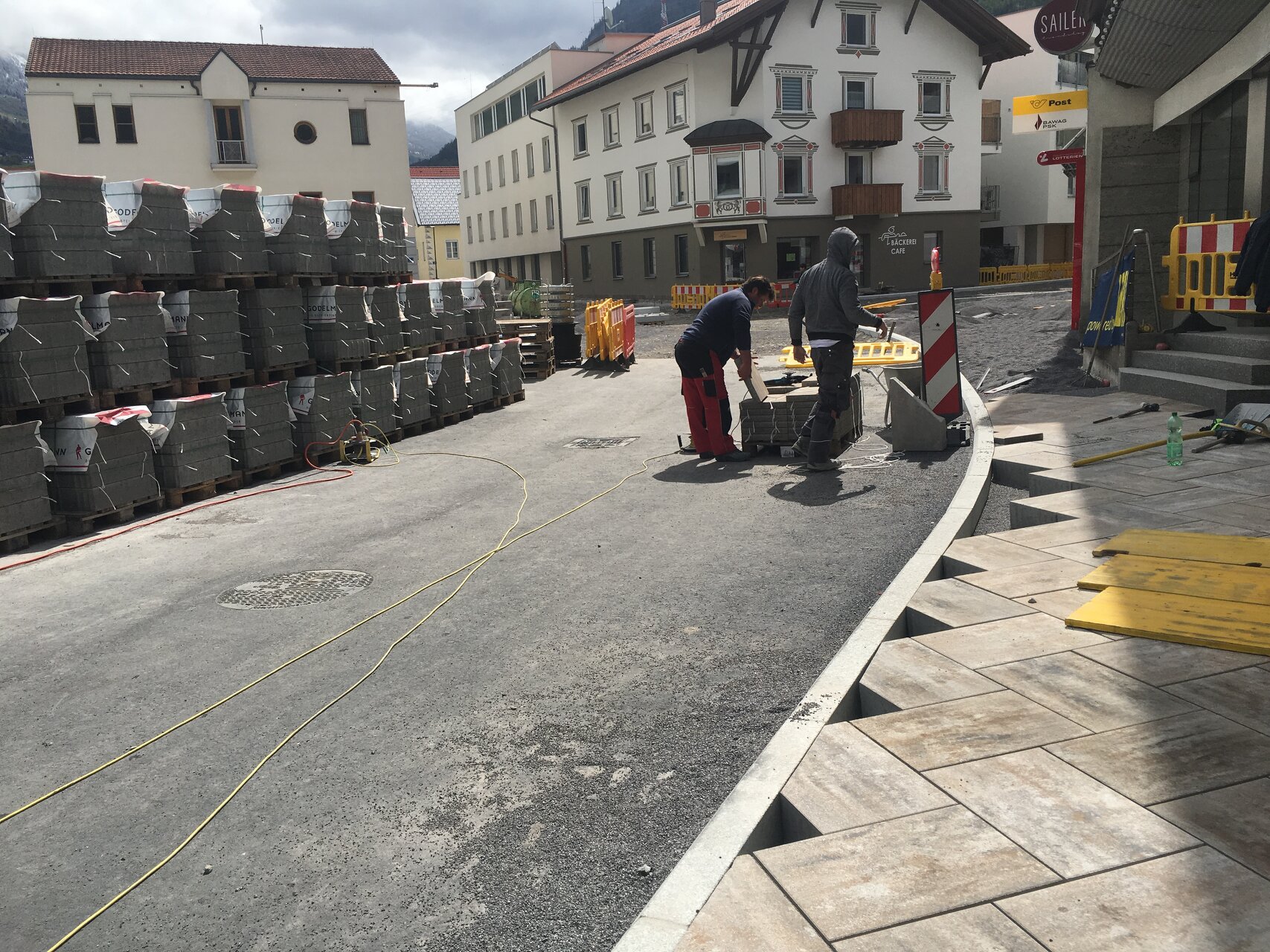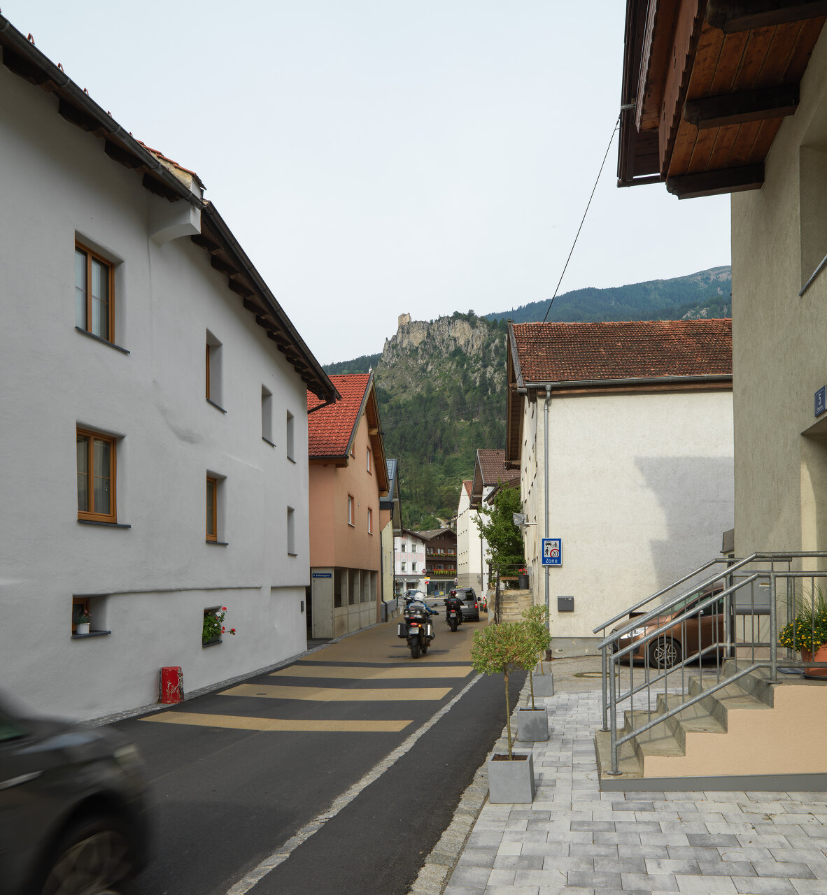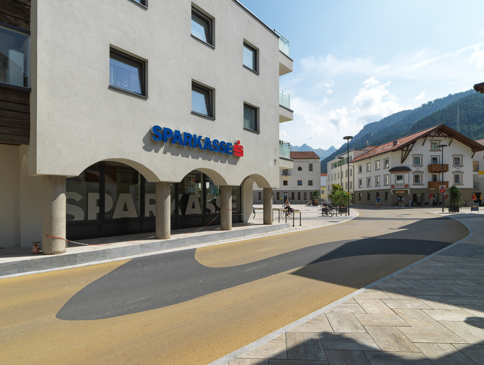 In enger Zusammenarbeit mit der Landesbaudirektion Tirol und dem Bezirksbauamt Landeck konnte in Prutz die erste Begegnungszone in Tirol entlang einer Landesstraße umgesetzt werden. Ebenfalls erstmals wurde ein Farbasphalt mit farbigem Gestein auf einer Landesstraße eingebracht. Für den Platz und die Gehbereiche wurde ein hochwertiger Pflasterstein aus Betonstein gewählt, an den sich der aus technischen Gründen notwendige Asphalt der Landesstraße nach dem ersten Winter farblich angleichen wird. (Claudia Wedekind, nach einem Text der Architektin)