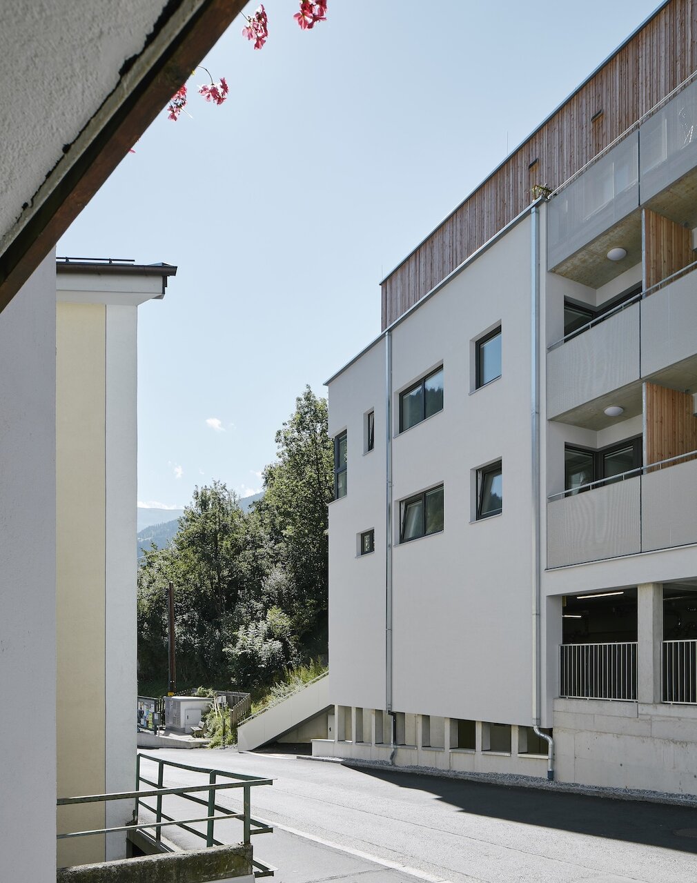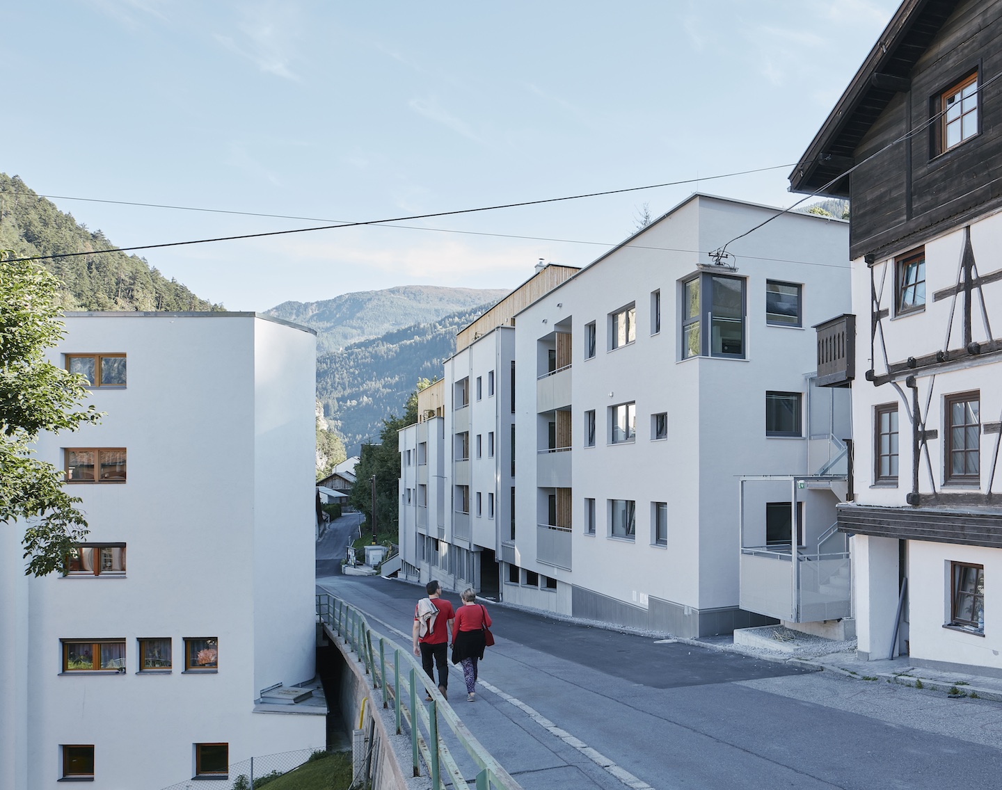 Das Haus wird umlaufend von öffentlichen Flächen umschlossen, die an besonderen Stellen auch Aufenthaltscharakter besitzen. Die Laubengänge, die parallel zum öffentlichen Weg verlaufen ermöglichen in jedem Geschoss kleine platzartige Situationen die eine soziale Funktion übernehmen können. Die Erdgeschosszonen geben sich zum öffentlichen Raum hin allseits offen und durchlässig. Die Fassade besteht zum Großteil aus einem Wärmedämmverbundsystem aus Steinwolle mit warmgrauem Rillenputz. In den oberen Etagen stellt die geschlossene Holzverschalung einen Bezug zu den ortstypischen Mischfassaden her. (Text: Architekt)