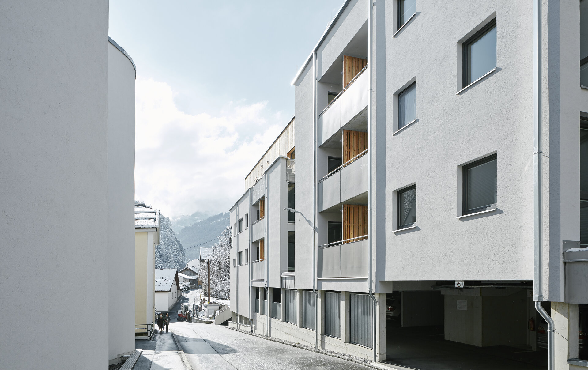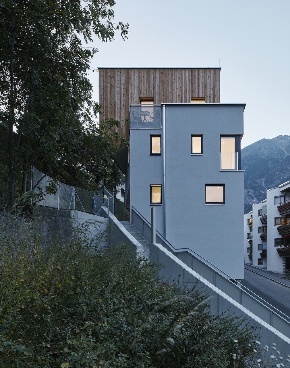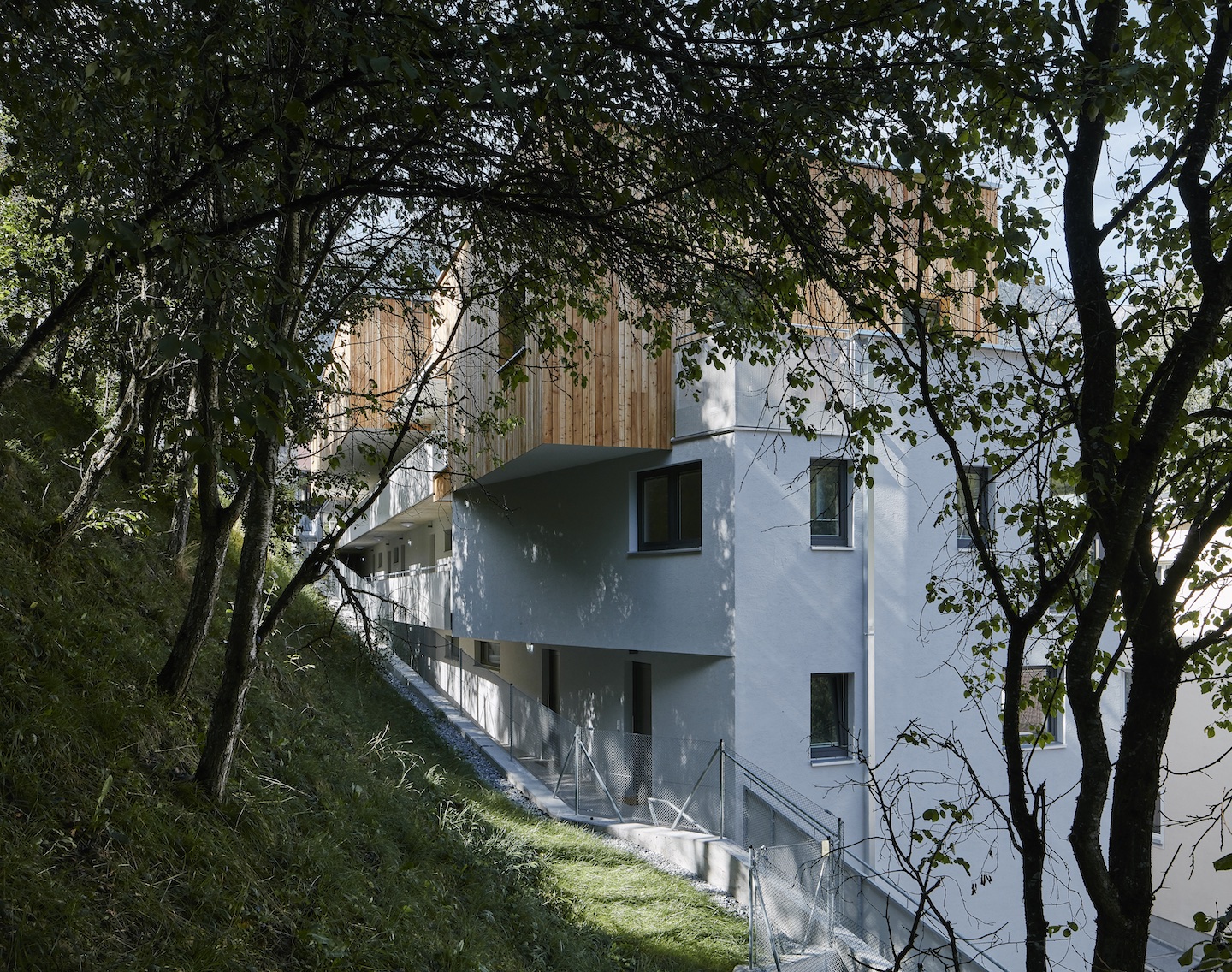 Die 60 m lange Laubengang-Zeile ist an der Straßenseite in drei rechteckige Baukörper gegliedert. Ein vierter Körper wird in den Fugen als zurückversetzte Holzstruktur sichtbar. Dieser erhebt sich über ein weiteres Geschoss nach oben und kragt teilweise über den öffentlichen Weg der an der Hangseite bergauf führt.