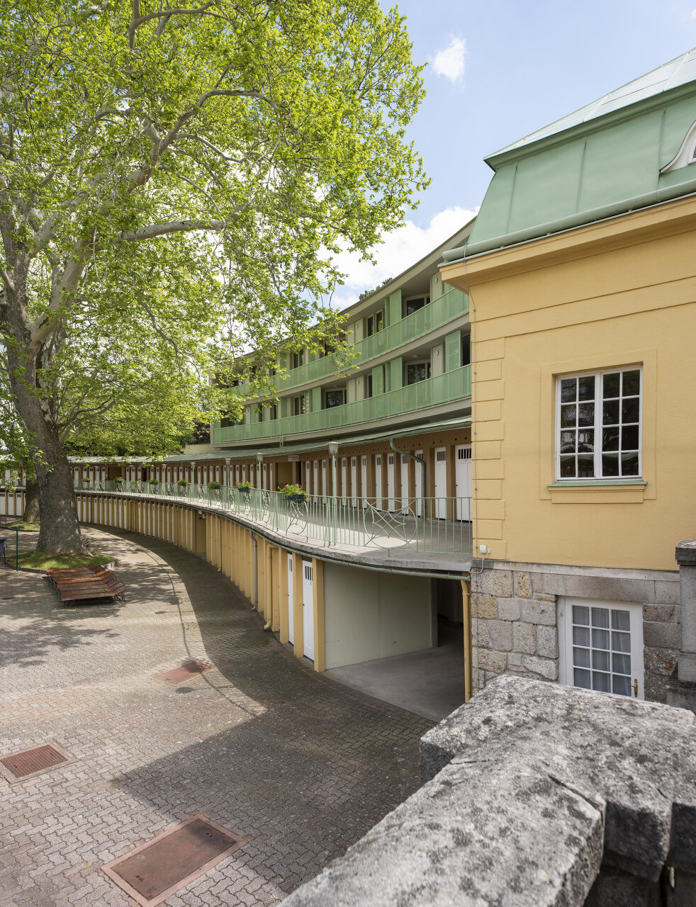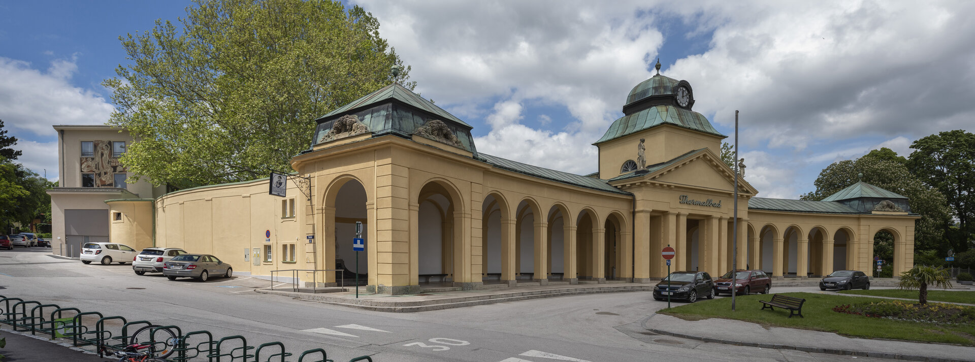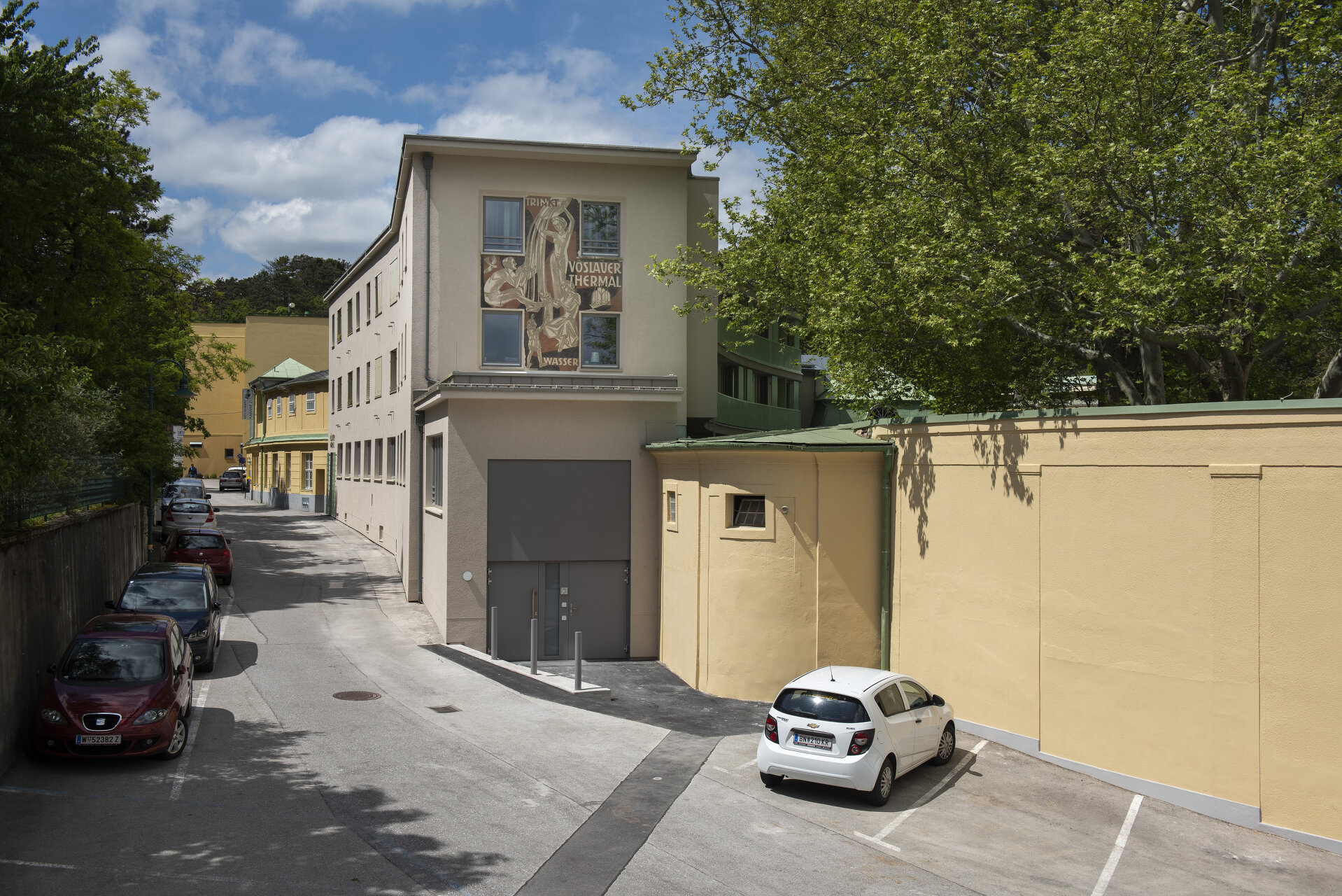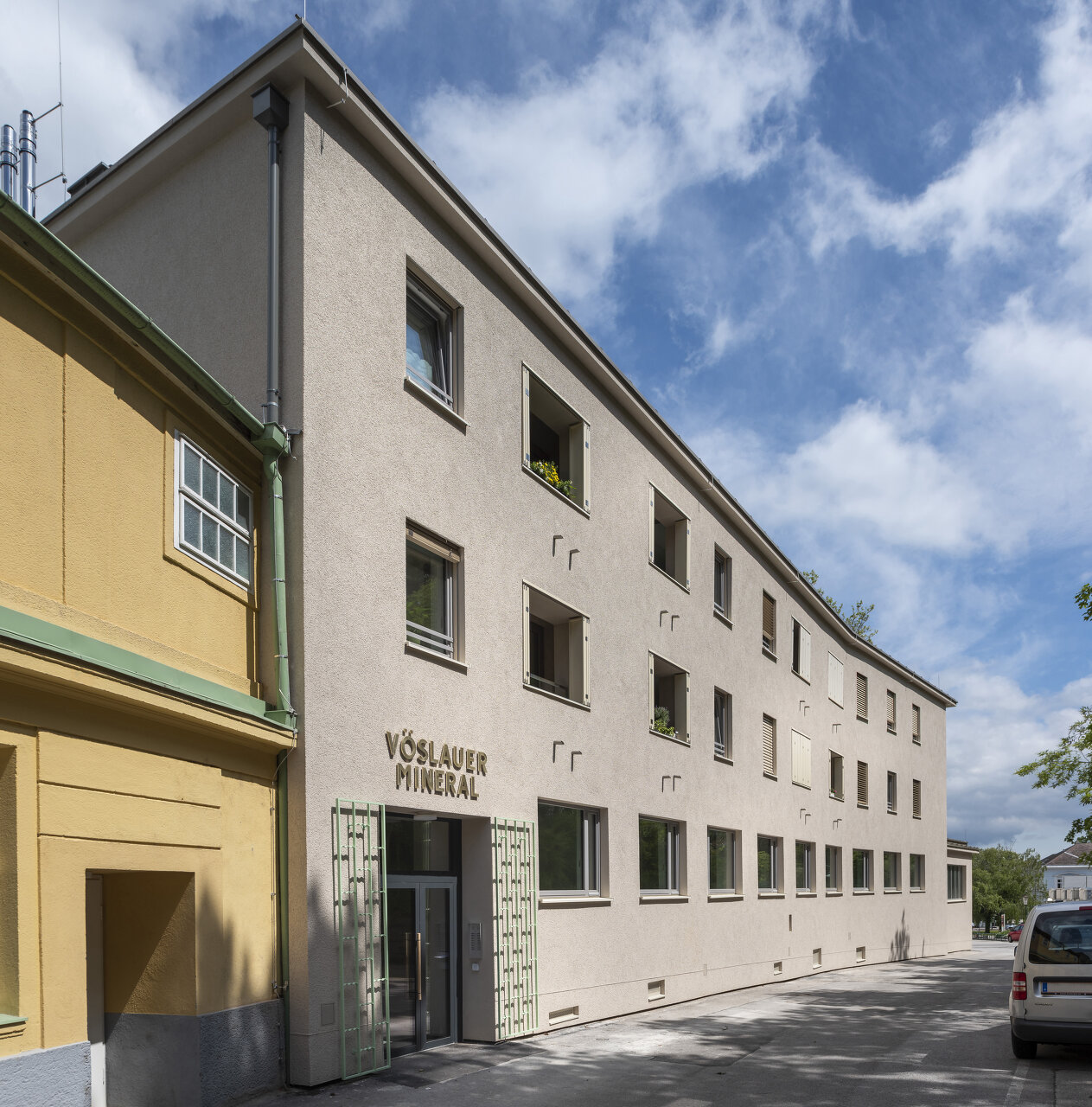 Der straßenseitige, dreigeschoßige Baukörper wurde umgestaltet. Um der Gesamtkonfiguration zu entsprechen wurden nordseitig die beiden oberen Geschoße an die bestehende, geschwungene Form der Thermalbadanlage angepasst. Im Erdgeschoß entstanden zeitgemäße Verwaltungsflächen mit Mehrzweckbereichen und einem Gymnastikraum. In den beiden Obergeschoßen wurde die Anlage um 16 Apartments erweitert, die mit einem direkten Zugang zum Thermalbad ausgestattet sind. Im Untergeschoß befinden sich nun Lager- und Abstellräume. Bei der Neugestaltung der „Vöslauer Mineral“ wurde das Augenmerk auf eine sensible Adaptierung des Gebäudes gelegt und dem Ensembleschutz Rechnung getragen.