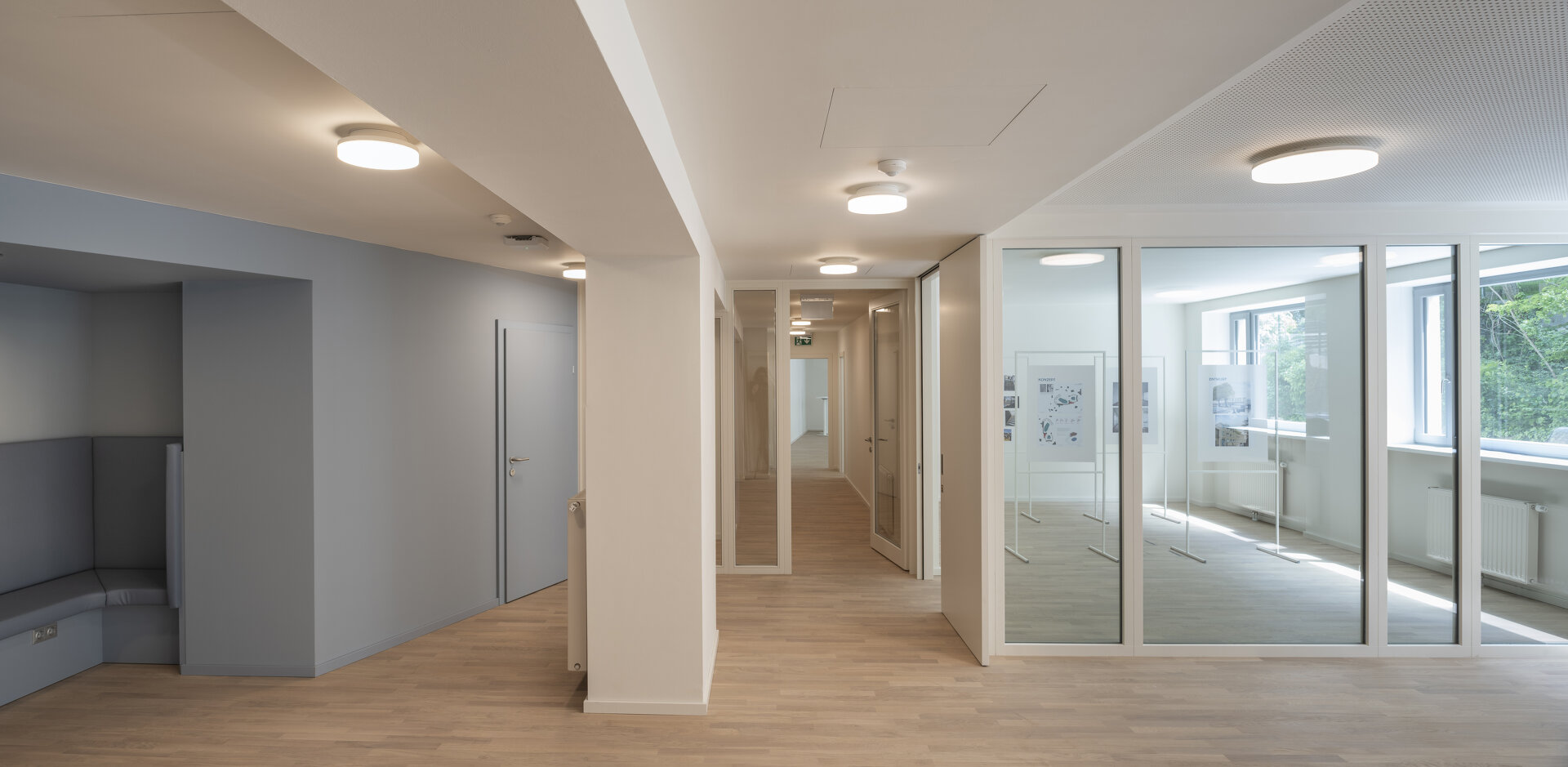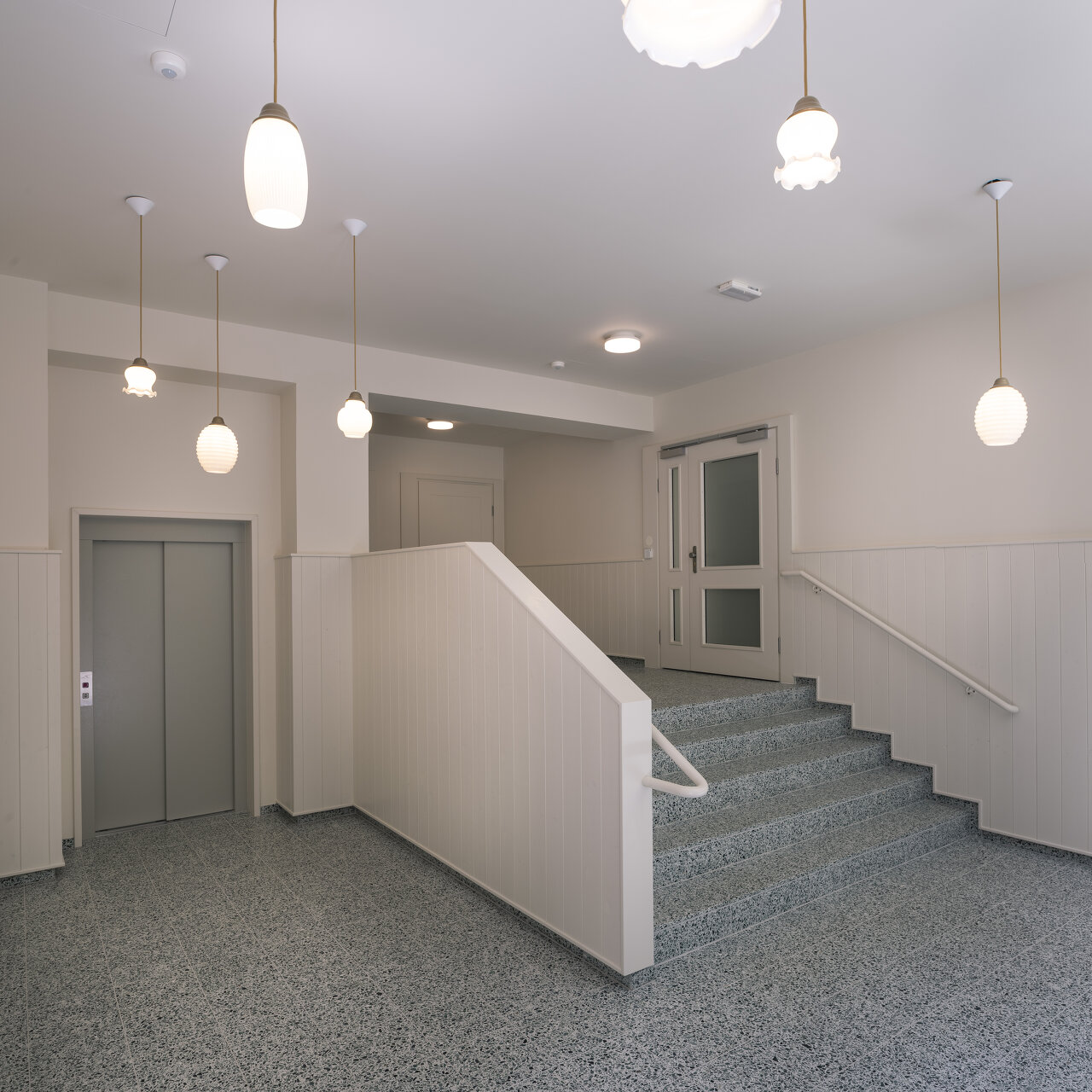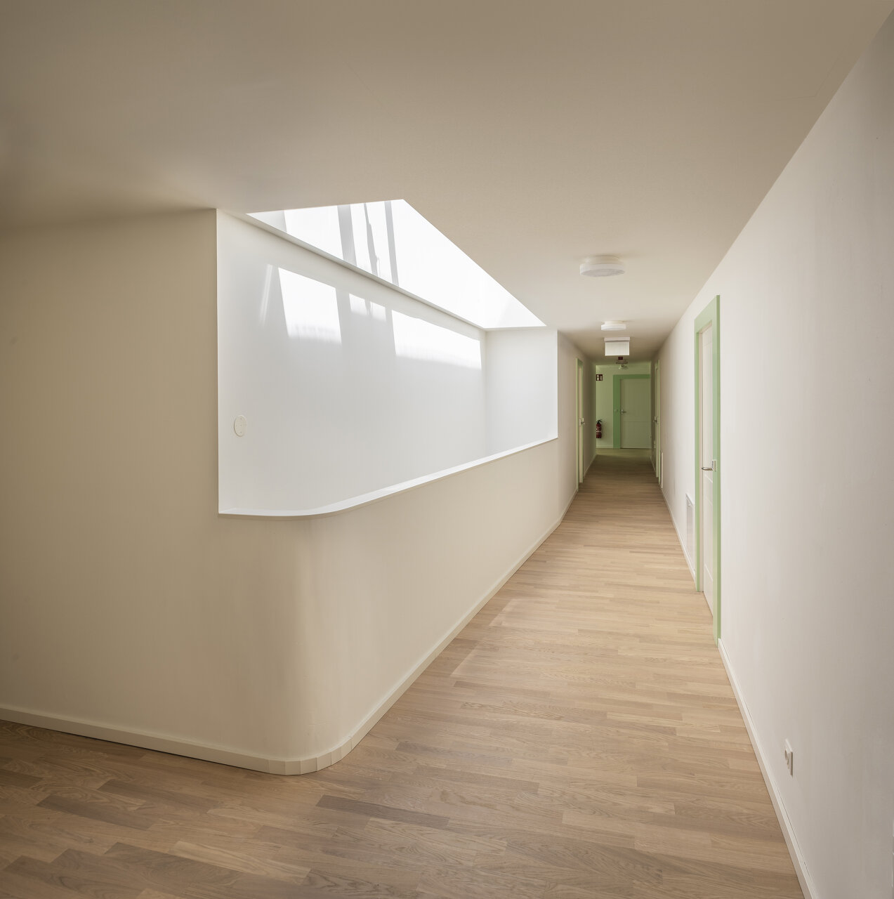 Die Lochfassade entlang der Maitalstraße blieb bestehen, die Fensteröffnungen sind wie im ursprünglichen Bestand linear und schlicht gehalten. Die eingeschnittenen, südseitigen Loggien erhalten außen fassadenbündige Faltläden zur Verschattung und Ergänzung des Fensterrasters.
